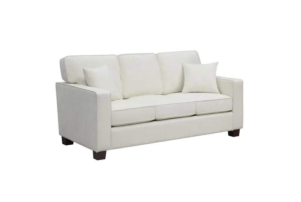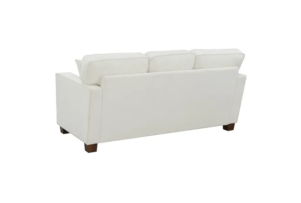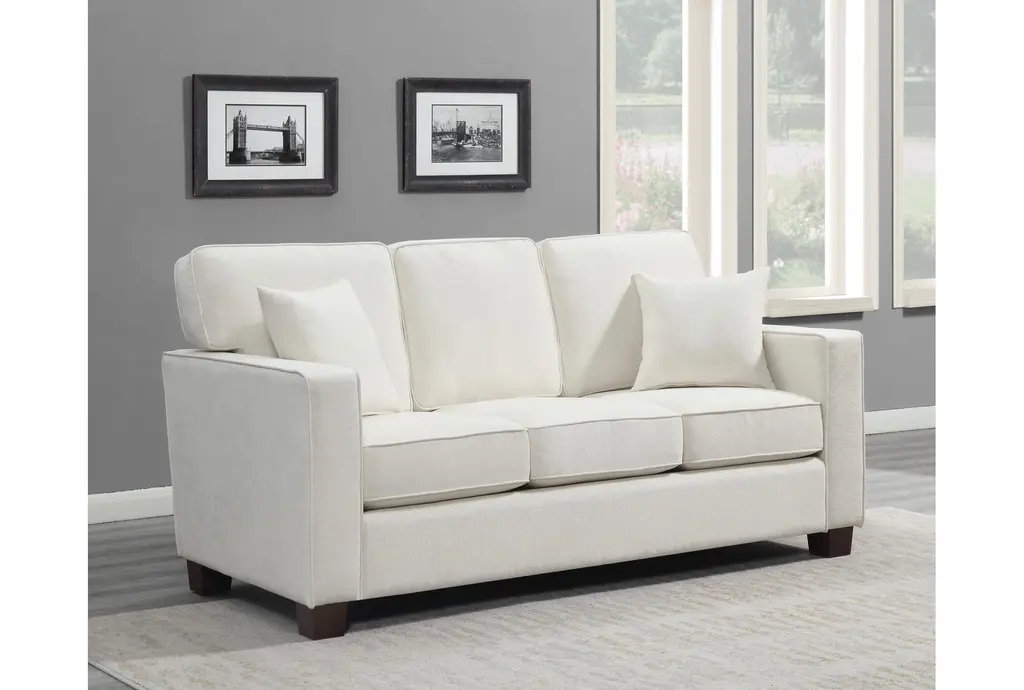 The Russell Ivory White Fabric Sofa combines modern style with casual comfort, making it a perfect addition to any living space. Upholstered in 100% polyester high-performance fabric, this sofa offers a firm seating experience with its coil spring reversible seat cushions and foam padded back cushions. The beautiful transitional style is highlighted by track arms and piping detail, ensuring both durability and elegance.