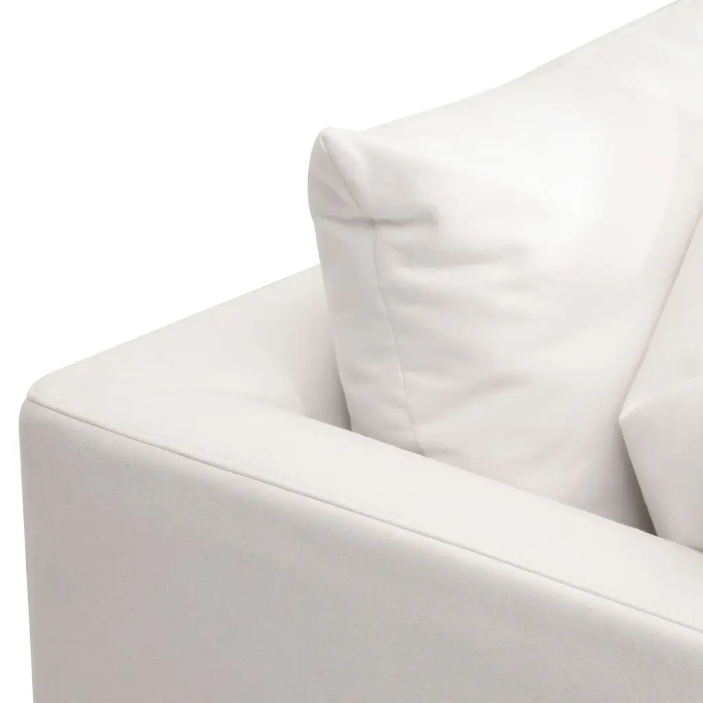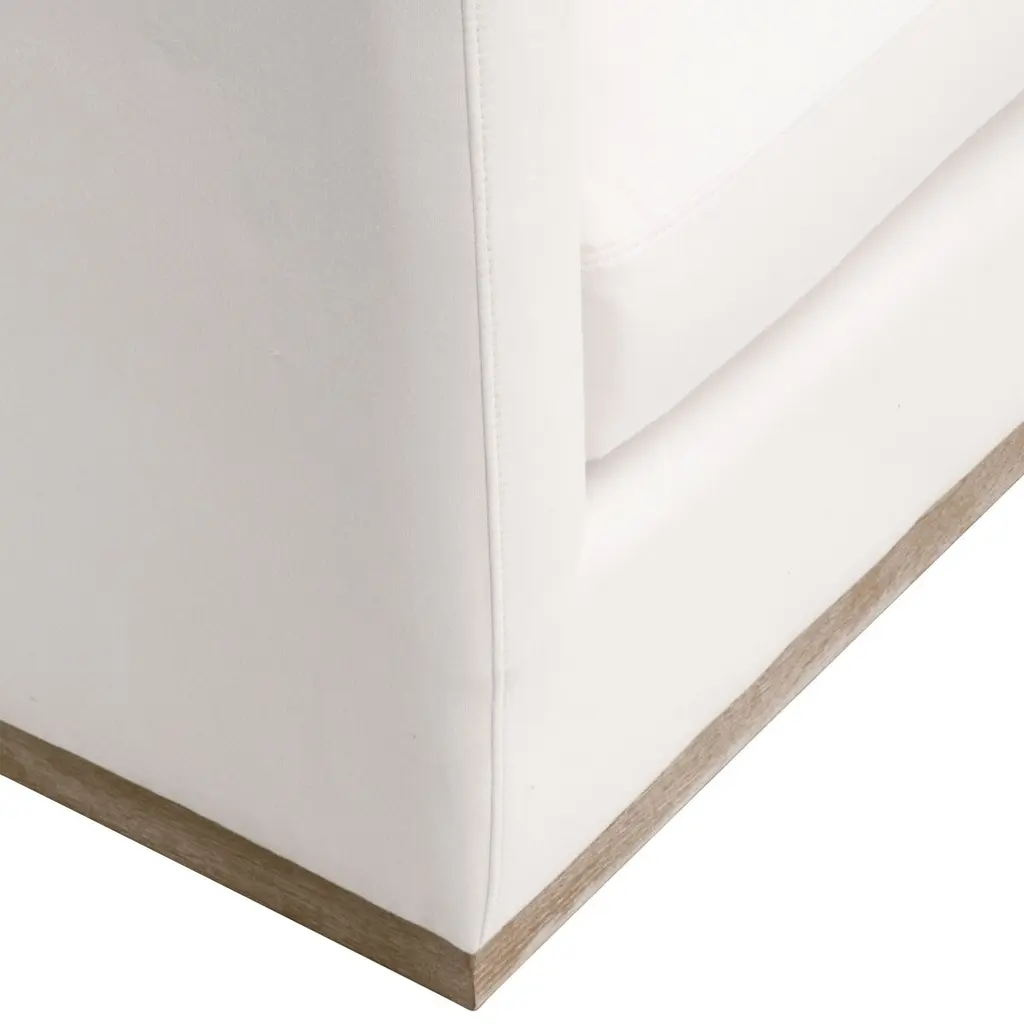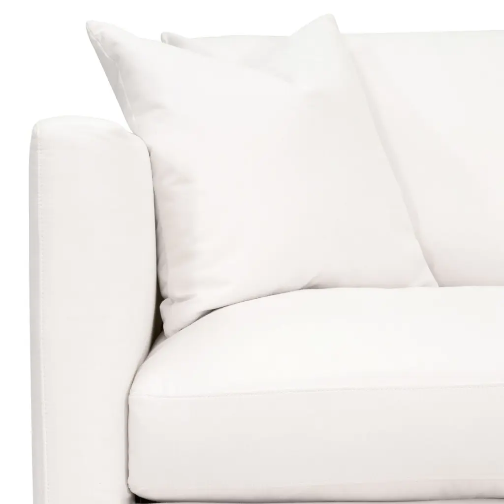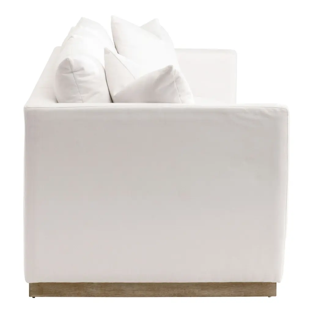 The exposed wood plinth brings an organic warmth to this clean-lined sofa. Because it's upholstered in durable stain-resistant fabric, it's suitable for households with kids or pets. Eight-way hand-tied suspension support and cushions filled with foam and down ensure long-lasting comfort. The seat cushions have ties to prevent shifting, and the sofa comes with two square throw pillows filled with plush feathers and down.