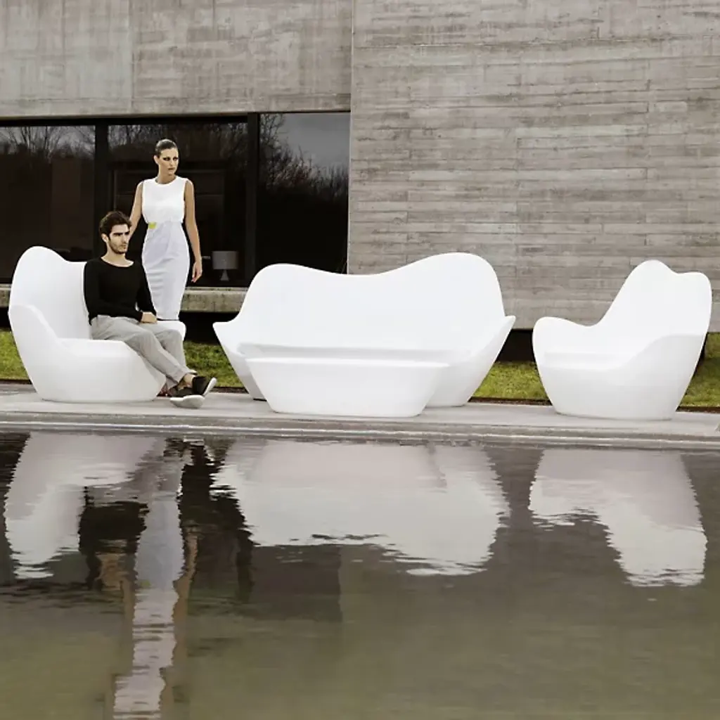 The Sabinas Sofa by Vondom is a creation from multidisciplinary designer Javier Mariscal. Inspired by natural fluid shapes, this sofa avoids any straight lines or structured geometry for a cool, captivating look. Made using polyethylene resin and rotational molding, this expressive design is suitable both indoors and out, bringing both fun and functionality to spaces. Its silhouette hints at sand dunes and curves, while a playful color palette allows the seat to visually divide its form.