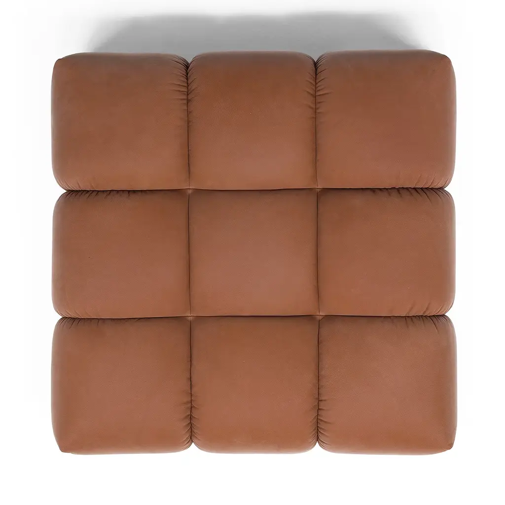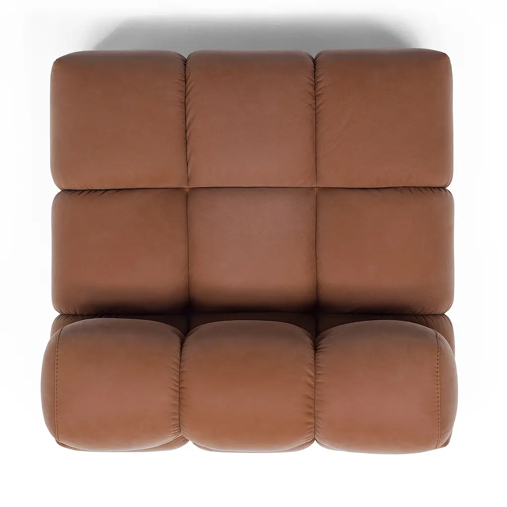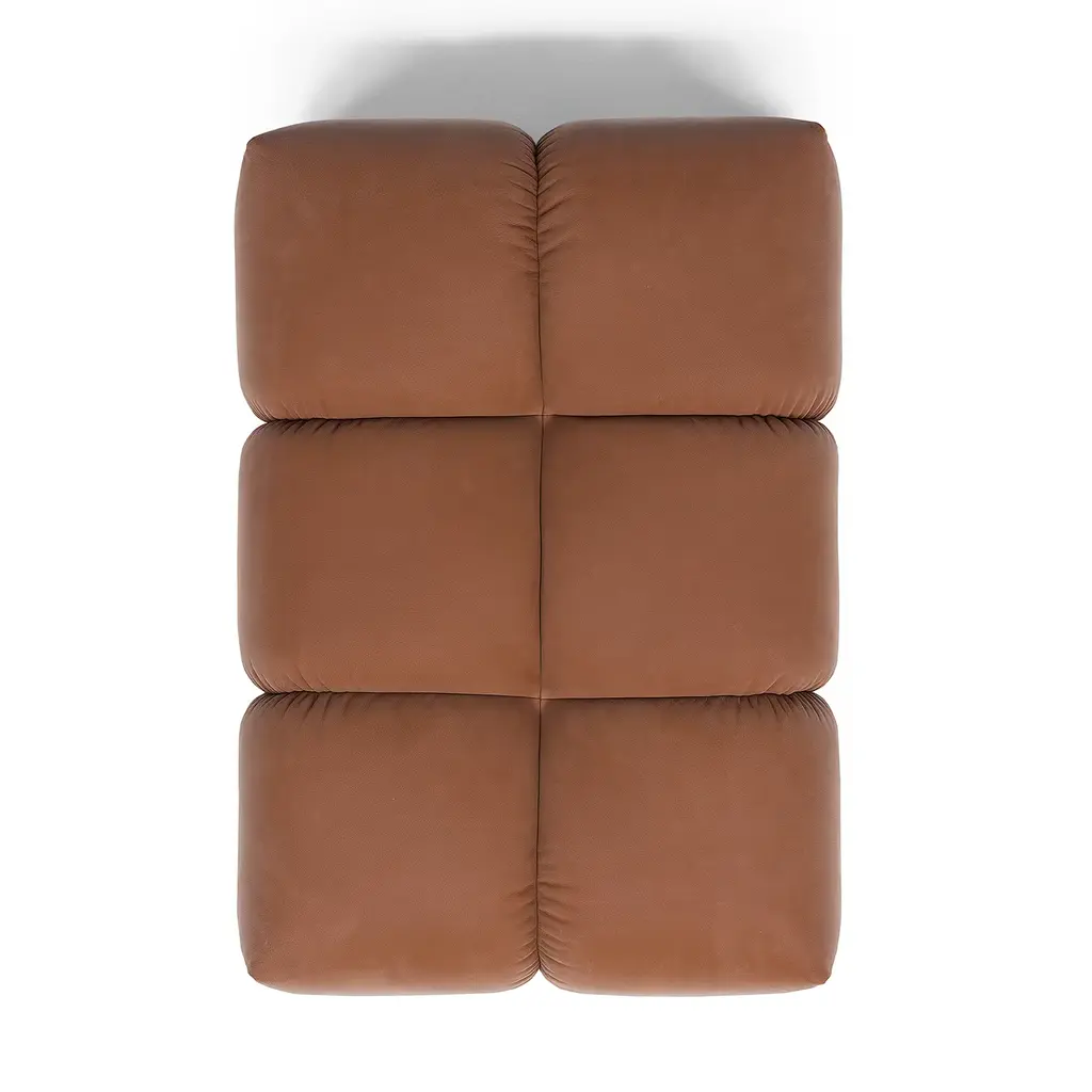 An island with a pop personality, this modular sofa stands out for its extraordinary plump look enhanced by a deft checkered design. The generous padding in memory foam ensures long-lasting comfort, sealed by prized upholstery in brown leather. The wooden base comes upholstered for variants with fabric cover, but other customization options can be explored by contacting the Concierge.