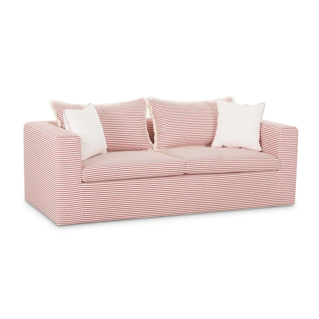 Meet the Salty Striped Outdoor Sofa, bringing a burst of sassy and fun elements to your outdoor haven with chic color options in coral and blue. Complete with contrasting accent pillows, this sofa effortlessly combines comfort and style. Embrace a South of France aesthetic as you lounge in the open air. This outdoor-safe sofa is your ticket to an effortlessly chic al fresco experience.