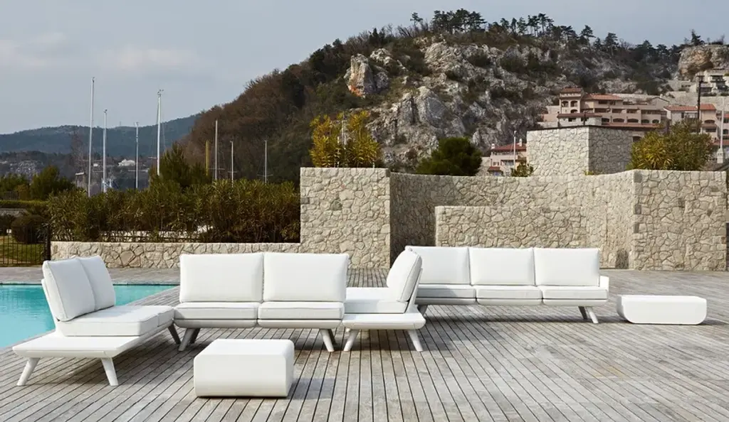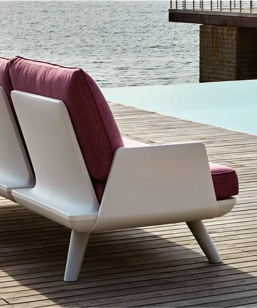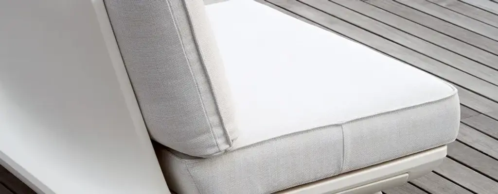 2 seater fabric garden sofa.SAMURAI is a modular outdoor sofa with clean and essential lines. Inspired by the western interpretation of the Tatami, the PLUSLINE version is characterised by a wide and low draining seat which makes it visually not bulky. In the BASELINE version the removable paddings are upholstered with idrorepellente SUMBRELLA fabric. On request, available custom size covering, depending of given position.