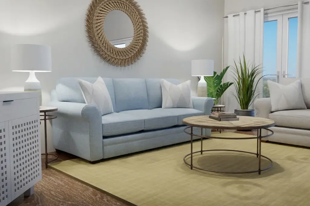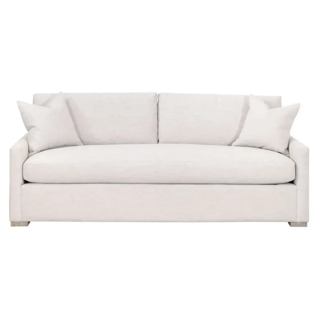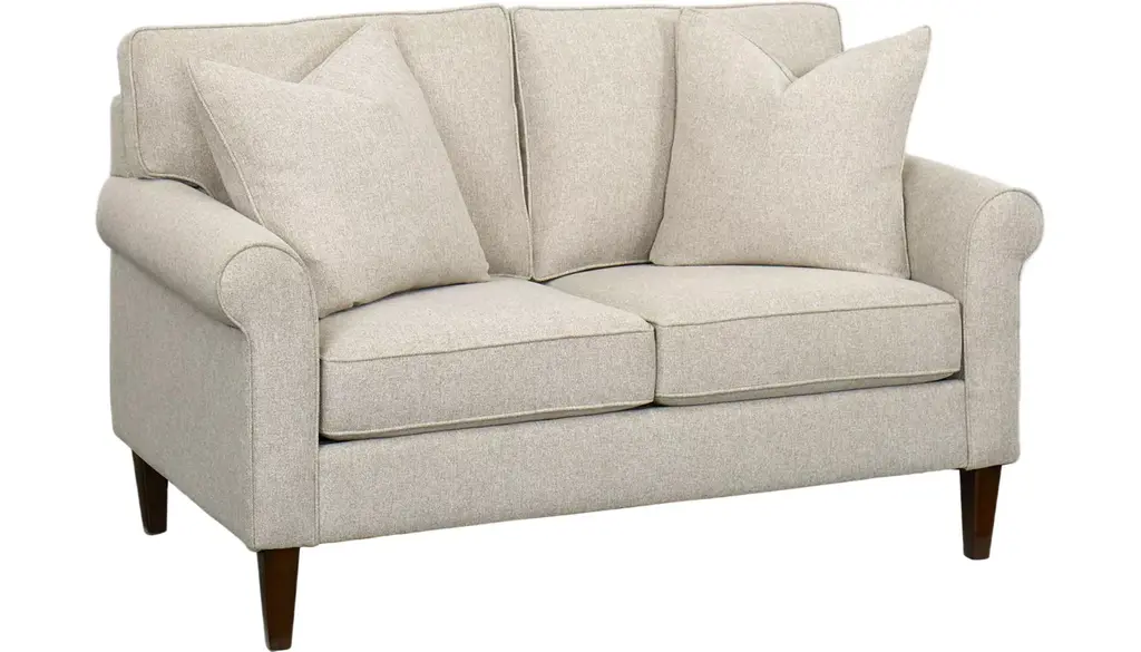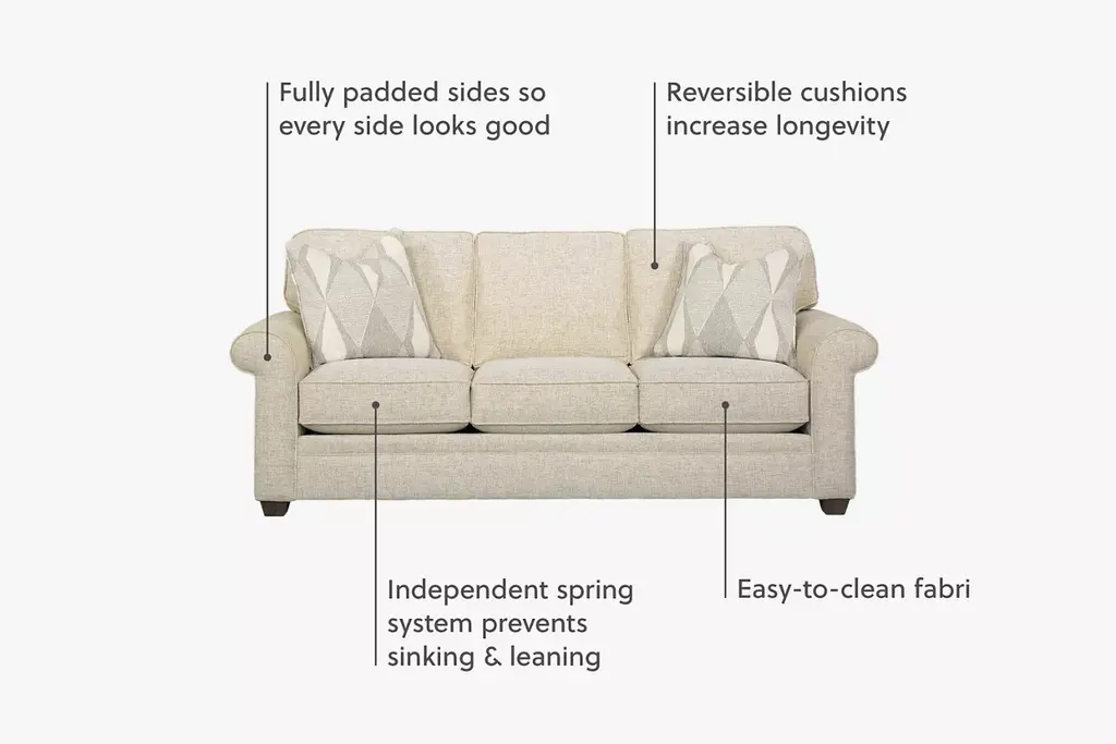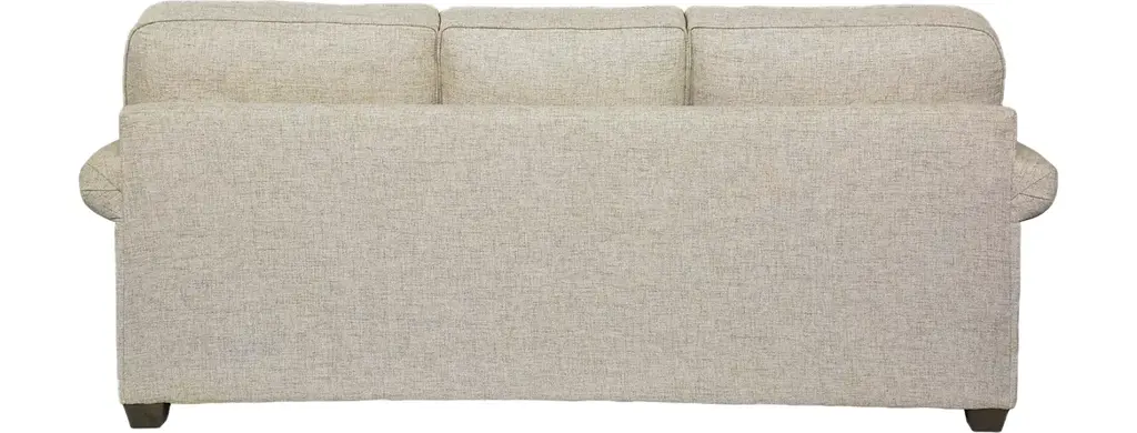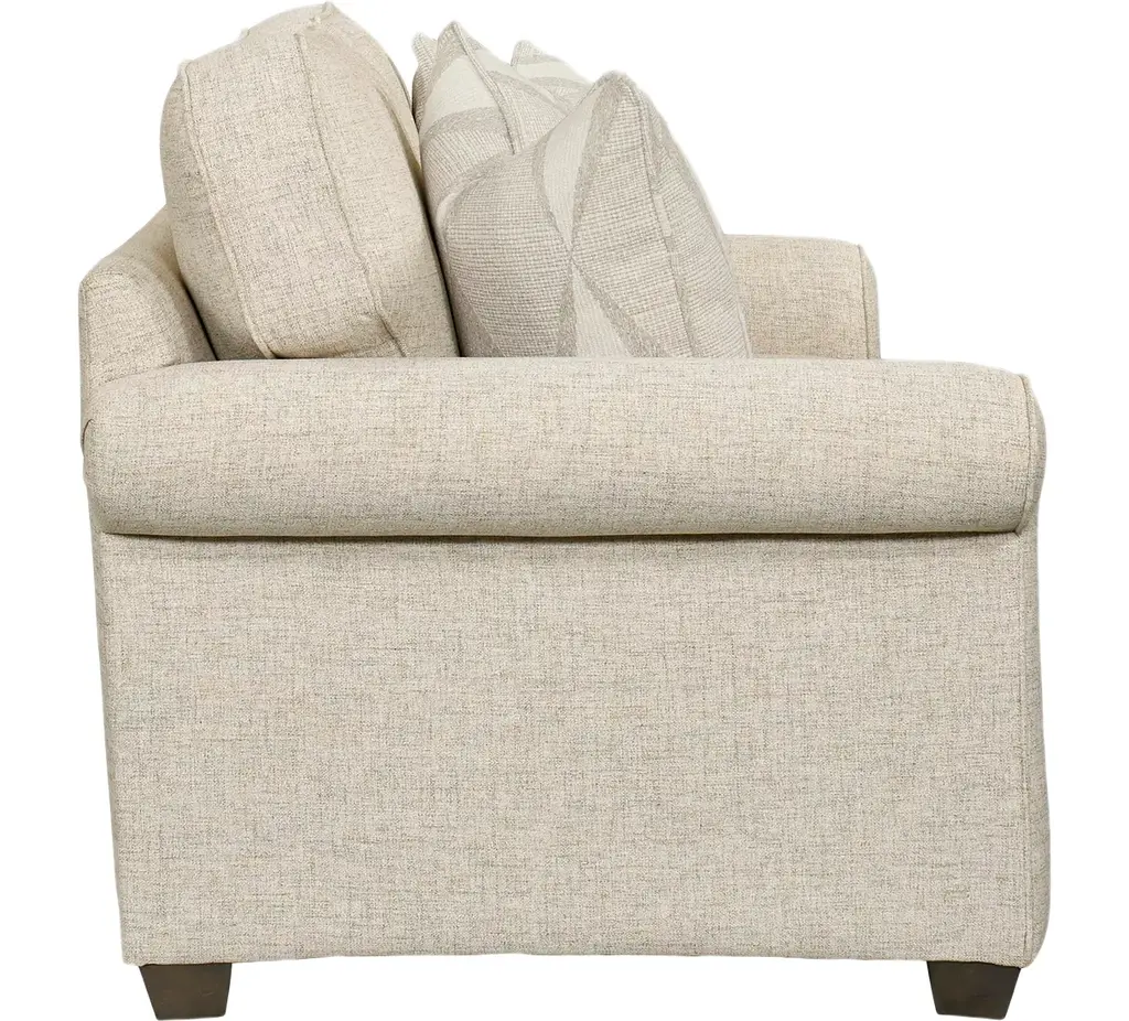 Sink into our Sandy sofa for an upgraded relaxation experience. This piece features padded arms, 1.8-density foam seat cushioning and independent seating. Feather-filled toss pillows are complemented by rolled arms, a banded base and brown-finished feet.