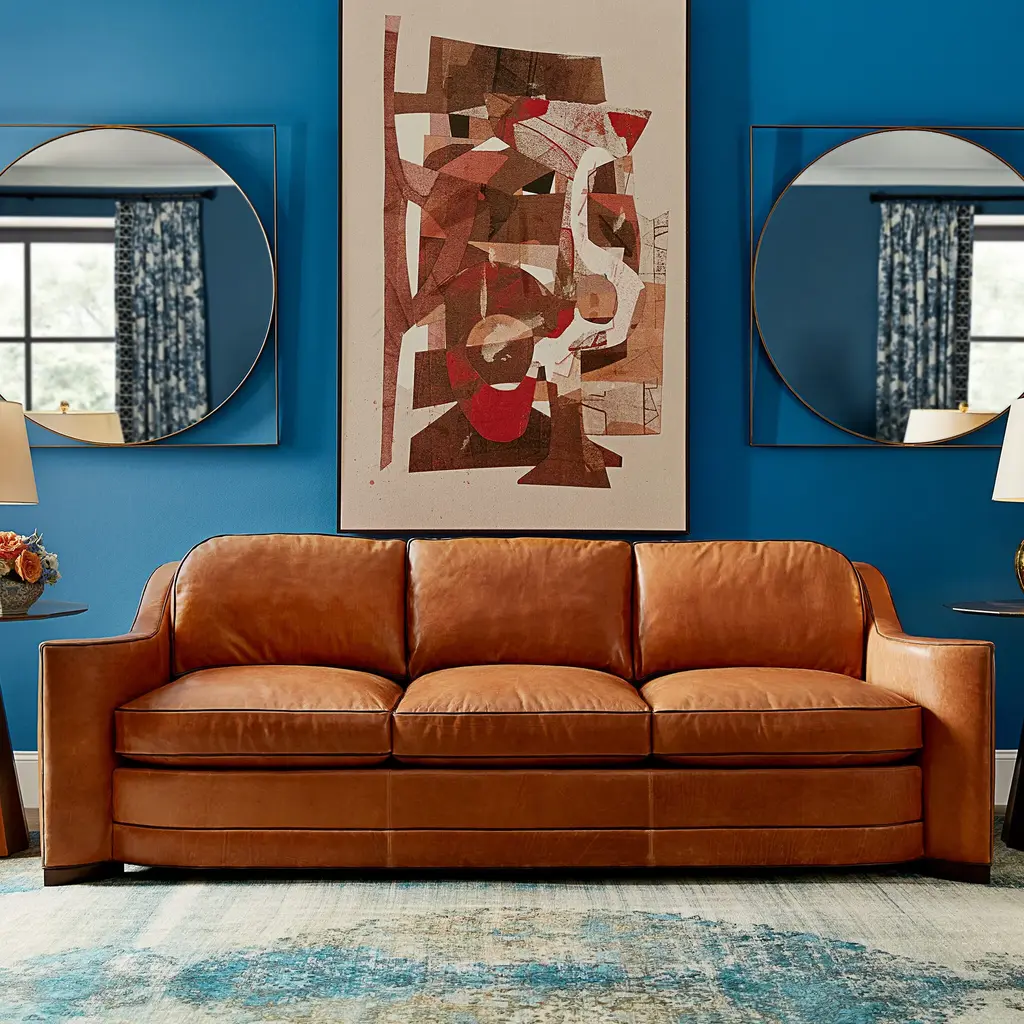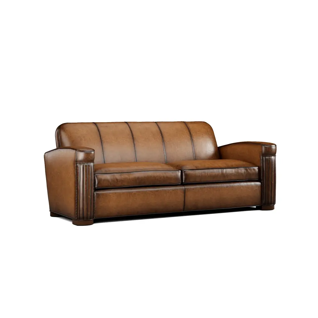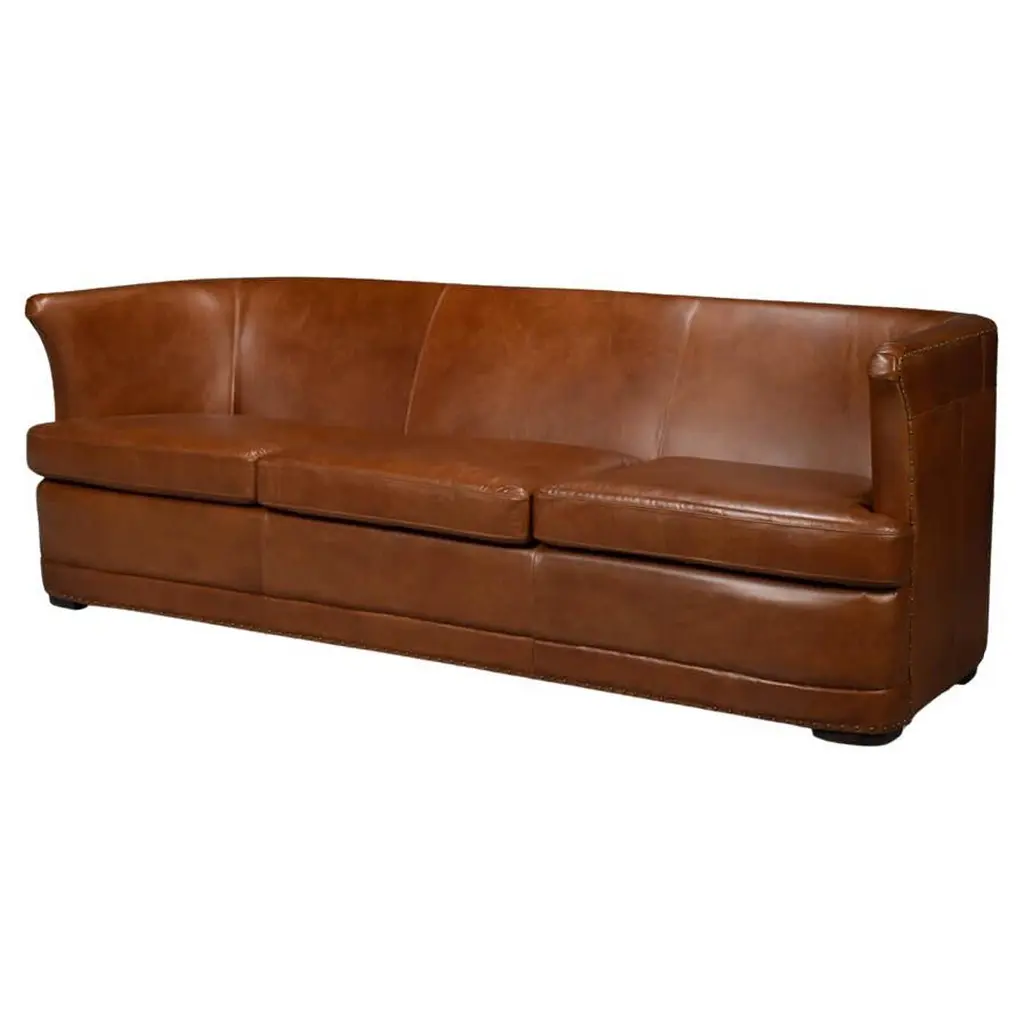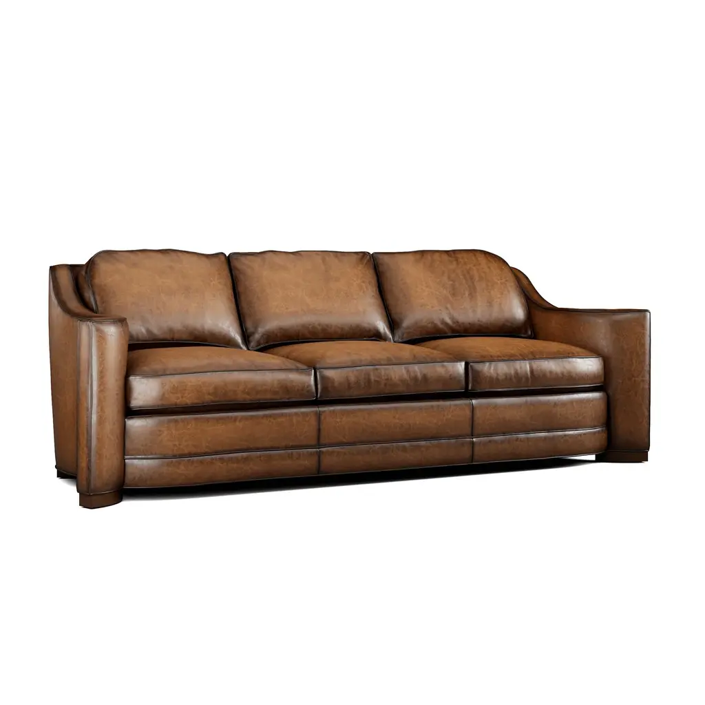 The Santiago Sofa is a masterpiece of high design and lasting comfort. Masterfully hand-crafted in North Carolina, this leather sofa draws inspiration from a 1970s Italian Art Deco design, boasting a truly iconic silhouette. Its unique blend of elegance and modern aesthetics makes it a standout piece in any living space. Perfect as a living room sofa, the Santiago Sofa offers luxurious seating and a timeless appeal. Ships In 8-10 Weeks Three loose back pillows Three loose seat cushions As Shown Fabric: Dakota Tobacco with Gourmet Metal Contrast Welt (lifestyle) As Shown Finish: Antique Walnut This product can be special ordered in additional leathers, finishes, and cushion fillings. Click here to email us for for additional information about special ordering.This image is for illustrative purposes only. The colors shown are accurate within the constraints of lighting, photography, and the color accuracy of your screen.Leather is an imperfect product with shade variations a very real possibility. Lillian August will not be held responsible for matching any colors to your existing decor, or any shade variances inherent with all leather products.