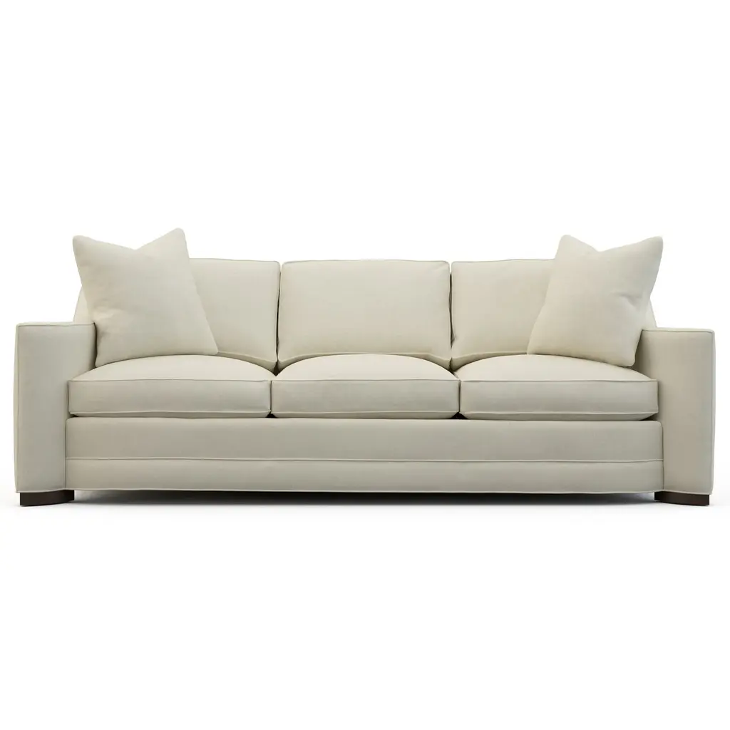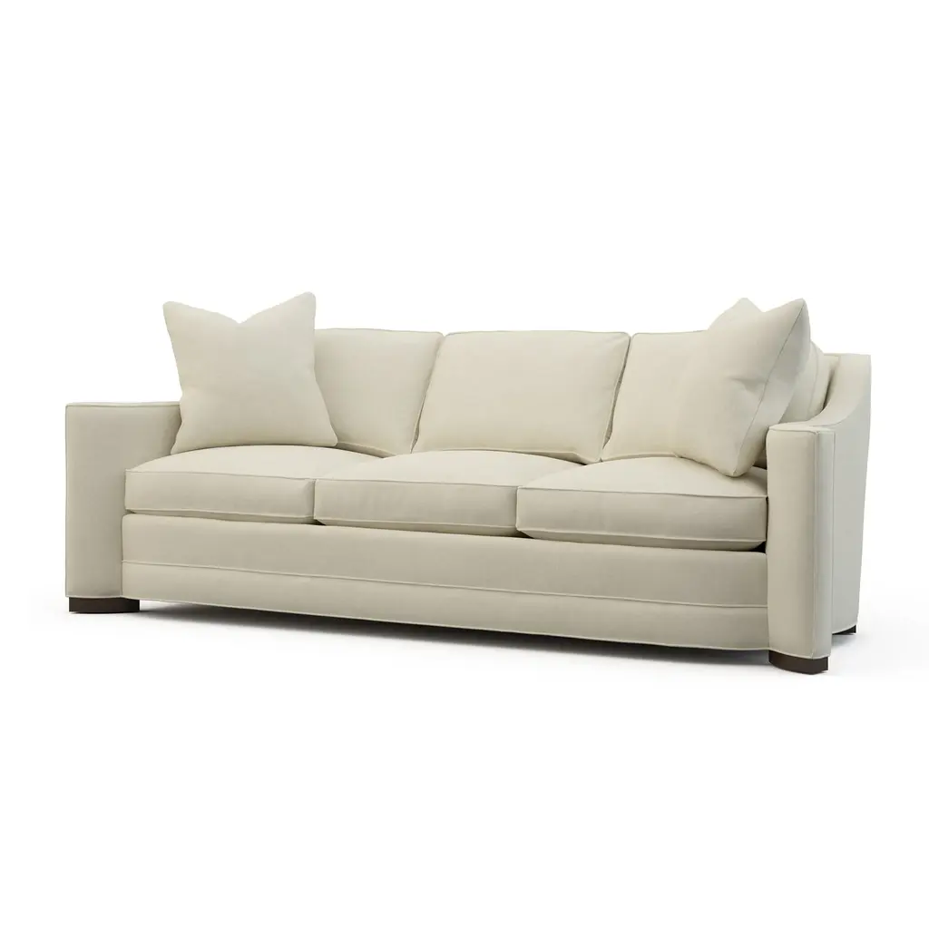 Hand-crafted in North Carolina, the Santiago Sofa is a masterful homage to 1970's Italian Art Deco design. This iconic piece blends high design with enduring comfort, offering a truly unique silhouette that captivates in any living room. Crafted from leather, it exudes modern luxury, making it a standout choice for those seeking a modern leather sofa. Ships In 8-10 Weeks Three loose back pillows Three loose seat cushions As Shown Fabric: Rayburn Oatmeal As Shown Finish: Antique Walnut If you choose to purchase COM, once you have placed your order a customer service rep will contact you regarding where to send your fabric. Please note that current lead time is 17-19 weeks once your fabric arrives at the factory, and if unused fabric is under 1.5 yards, it cannot be sent back to you.This product can be special ordered in additional fabrics, leathers, finishes, and cushion fillings. Click here to email us for for additional information about special ordering.This image is for illustrative purposes only. The colors shown are accurate within the constraints of lighting, photography, and the color accuracy of your screen.