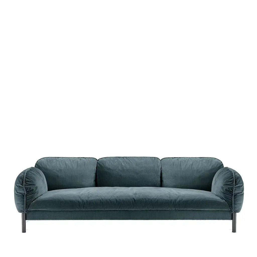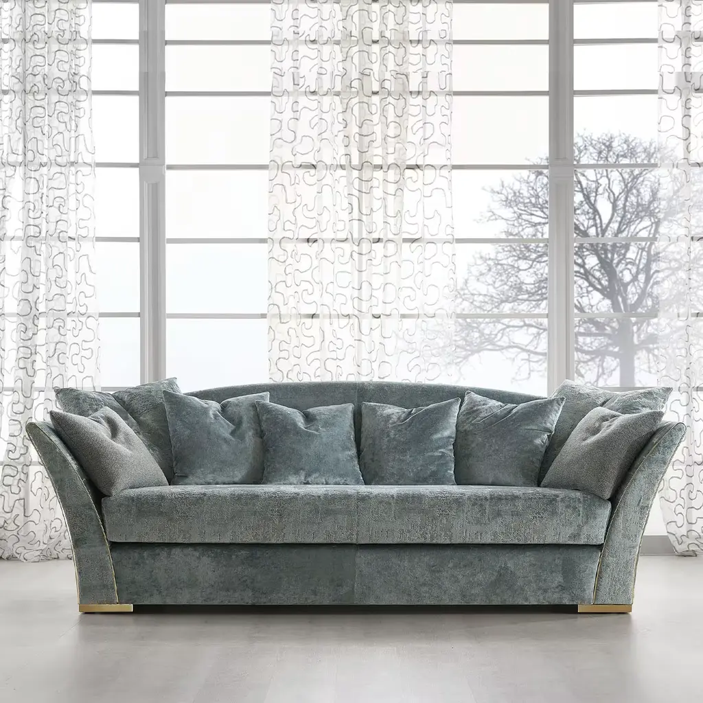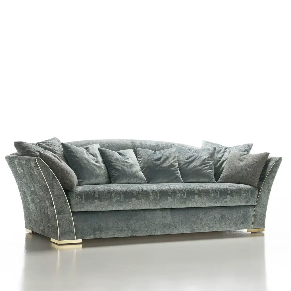 Sides curving outwards accented by metal profiles speak to this sofa's quiet dynamism and modern sophistication. Preciously upholstered in velvet in a refined sage-green hue for a superb tactile experience, the sofa distills a sense of harmony that is further confirmed by the presence of coordinated loose cushions. A rich inner polyurethane padding ensures impeccable comfort.