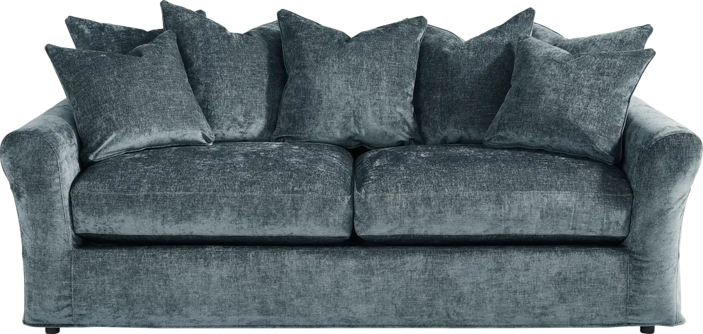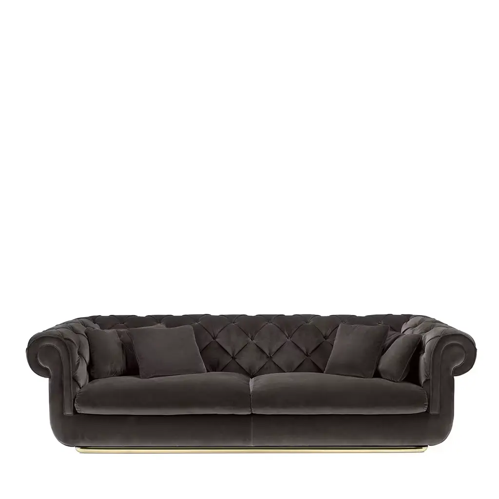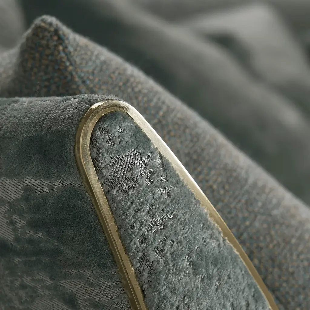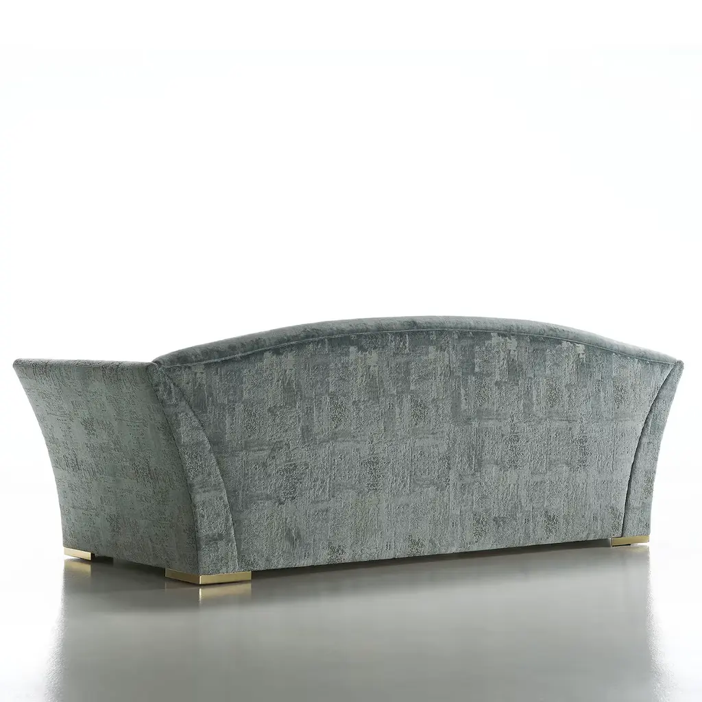 Sides curving outwards accented by metal profiles speak to this sofa's quiet dynamism and modern sophistication. Preciously upholstered in velvet in a refined sage-green hue for a superb tactile experience, the sofa distills a sense of harmony that is further confirmed by the presence of coordinated loose cushions. A rich inner polyurethane padding ensures impeccable comfort.