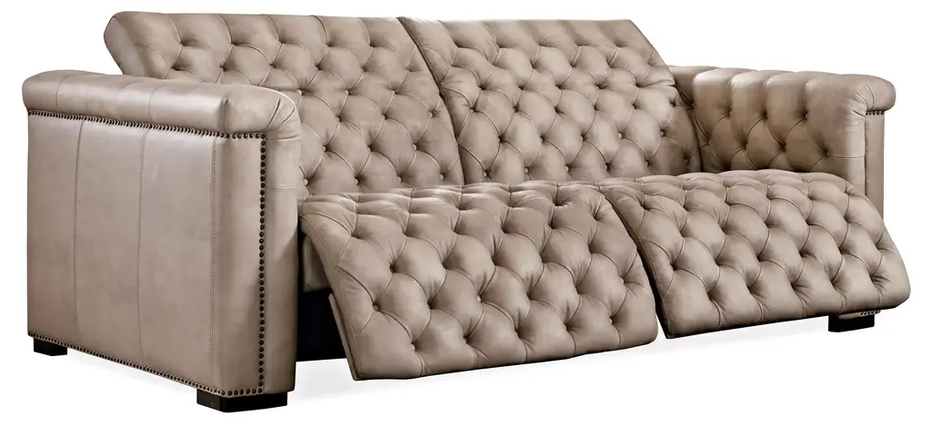 Inspire awe with your family and friends, who will never believe a sofa as stunning as the Savion has two power recliners, and that each of the 2 seats features an adjustable headrest. The individually operated headrests invite you to lean back and relax your upper body while watching TV, reading or conversing, and the seating units transform to recliners with a smooth power control button, offering exceptional comfort. Savion blends classic elegance with modern flair, combining traditional button-tufted tailoring with a sleek profile back. The hand-wiped l Giovanni Taupe leather cover is finished for stain protection and is hand wiped, offering authenticity and sophisticated appeal.