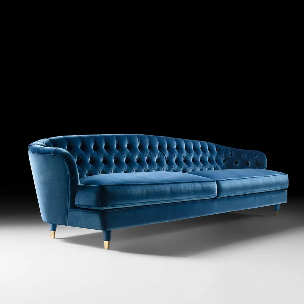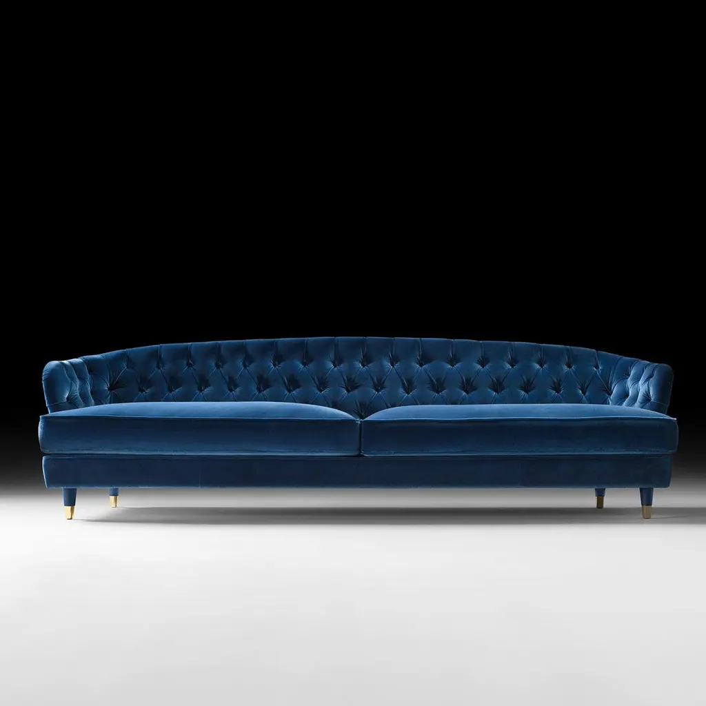 This superb sofa boasts a gleaming and strong personality in its intense blue color and soft velvet upholstery. The structure is made of solid wood and boasts an elastic belt spring system. The padding is divided in two separate levels for a higher comfort: 100% European goose feathers and 10% down enriched with multi-density, highly-resistant polyurethane and memory foam. Only the seat cover is removable and features a tufted back in the leather version. The metal feet boast a polished brass finish.