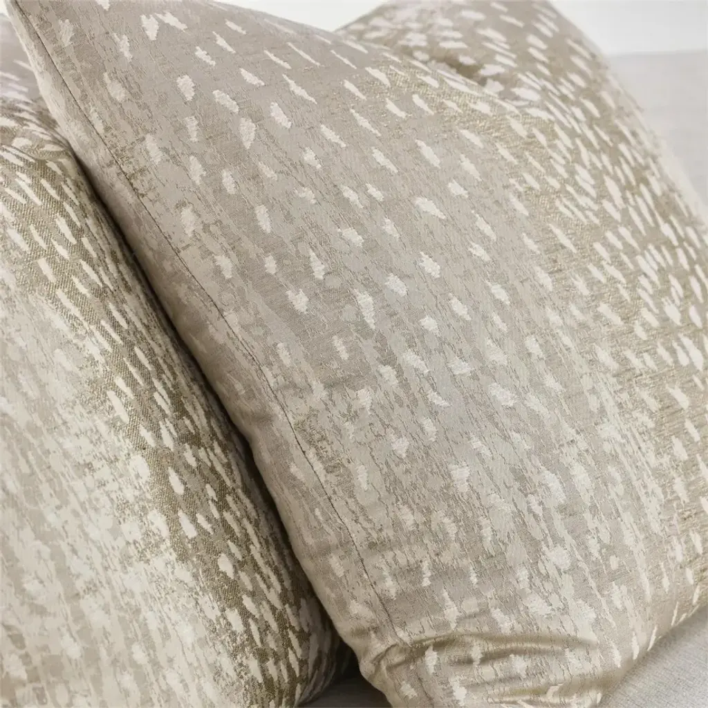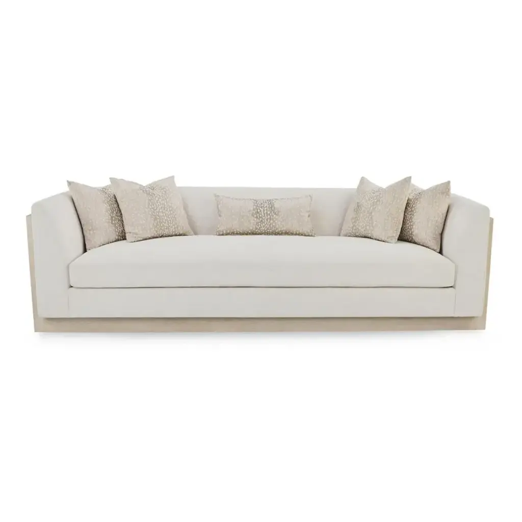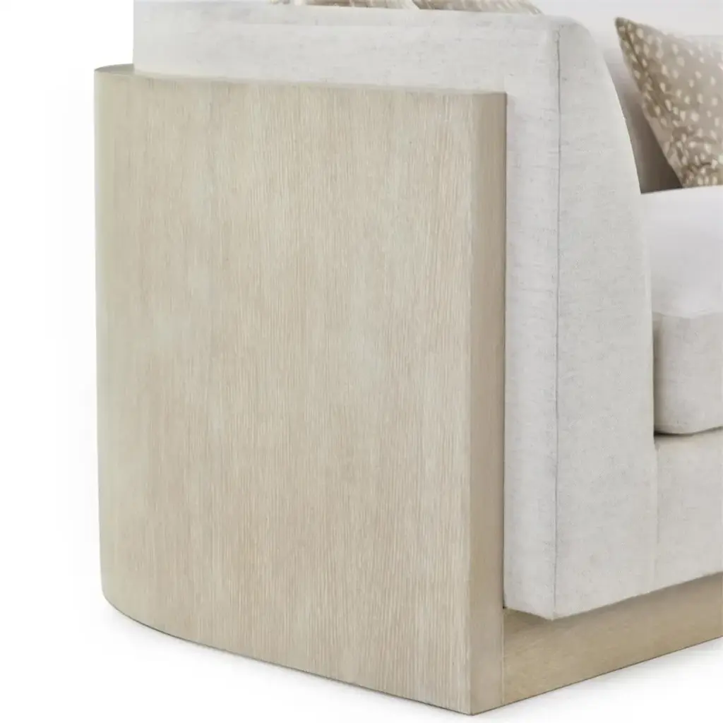 The Savoy Sofa is an elegant centerpiece upholstered in a beautiful Nomad Snow 1109 fabric, wrapped around a frame of acacia and oak woods in a White Washed Oak finish. The sofa features five throw pillows in Doe a Dee Taupe 2236, complementing the refined color palette to complete the look.