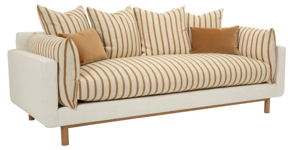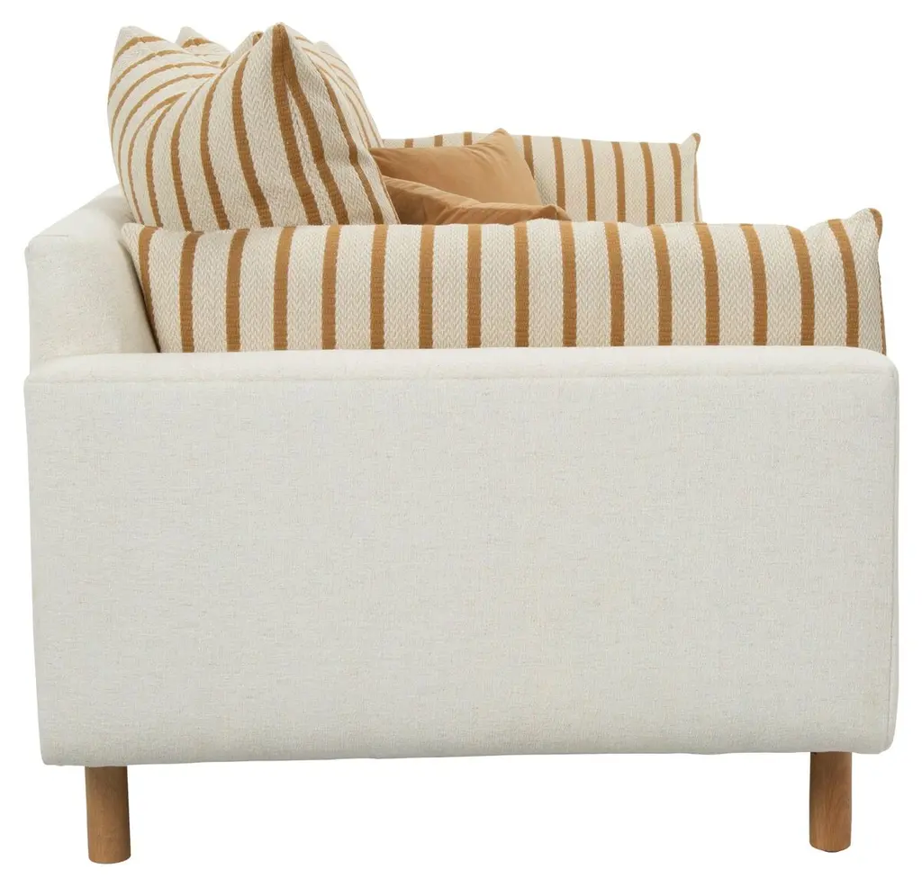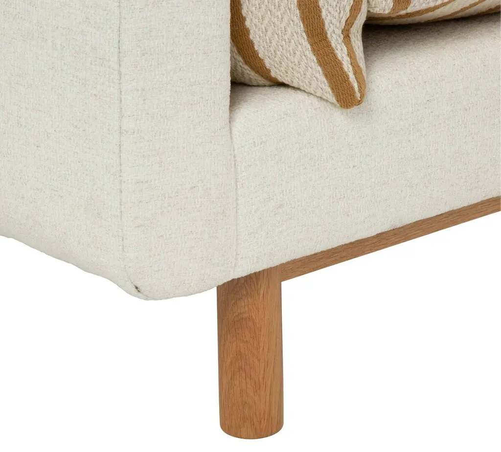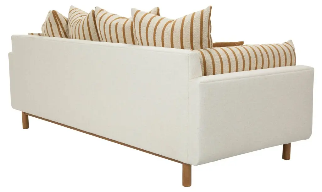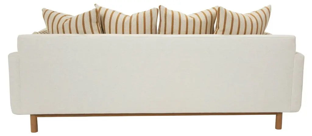 Available online exclusively at One Kings Lane: Relaxed and refined, this midcentury-inspired sofa is framed in hardwood with an exposed base and round feet. Outfitted with a variety of cushions, this sofa is upholstered in high-performance fabric that repels stains, spills, bacteria, and mold and filled with foam, fiber, feathers, and down for outstanding durability and comfort. Handcrafted in Southern California.