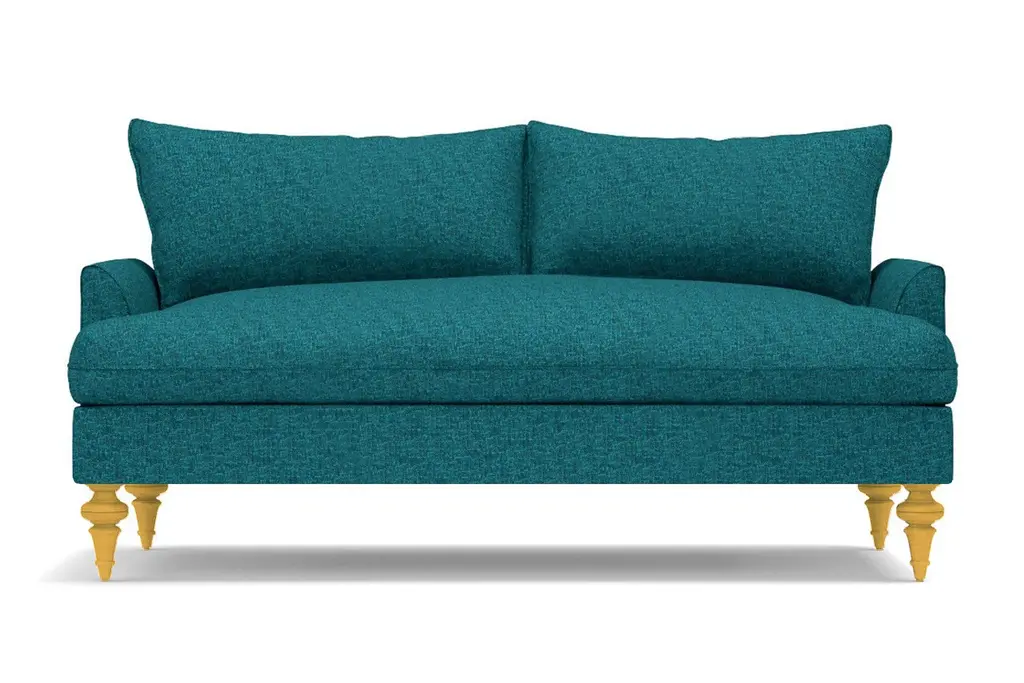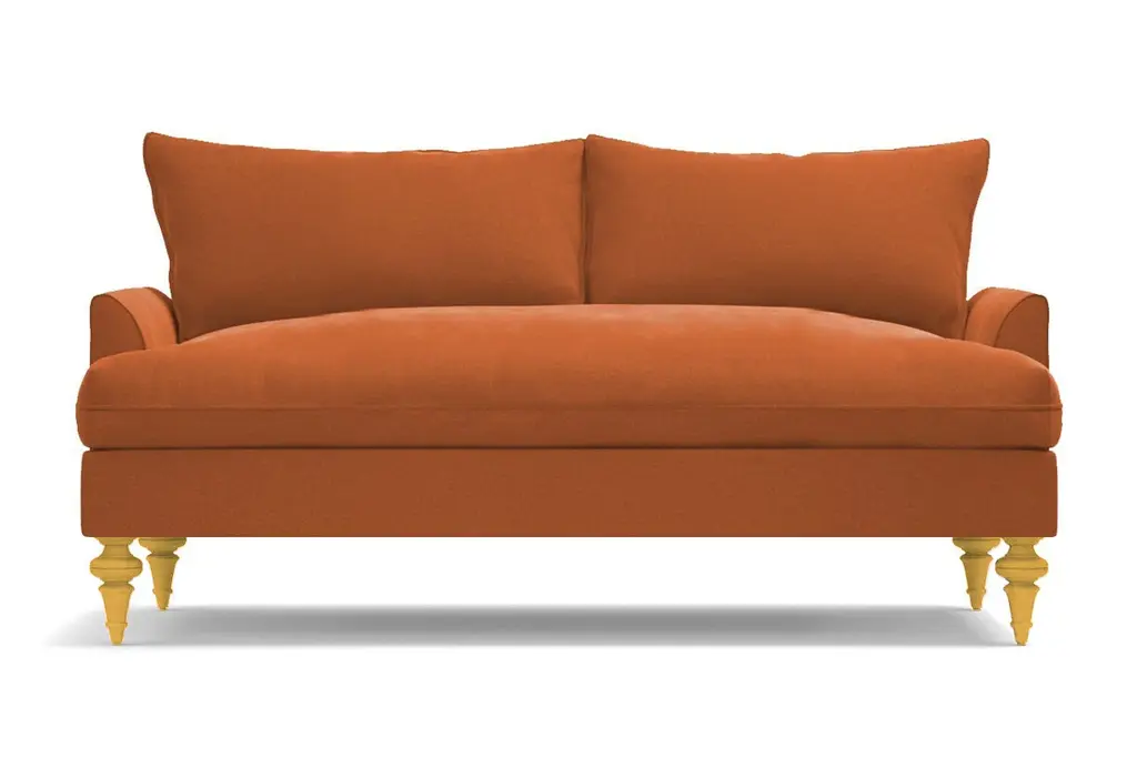 There are so many rave-worthy features on the Saxon Apartment Size Sofa from Kyle Schuneman, but our favorite has to be the classic, decorative turned wood legs. For our high-heel wearing customers, the legs dress up this sofa much like heels dress up an outfit. They have the ability to elevate a simple design from same old to head-turning. Other impressive features of this transitional sofa include ultra-down plush seat cushioning and a deep bench seat for the ultimate in lounging comfort. The quality of the craftsmanship is evident throughout, and details such as knife edge trim along the seat and back cushions give it a refined, tailored finish, and the sofa is made in the USA. Choose from a range of colors that run the gamut from neutral and classy to warm and sassy.