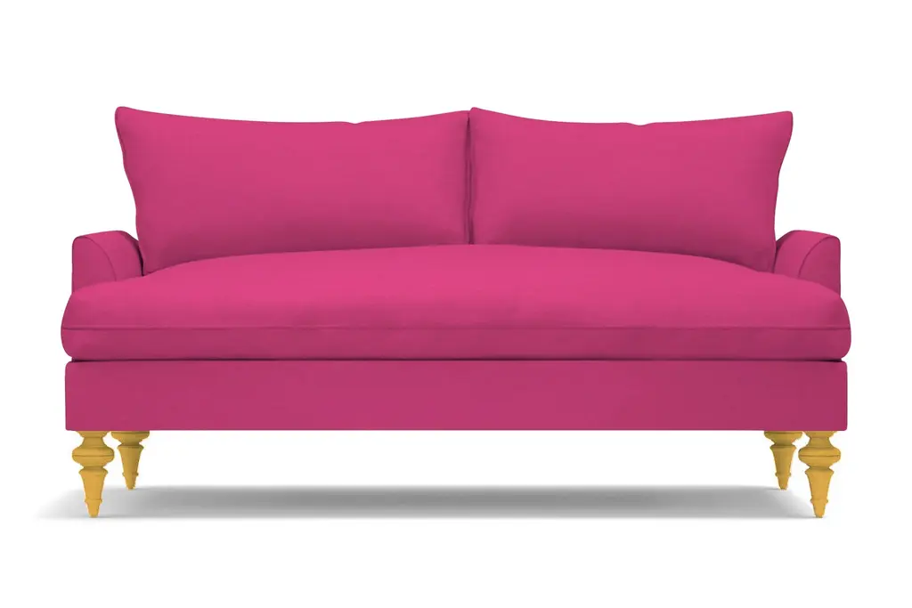 There are so many rave-worthy features on the Saxon Apartment Size Sofa from Kyle Schuneman, but our favorite has to be the classic, decorative turned wood legs. For our high-heel wearing customers, the legs dress up this sofa much like heels dress up an outfit. They have the ability to elevate a simple design from same old to head-turning. Other impressive features of this transitional sofa include ultra-down plush seat cushioning and a deep bench seat for the ultimate in lounging comfort. The quality of the craftsmanship is evident throughout, and details such as knife edge trim along the seat and back cushions give it a refined, tailored finish, and the sofa is made in the USA. Choose from a range of colors that run the gamut from neutral and classy to warm and sassy.