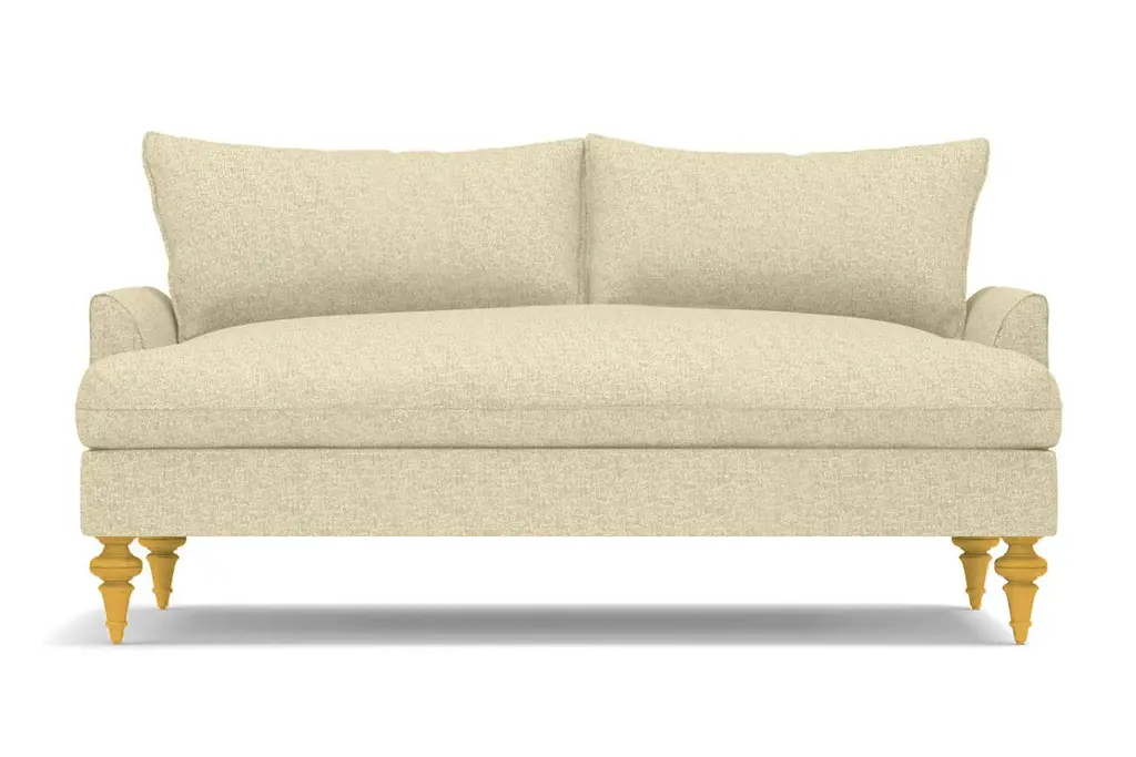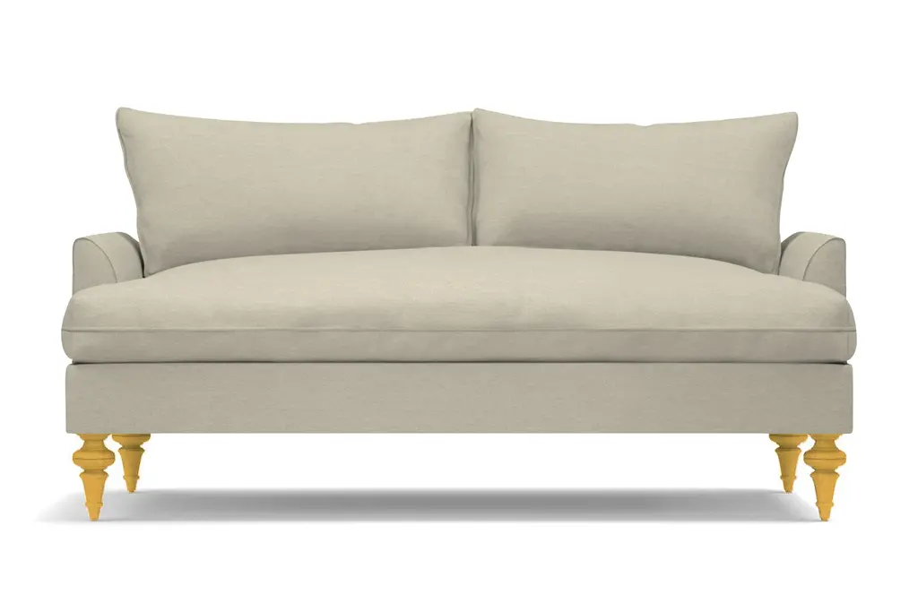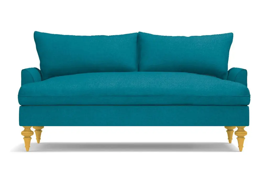 There are so many rave-worthy features on the Saxon Apartment Size Sofa from Kyle Schuneman, but our favorite has to be the classic, decorative turned wood legs. For our high-heel wearing customers, the legs dress up this sofa much like heels dress up an outfit. They have the ability to elevate a simple design from same old to head-turning. Other impressive features of this transitional sofa include ultra-down plush seat cushioning and a deep bench seat for the ultimate in lounging comfort. The quality of the craftsmanship is evident throughout, and details such as knife edge trim along the seat and back cushions give it a refined, tailored finish, and the sofa is made in the USA. Choose from a range of colors that run the gamut from neutral and classy to warm and sassy.