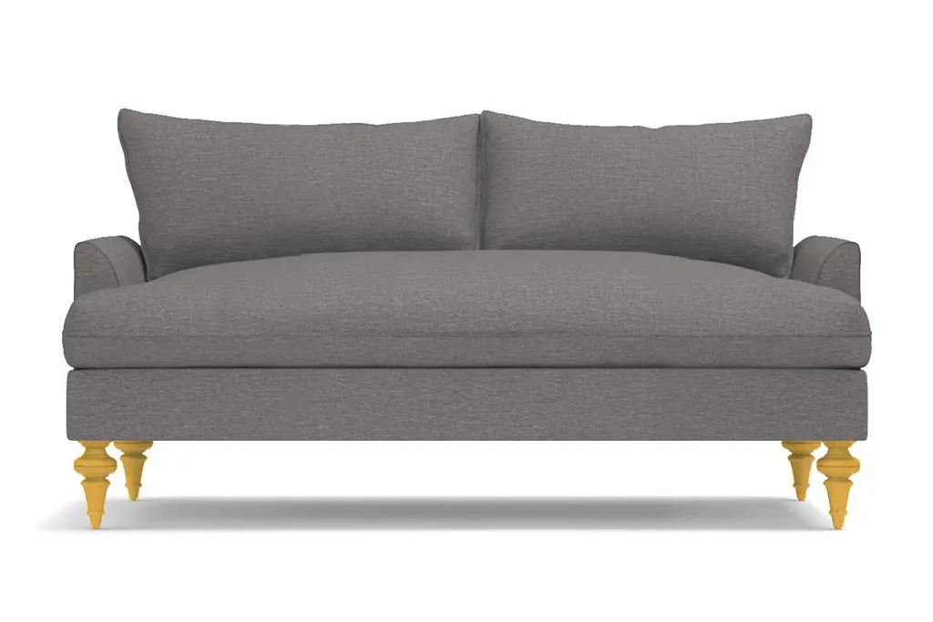 There are so many rave-worthy features on the Saxon Apartment Size Sofa from Kyle Schuneman, but our favorite has to be the classic, decorative turned wood legs. For our high-heel wearing customers, the legs dress up this sofa much like heels dress up an outfit. They have the ability to elevate a simple design from same old to head-turning. Other impressive features of this transitional sofa include ultra-down plush seat cushioning and a deep bench seat for the ultimate in lounging comfort. The quality of the craftsmanship is evident throughout, and details such as knife edge trim along the seat and back cushions give it a refined, tailored finish, and the sofa is made in the USA. Choose from a range of colors that run the gamut from neutral and classy to warm and sassy.