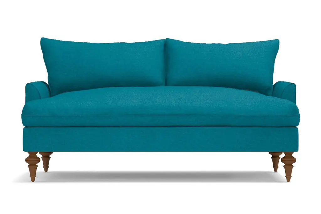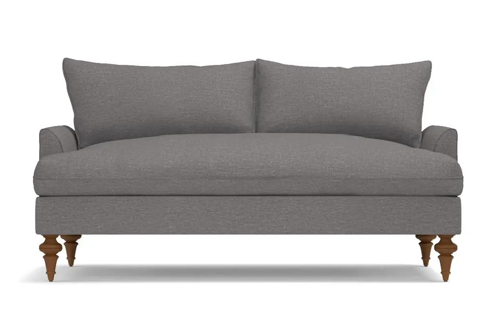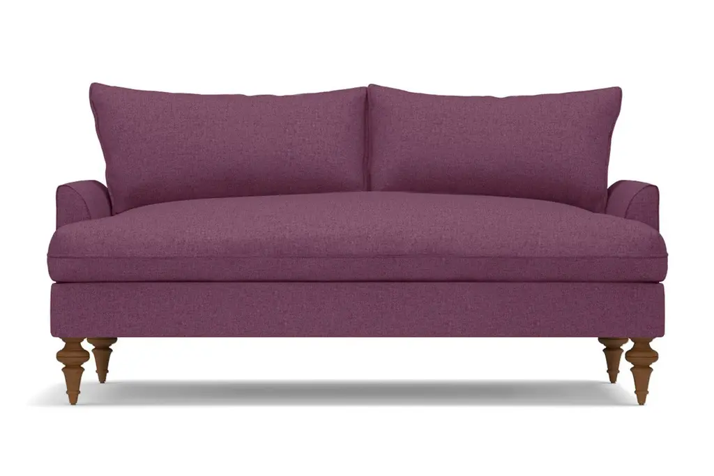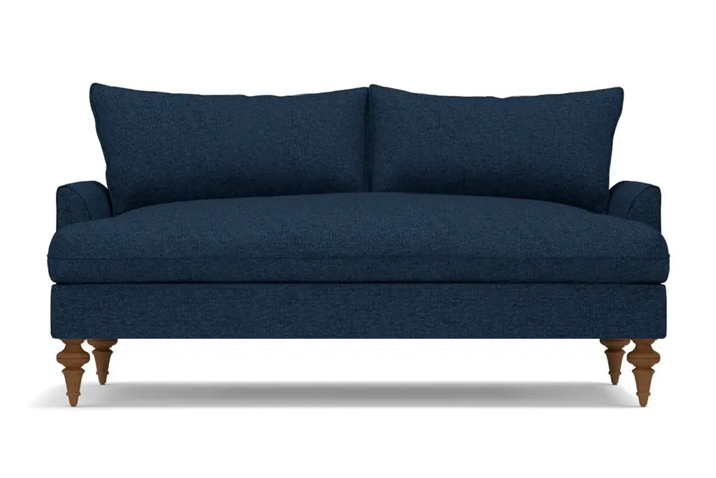 There are so many rave-worthy features on the Saxon Apartment Size Sofa from Kyle Schuneman, but our favorite has to be the classic, decorative turned wood legs. For our high-heel wearing customers, the legs dress up this sofa much like heels dress up an outfit. They have the ability to elevate a simple design from same old to head-turning. Other impressive features of this transitional sofa include ultra-down plush seat cushioning and a deep bench seat for the ultimate in lounging comfort. The quality of the craftsmanship is evident throughout, and details such as knife edge trim along the seat and back cushions give it a refined, tailored finish, and the sofa is made in the USA. Choose from a range of colors that run the gamut from neutral and classy to warm and sassy.