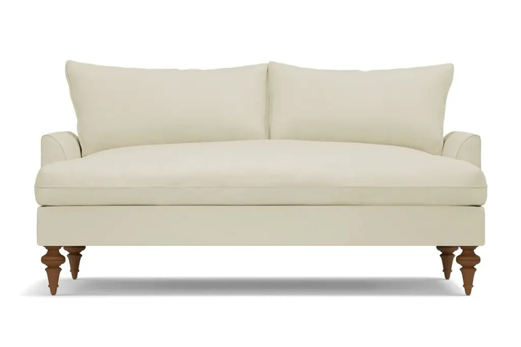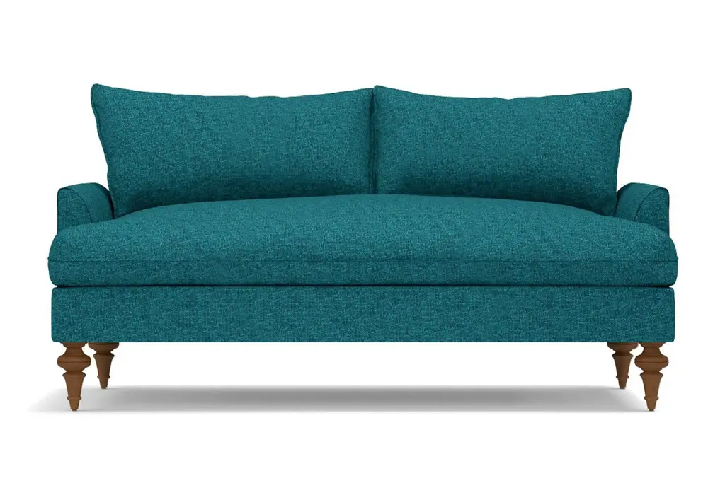 There are so many rave-worthy features on the Saxon Apartment Size Sofa from Kyle Schuneman, but our favorite has to be the classic, decorative turned wood legs. For our high-heel wearing customers, the legs dress up this sofa much like heels dress up an outfit. They have the ability to elevate a simple design from same old to head-turning. Other impressive features of this transitional sofa include ultra-down plush seat cushioning and a deep bench seat for the ultimate in lounging comfort. The quality of the craftsmanship is evident throughout, and details such as knife edge trim along the seat and back cushions give it a refined, tailored finish, and the sofa is made in the USA. Choose from a range of colors that run the gamut from neutral and classy to warm and sassy.