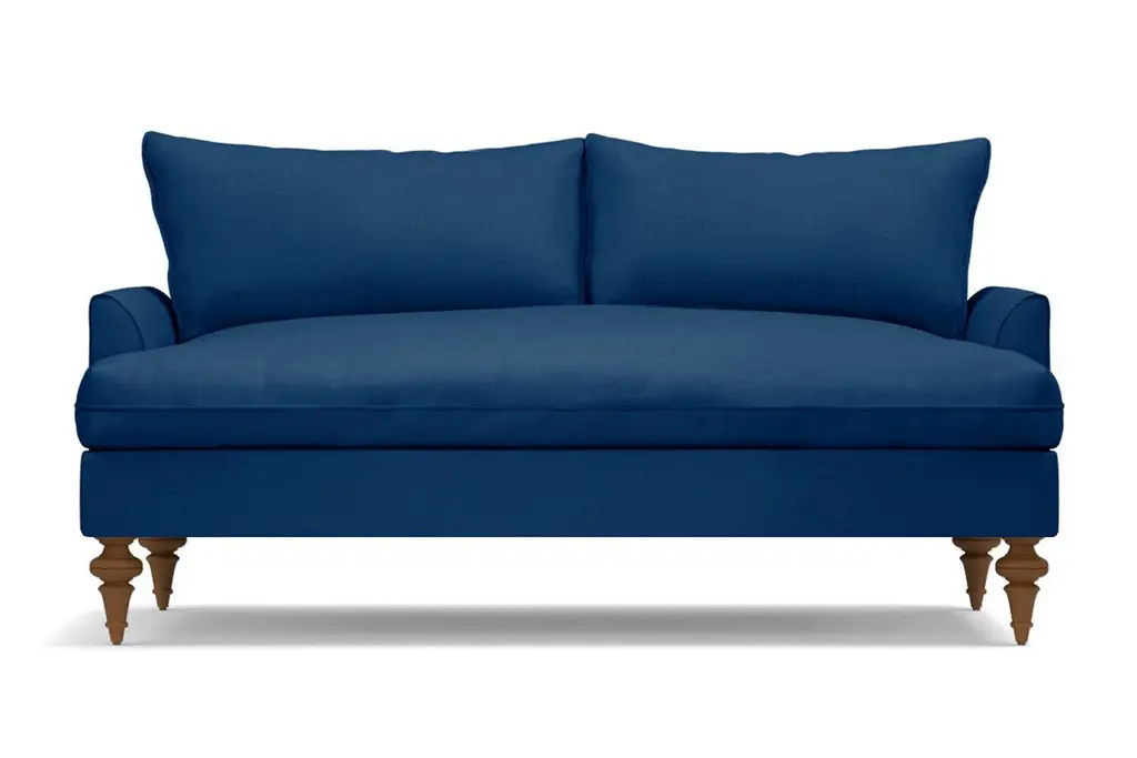 There are so many rave-worthy features on the Saxon Apartment Size Sofa from Kyle Schuneman, but our favorite has to be the classic, decorative turned wood legs. For our high-heel wearing customers, the legs dress up this sofa much like heels dress up an outfit. They have the ability to elevate a simple design from same old to head-turning. Other impressive features of this transitional sofa include ultra-down plush seat cushioning and a deep bench seat for the ultimate in lounging comfort. The quality of the craftsmanship is evident throughout, and details such as knife edge trim along the seat and back cushions give it a refined, tailored finish, and the sofa is made in the USA. Choose from a range of colors that run the gamut from neutral and classy to warm and sassy.