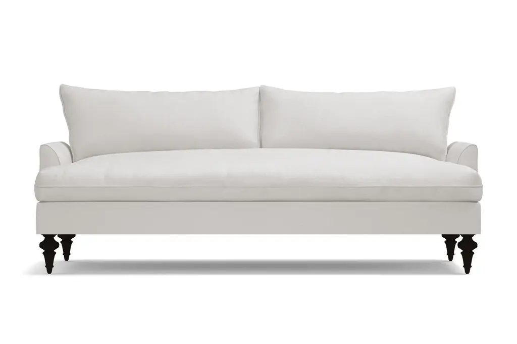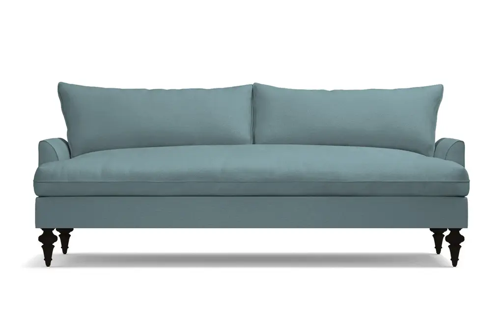 Luxurious velvet fabric tempts you to get down with our Saxon Sofa, literally made with ultra-plush down seat cushioning! You'll love sinking into these deep bench seats for a cozy night in. Choose your favorite shade of velvet from a variety of rich colors that add a sensuous touch to the transitional design. Based on the "shabby-chic" design concept, though we think "well-loved chic" is more fitting, this plush velvet sofa features Victorian turned legs in a choice of three finishes and knife-edge trim on the seat and back cushions for a polished look. The overall effect of our Saxon modern velvet sofa is an updated take on traditional décor that brings a fresh feel without trying too hard.The Saxon velvet sofa is custom made in our Los Angeles facility with a solid Alderwood frame, flippable detached cushions and zippered velvet cushion covers that are removable for cleaning. Plus, we ship it right to your home for free!