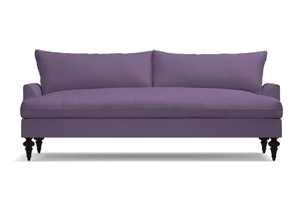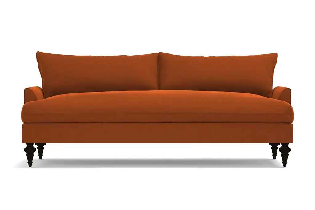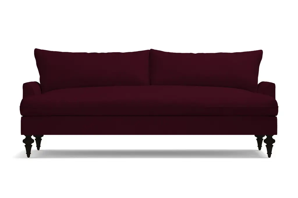 Luxurious velvet fabric tempts you to get down with our Saxon Sofa, literally made with ultra-plush down seat cushioning! You'll love sinking into these deep bench seats for a cozy night in. Choose your favorite shade of velvet from a variety of rich colors that add a sensuous touch to the transitional design. Based on the "shabby-chic" design concept, though we think "well-loved chic" is more fitting, this plush velvet sofa features Victorian turned legs in a choice of three finishes and knife-edge trim on the seat and back cushions for a polished look. The overall effect of our Saxon modern velvet sofa is an updated take on traditional décor that brings a fresh feel without trying too hard.The Saxon velvet sofa is custom made in our Los Angeles facility with a solid Alderwood frame, flippable detached cushions and zippered velvet cushion covers that are removable for cleaning. Plus, we ship it right to your home for free!