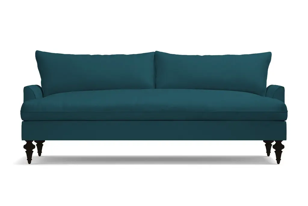 Luxurious velvet fabric tempts you to get down with our Saxon Sofa, literally made with ultra-plush down seat cushioning! You'll love sinking into these deep bench seats for a cozy night in. Choose your favorite shade of velvet from a variety of rich colors that add a sensuous touch to the transitional design. Based on the "shabby-chic" design concept, though we think "well-loved chic" is more fitting, this plush velvet sofa features Victorian turned legs in a choice of three finishes and knife-edge trim on the seat and back cushions for a polished look. The overall effect of our Saxon modern velvet sofa is an updated take on traditional décor that brings a fresh feel without trying too hard.The Saxon velvet sofa is custom made in our Los Angeles facility with a solid Alderwood frame, flippable detached cushions and zippered velvet cushion covers that are removable for cleaning. Plus, we ship it right to your home for free!
