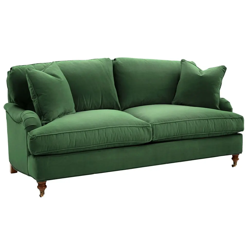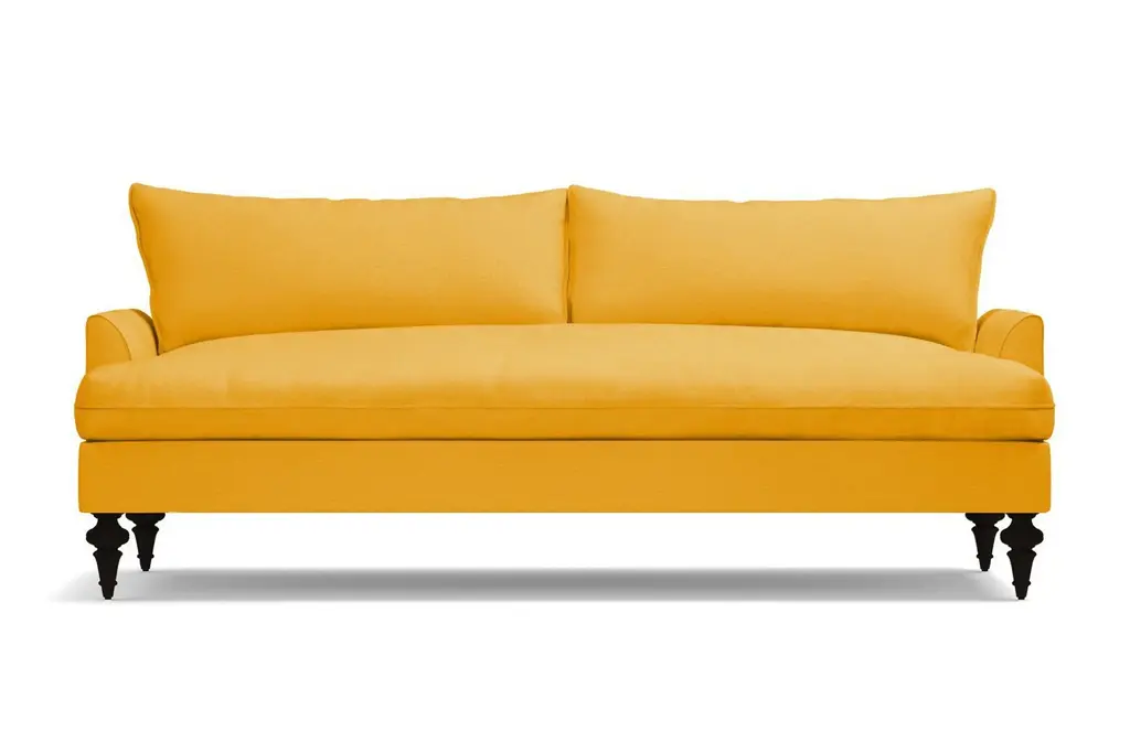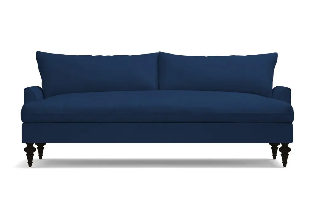 Luxurious velvet fabric tempts you to get down with our Saxon Sofa, literally made with ultra-plush down seat cushioning! You'll love sinking into these deep bench seats for a cozy night in. Choose your favorite shade of velvet from a variety of rich colors that add a sensuous touch to the transitional design. Based on the "shabby-chic" design concept, though we think "well-loved chic" is more fitting, this plush velvet sofa features Victorian turned legs in a choice of three finishes and knife-edge trim on the seat and back cushions for a polished look. The overall effect of our Saxon modern velvet sofa is an updated take on traditional décor that brings a fresh feel without trying too hard.The Saxon velvet sofa is custom made in our Los Angeles facility with a solid Alderwood frame, flippable detached cushions and zippered velvet cushion covers that are removable for cleaning. Plus, we ship it right to your home for free!