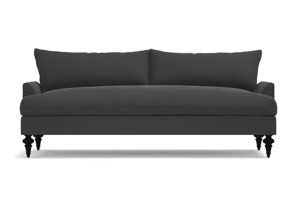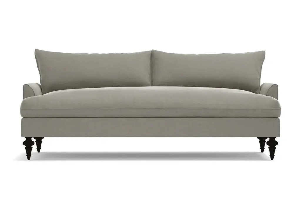 Luxurious velvet fabric tempts you to get down with our Saxon Sofa, literally made with ultra-plush down seat cushioning! You'll love sinking into these deep bench seats for a cozy night in. Choose your favorite shade of velvet from a variety of rich colors that add a sensuous touch to the transitional design. Based on the "shabby-chic" design concept, though we think "well-loved chic" is more fitting, this plush velvet sofa features Victorian turned legs in a choice of three finishes and knife-edge trim on the seat and back cushions for a polished look. The overall effect of our Saxon modern velvet sofa is an updated take on traditional décor that brings a fresh feel without trying too hard.The Saxon velvet sofa is custom made in our Los Angeles facility with a solid Alderwood frame, flippable detached cushions and zippered velvet cushion covers that are removable for cleaning. Plus, we ship it right to your home for free!