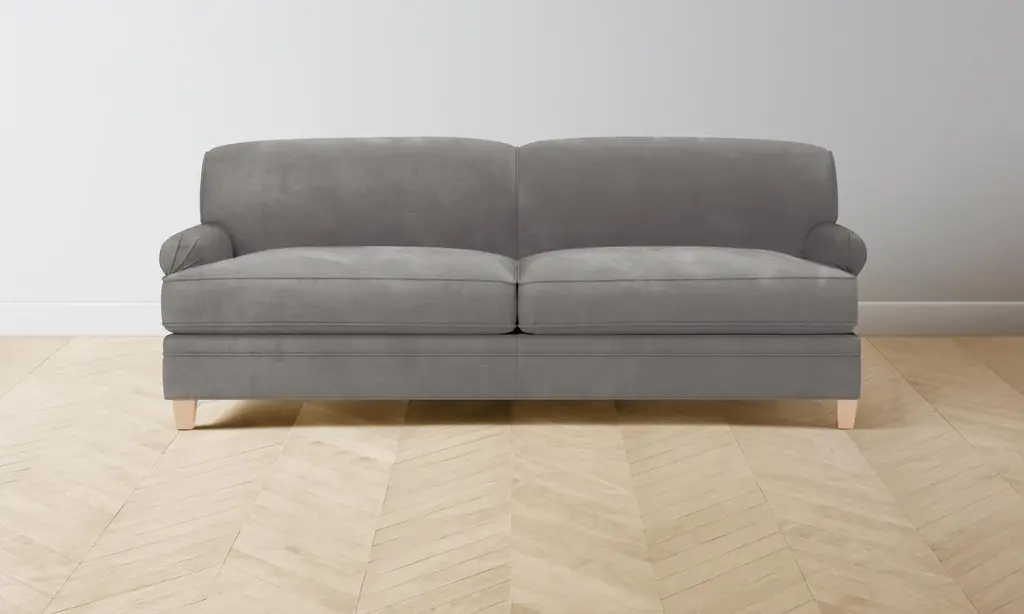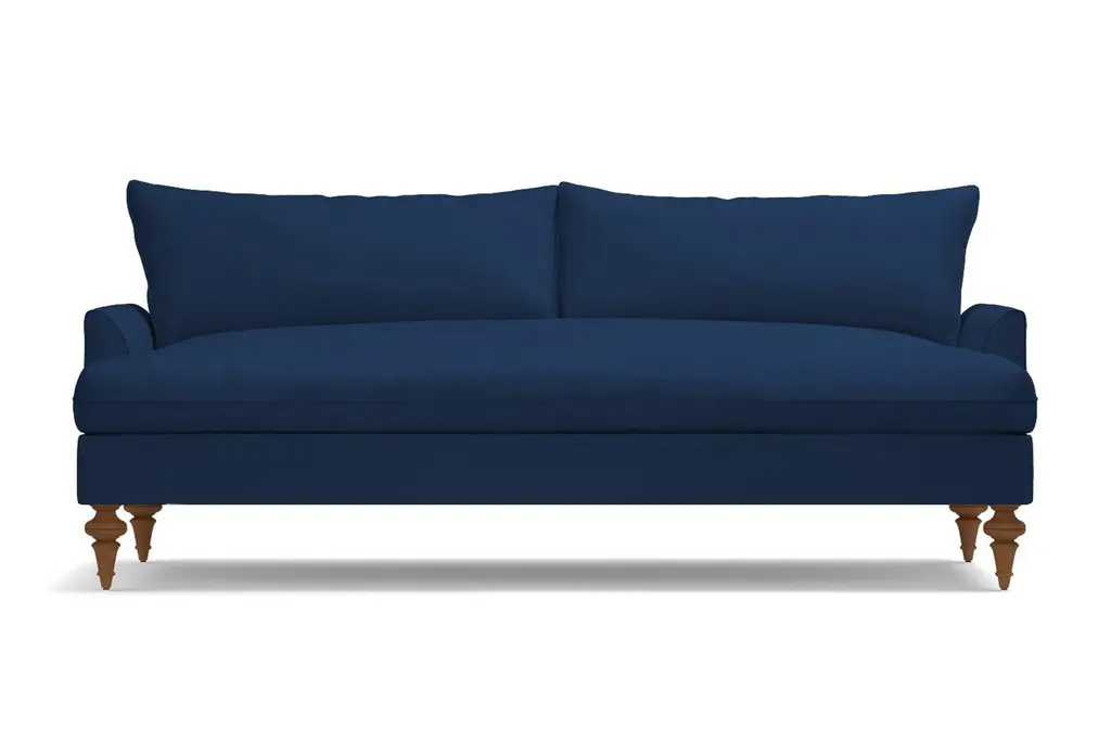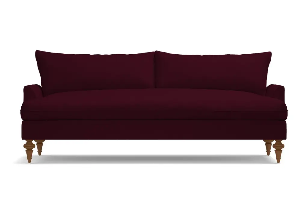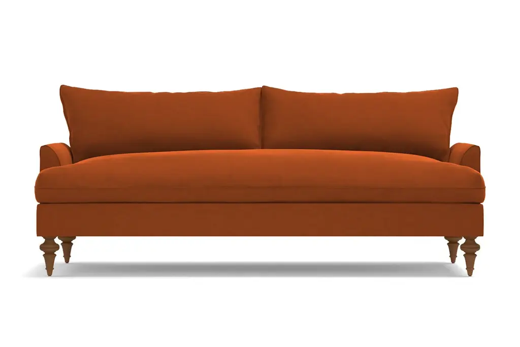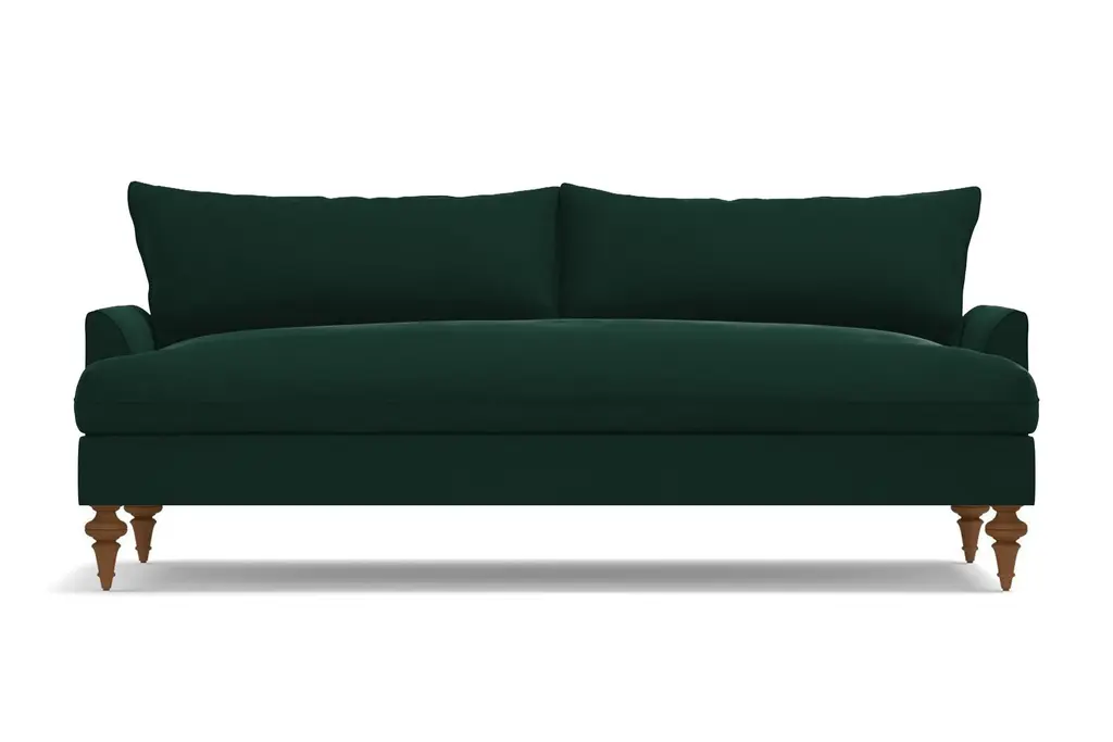 Luxurious velvet fabric tempts you to get down with our Saxon Sofa, literally made with ultra-plush down seat cushioning! You'll love sinking into these deep bench seats for a cozy night in. Choose your favorite shade of velvet from a variety of rich colors that add a sensuous touch to the transitional design.Based on the "shabby-chic" design concept, though we think "well-loved chic" is more fitting, this plush velvet sofa features Victorian turned legs in a choice of three finishes and knife-edge trim on the seat and back cushions for a polished look. The overall effect of our Saxon modern velvet sofa is an updated take on traditional décor that brings a fresh feel without trying too hard.The Saxon velvet sofa is custom made in our Los Angeles facility with a solid Alderwood frame, flippable detached cushions and zippered velvet cushion covers that are removable for cleaning. Plus, we ship it right to your home for free!