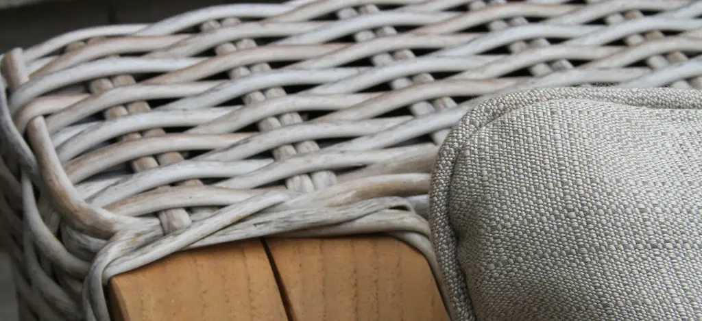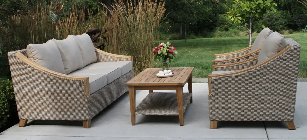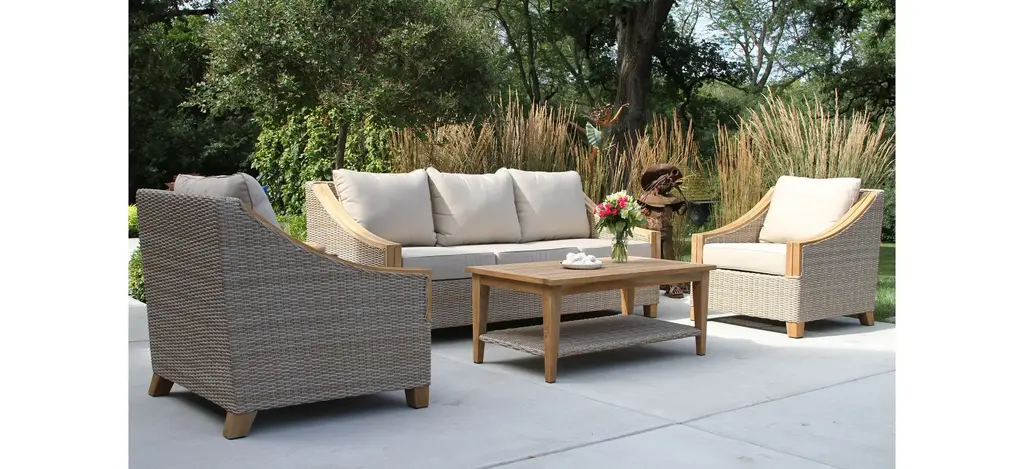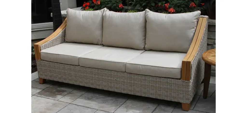 Create a nautical dreamscape with this Sea Drift wicker and teak outdoor sofa. The lush Sunbrella pillows and cushions are soft and durable for many seasons of use and extra comfortable for lounging.