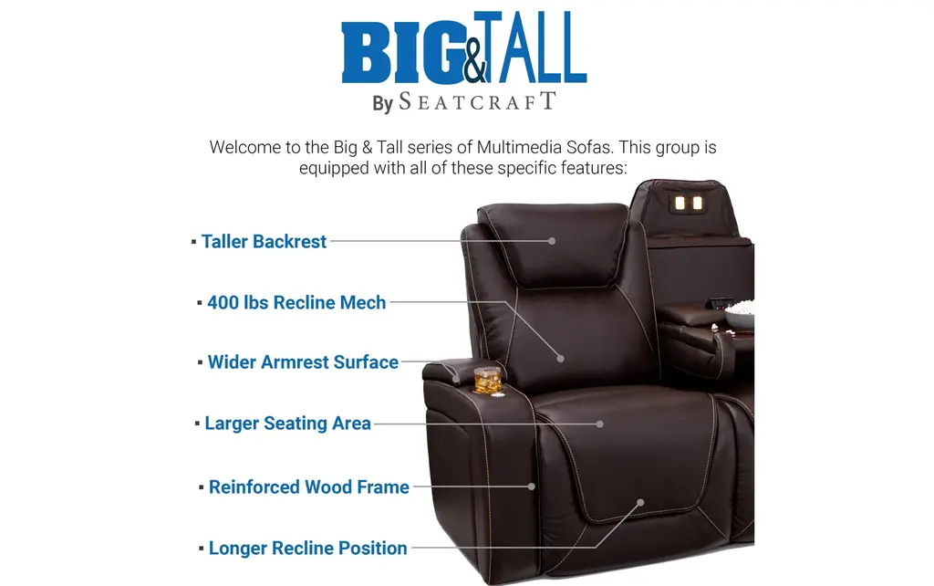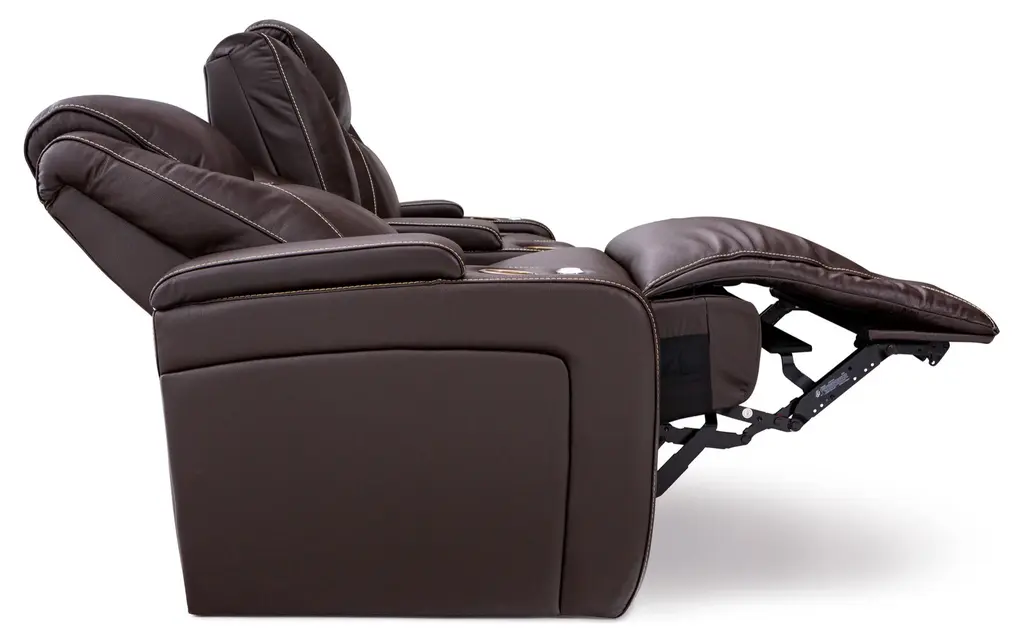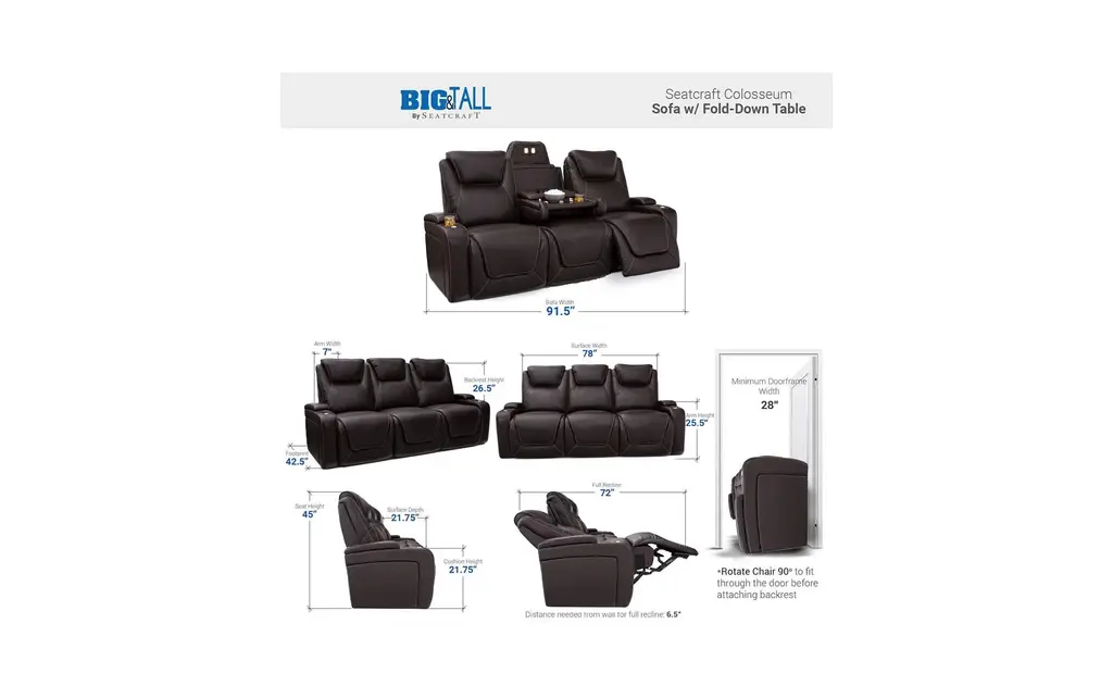 This behemoth in home theater seating is known as the Colosseum by Seatcraft. With fully loaded, reliable, and easy to use features such as an adjustable, setting-controlled ComfortView Power Headrest and ComfortView Power Lumbar motors. Sit in the Colosseum home theater sofa or loveseat, find the recline, headrest, and lumbar position that suits you perfectly, and press the memory button on the recline switch to save that position. Next time you sit down, just press the memory button and the Colosseum will take you right back to those positions every time for reliable bliss.Take your shoes off and put your feet up, put your phone on the wireless charging pad and toss the charging cable in the arm storage. Each Colosseum sofa features a hidden fold-down table with a full deck lined with a wireless charging pad, two cupholders, and a sealed, button-opened panel that opens up to reveal an AC Charging port and usb charging ports for your laptop or devices. Check back in the armrest storage for the included free swivel tray tables, place that laptop on one of them and you're ready to work, play, read, or watch in absolute harmony and comfort for as long as you desire in that perfectly supported position.Using only the finest cold-pour foam and rigid, industrial grade durability, this is a sofa that can fit anyone, support anyone in absolute comfort and bliss, and last for years upon years as your throne for entertainment. We sincerely know you and anyone who sits in it, will love the Seatcraft Colosseum home theater sofa and loveseat.