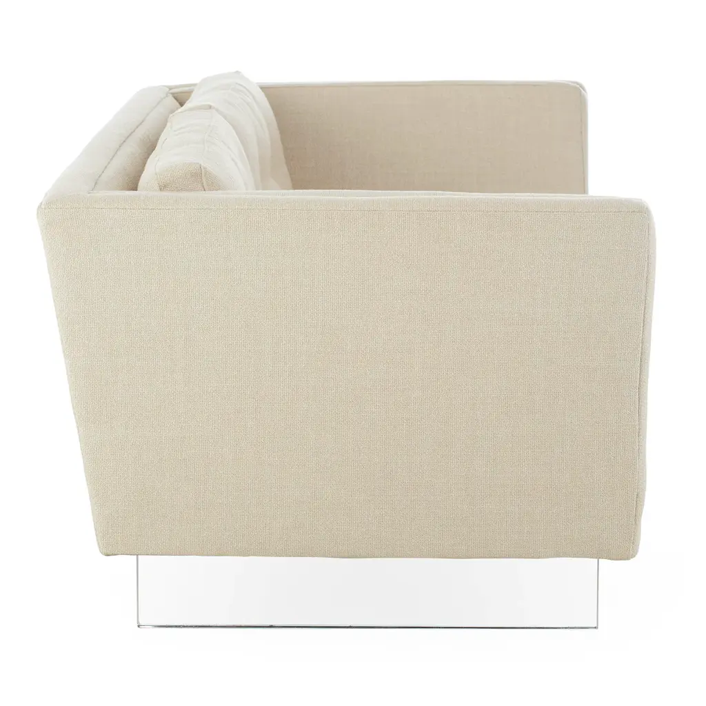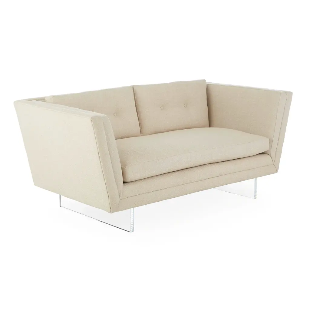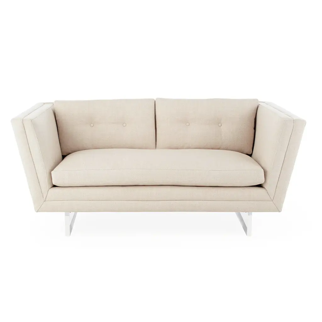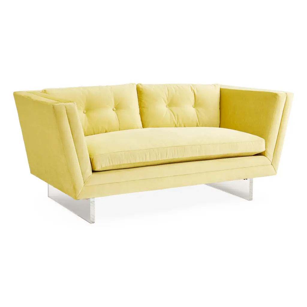 Future Forward. Floating on luxe clear acrylic sleigh legs, Sebastian is our ultra modernist spin on the iconic Knole sofa. Luxuriously deep and cozy with its high, tuxedo back, flared arms, and inviting button-tufted back cushions. Sized for smaller spaces, our Sebastian apartment sofa will feel fabulously futuristic in your Malibu pad, or give that cozy room in your Kensington townhouse minimalist edge. Polished in Deluxe Linen or surprisingly neutral in Brussels Citron upholstery. Also available as a standard size sofa .