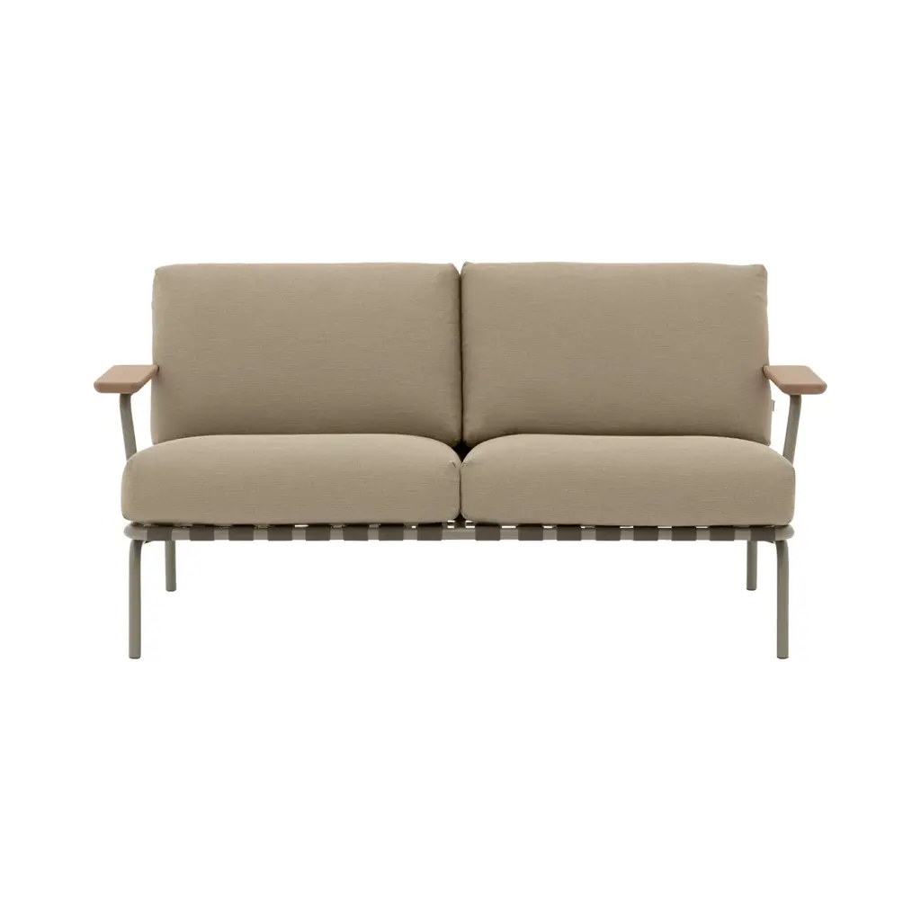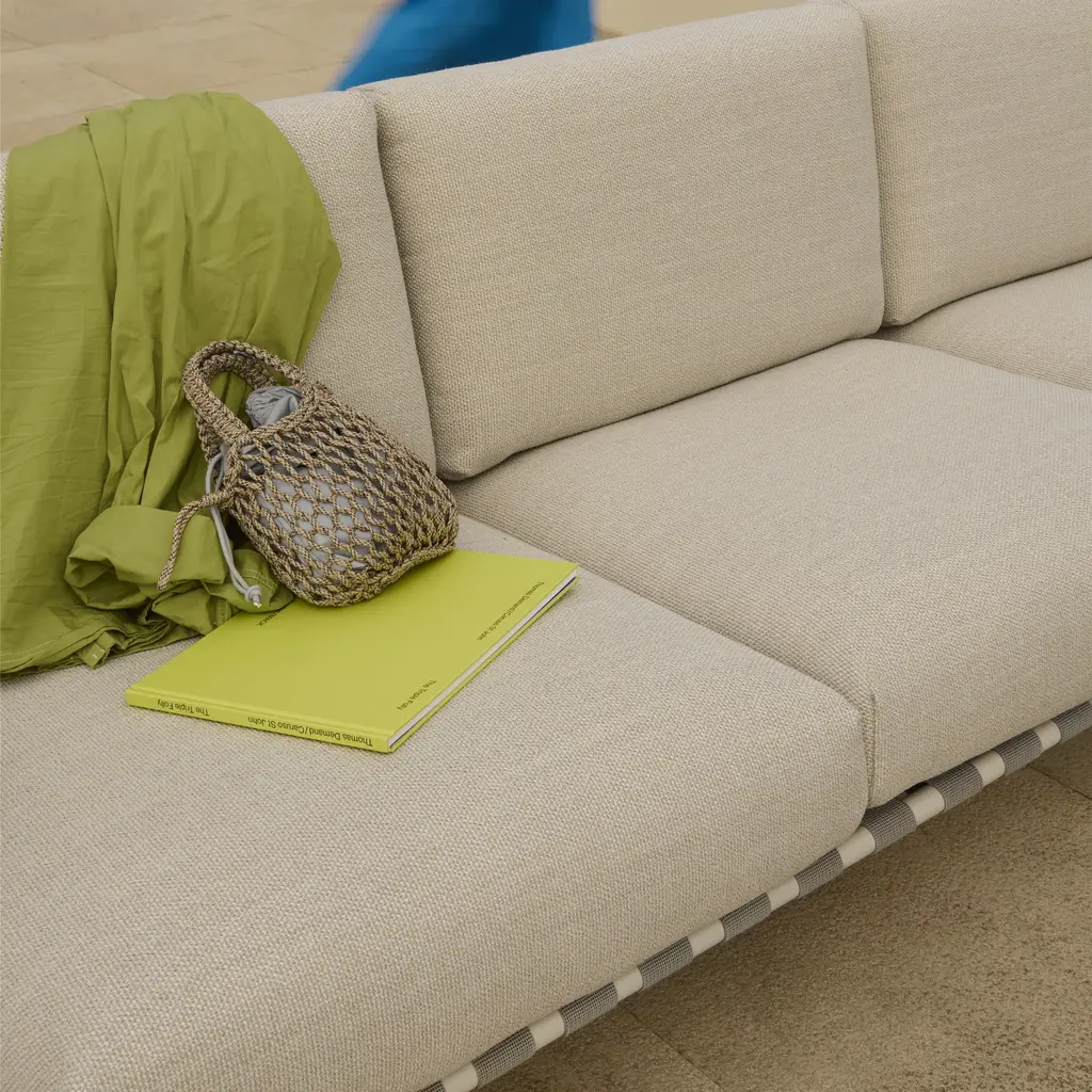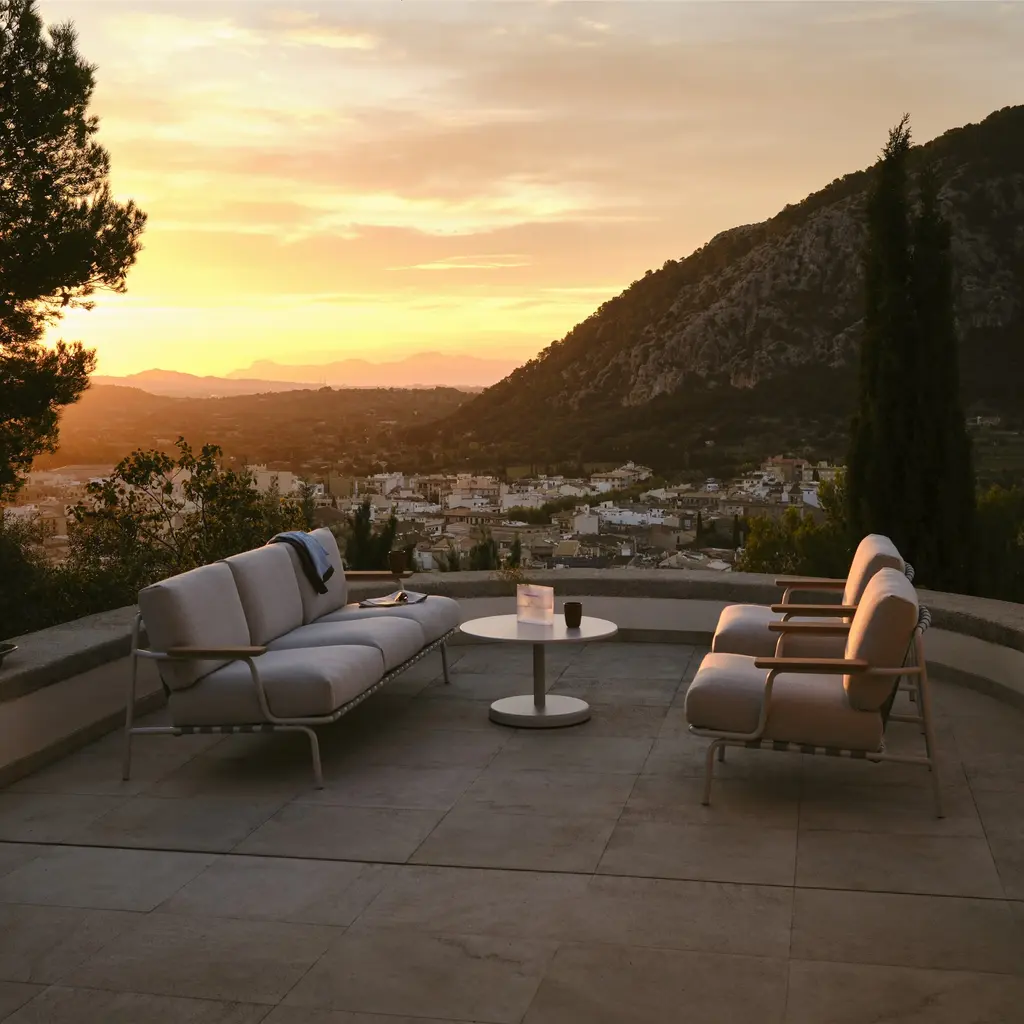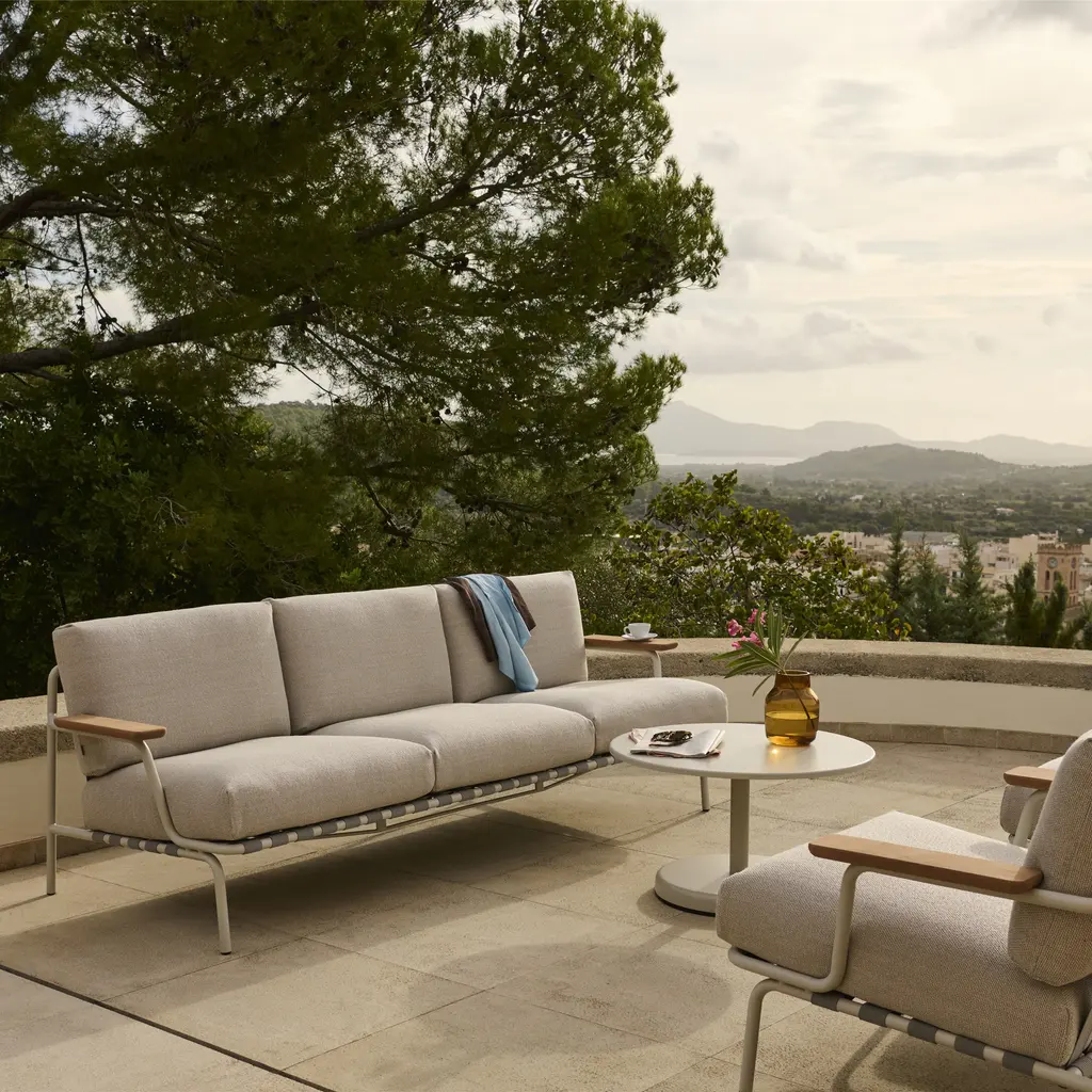 The Settle 3-seater Sofa is designed with an airy steel frame, visible belts, and intricate details that create visual interest from every angle. The armrests, crafted from FSC™-certified sapele mahogany wood, provide a warm and tactile touch. Plush cushions with quick-dry foam and durable outdoor fabrics ensure comfort and resilience, even during rain showers.