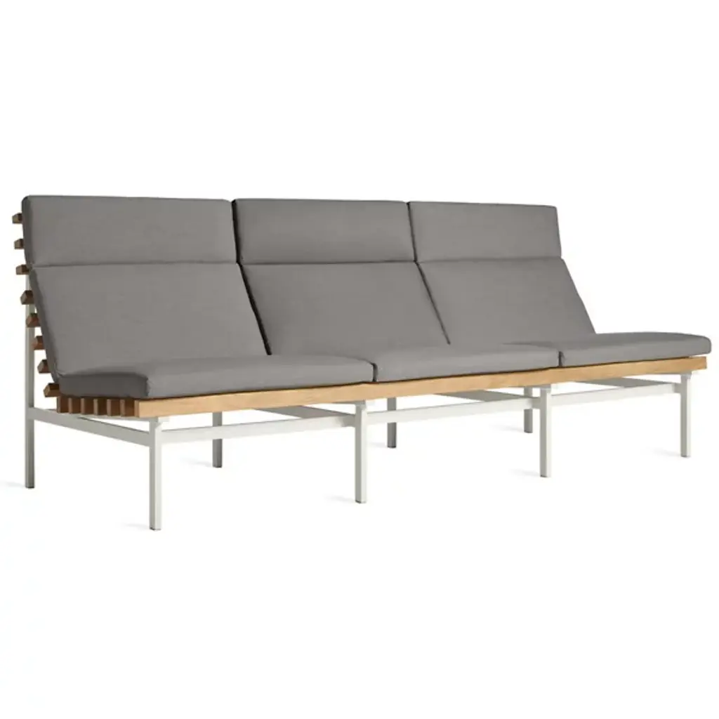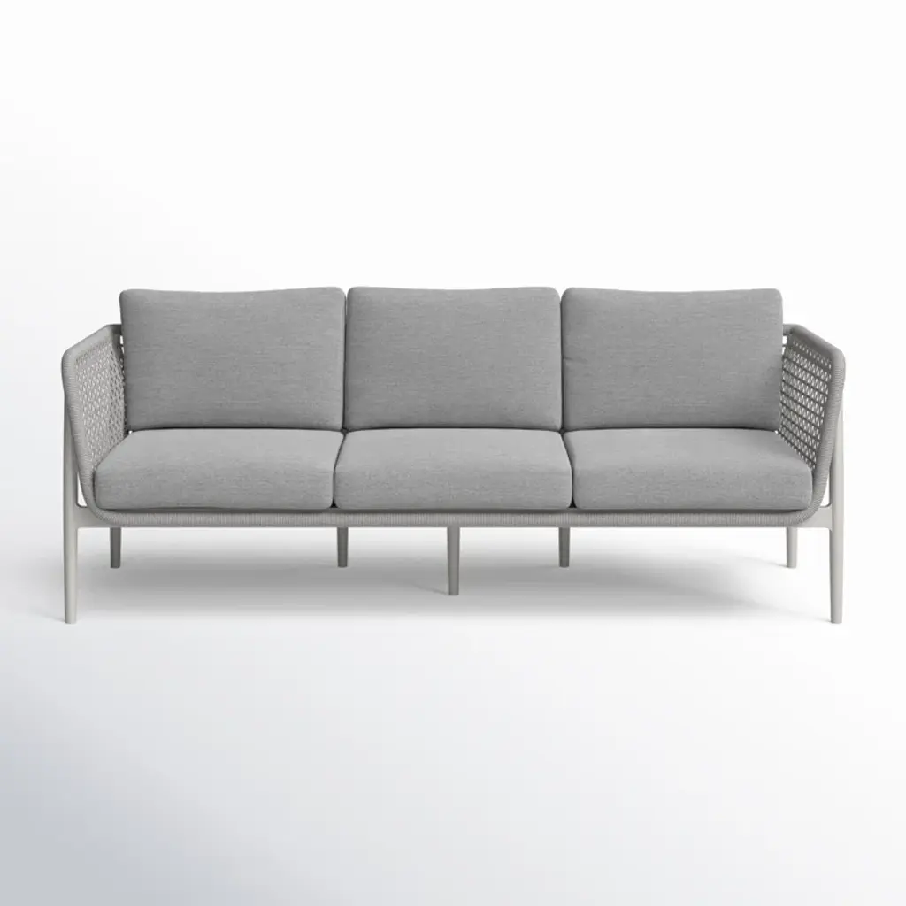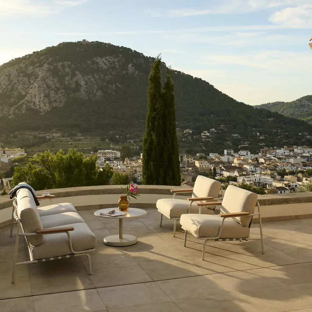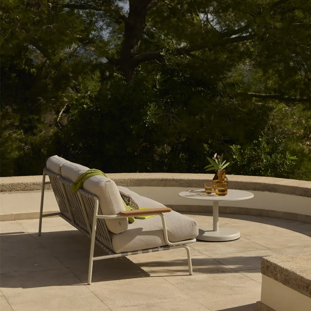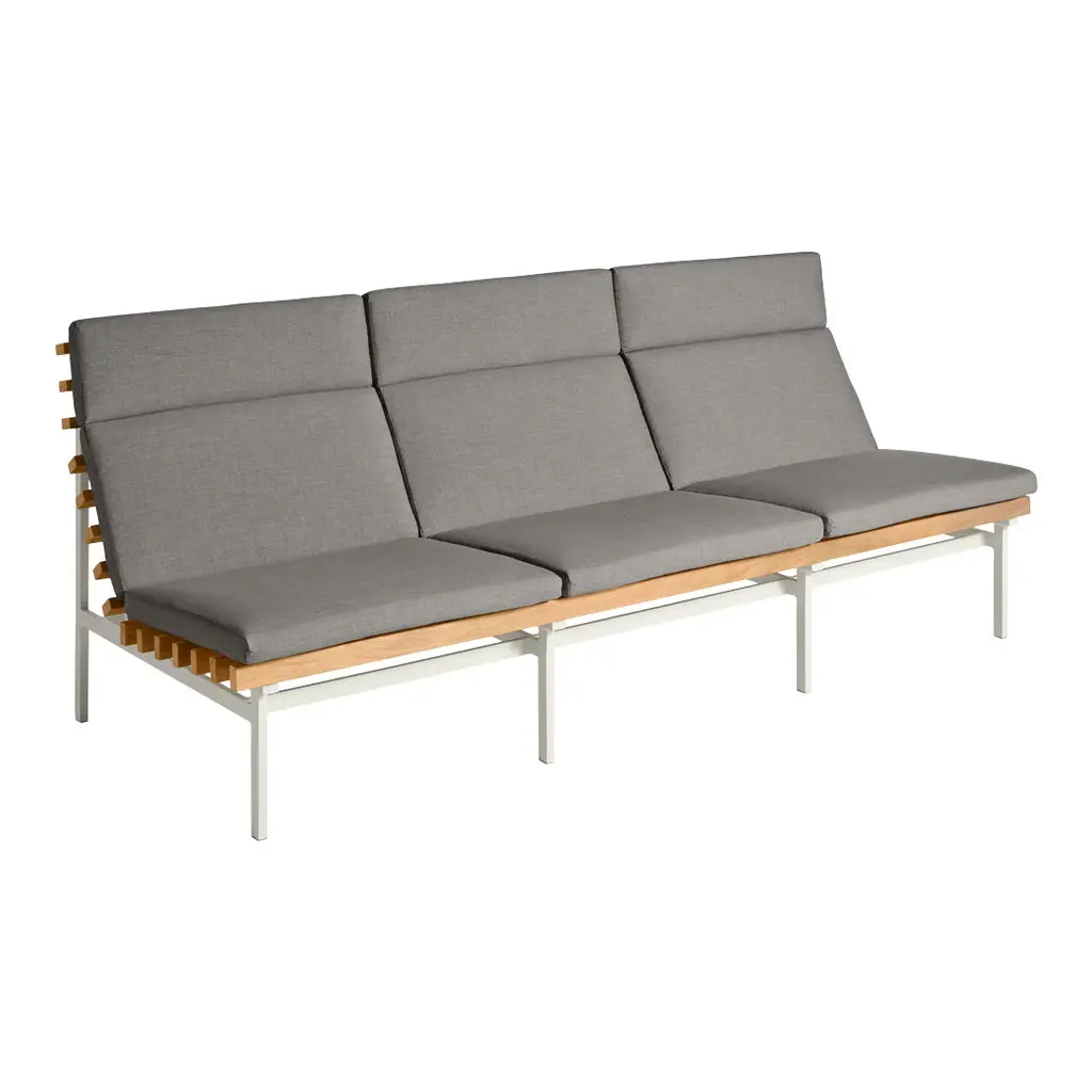 The Settle 3-seater Sofa is designed with an airy steel frame, visible belts, and intricate details that create visual interest from every angle. The armrests, crafted from FSC™-certified sapele mahogany wood, provide a warm and tactile touch. Plush cushions with quick-dry foam and durable outdoor fabrics ensure comfort and resilience, even during rain showers.