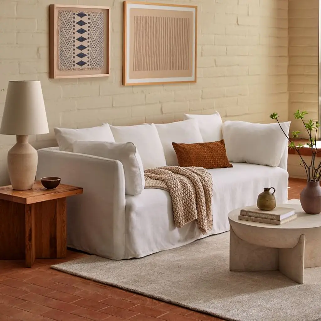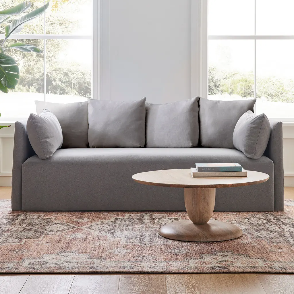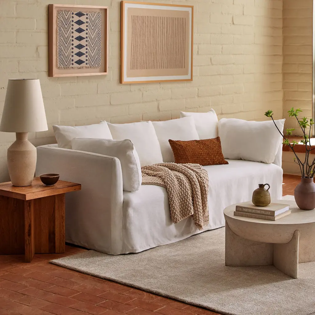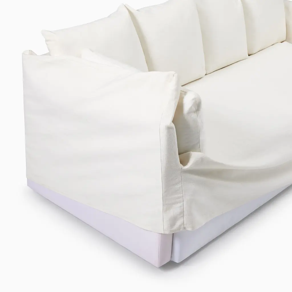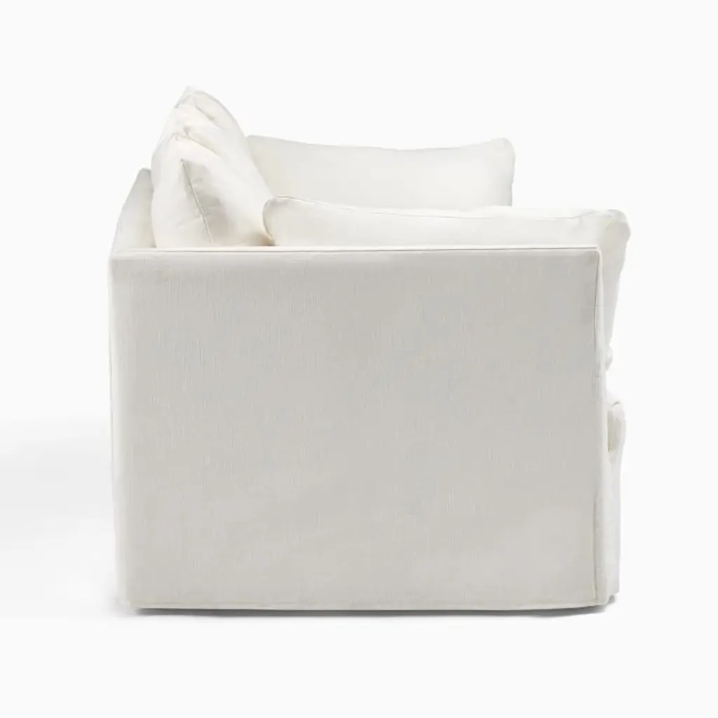 Its frame is piled with plush cushions on all sides. Deep-seated design feels just like a cozy cocoon. Removable skirted slipcover makes cleaning a breeze. Hand-built frames with hand-finished upholstery.