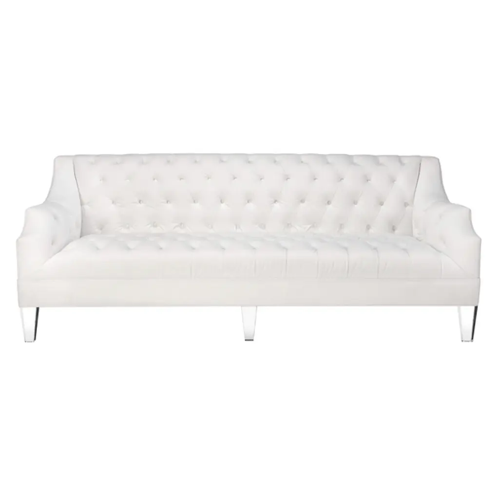 Diamond tufting and swooping, notched arms give the pieces in our Simone Collection timeless elegance, while the clear acrylic legs anchor the look with modern flair. Shown in Bella Velvet Dove with acrylic legs. Frame is constructed of kiln-dried hardwood. Corner blocked for stability and strength. 8-way hand-tied spring suspension. Exclusive to Z Gallerie. Custom Orders: Custom Furniture is manufactured especially for you, which is why we do not accept cancellations, exchanges, or returns.