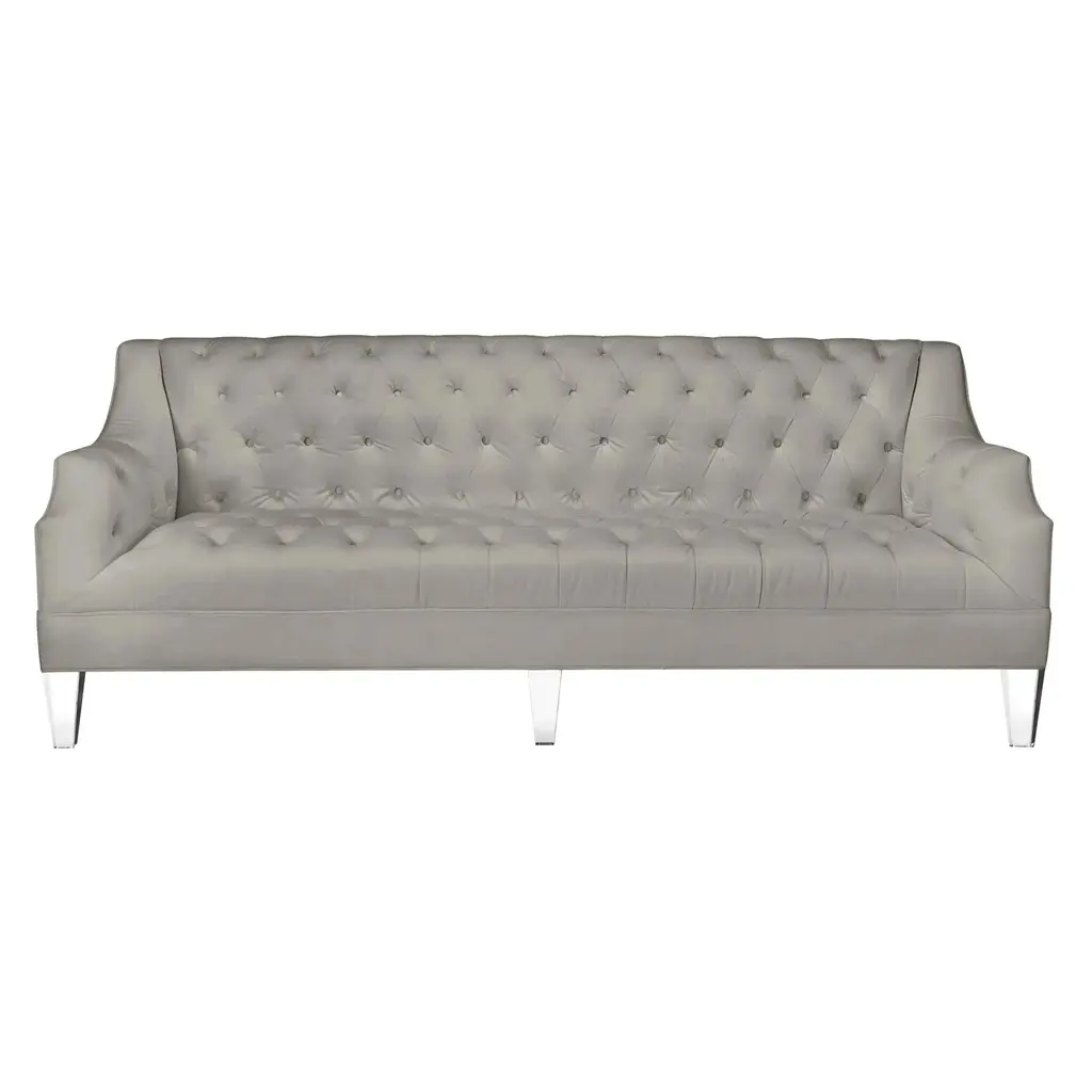 Diamond tufting and swooping, notched arms give the pieces in our Simone Collection timeless elegance, while the clear acrylic legs anchor the look with modern flair.  Shown in Bella Velvet Dove with acrylic legs.Frame is constructed of kiln-dried hardwood.Corner blocked for stability and strength.8-way hand-tied spring suspension.Exclusive to Z Gallerie.Custom Orders: Custom Furniture is manufactured especially for you, which is why we do not accept cancellations, exchanges, or returns.
