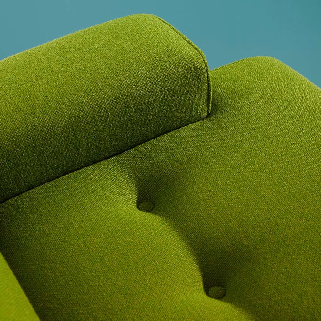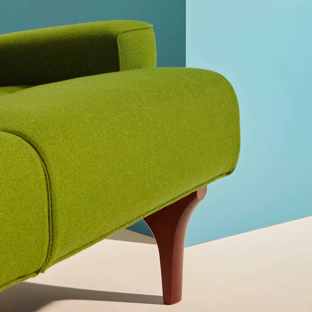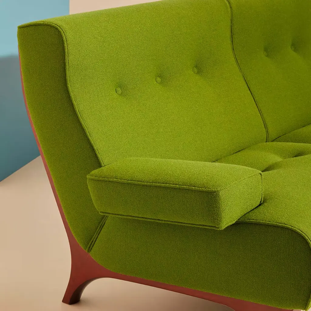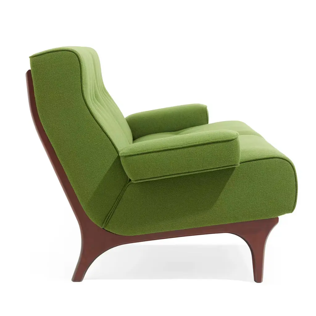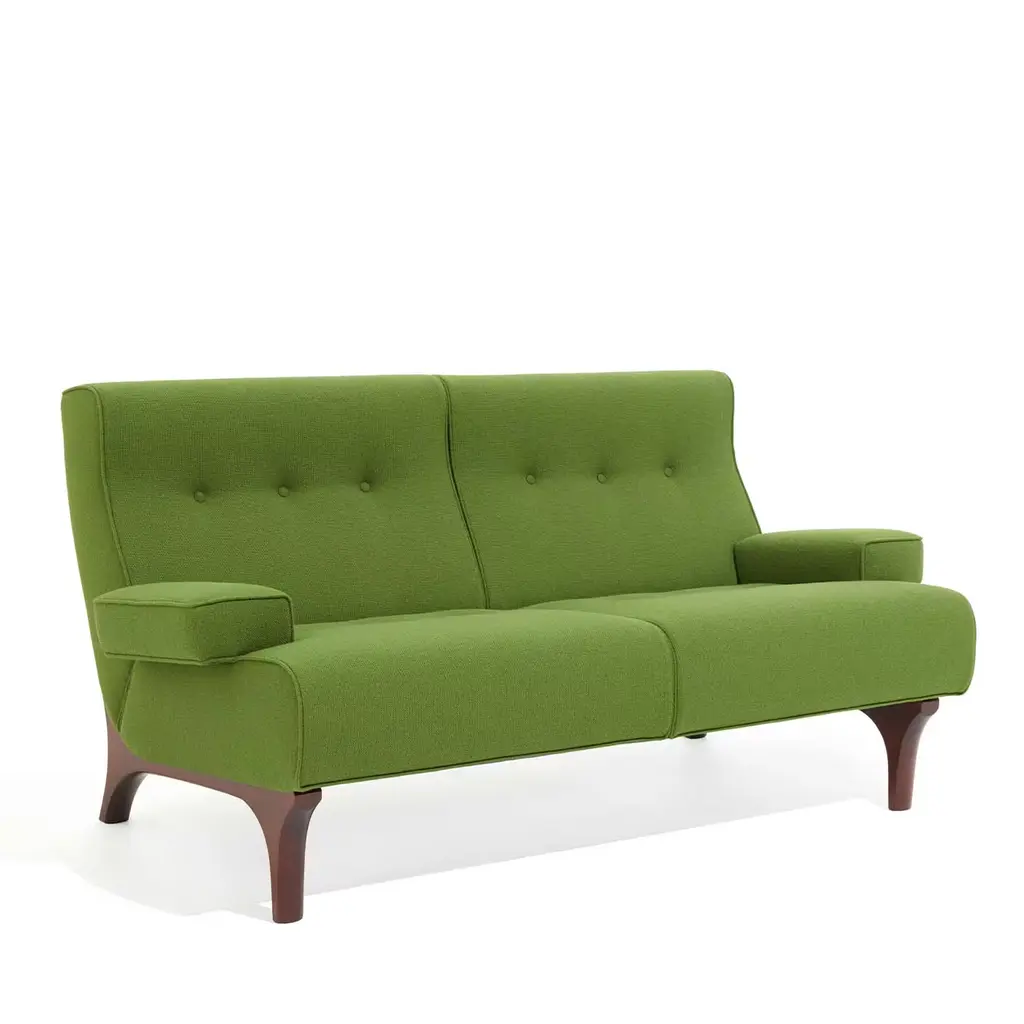Clean and elegant sophistication with subtle vintage flair define this sublime sofa, a stylish statement piece for any modern interior. Resting on sleek solid mahogany feet, it features an inner structure in plywood reinforced with iron. The two seats, backrest, and armrests are padded with multi-density rubber belts. The upholstery is a refined green fabric. Also available in leather upon request to the Concierge.