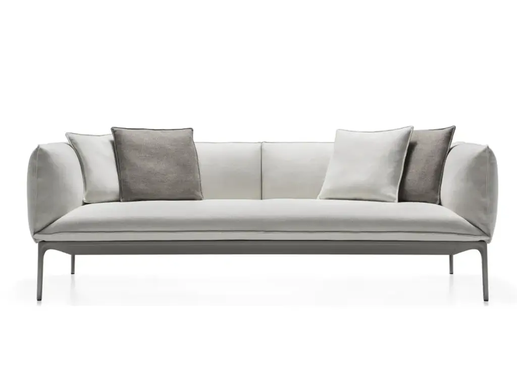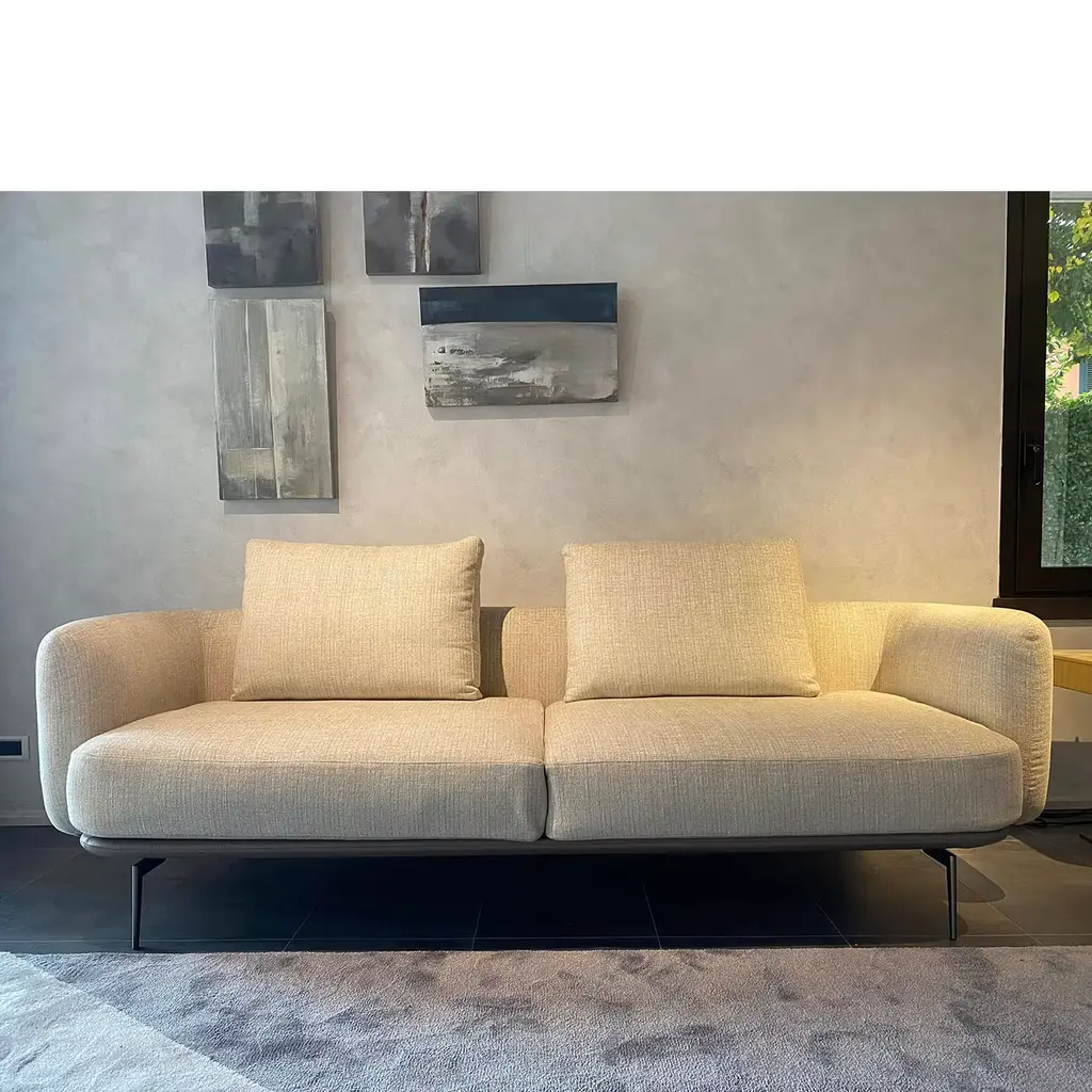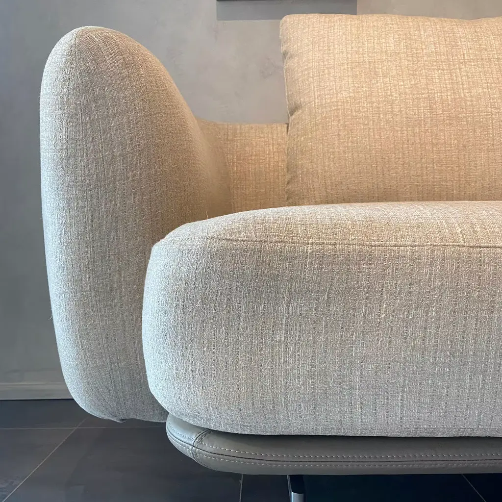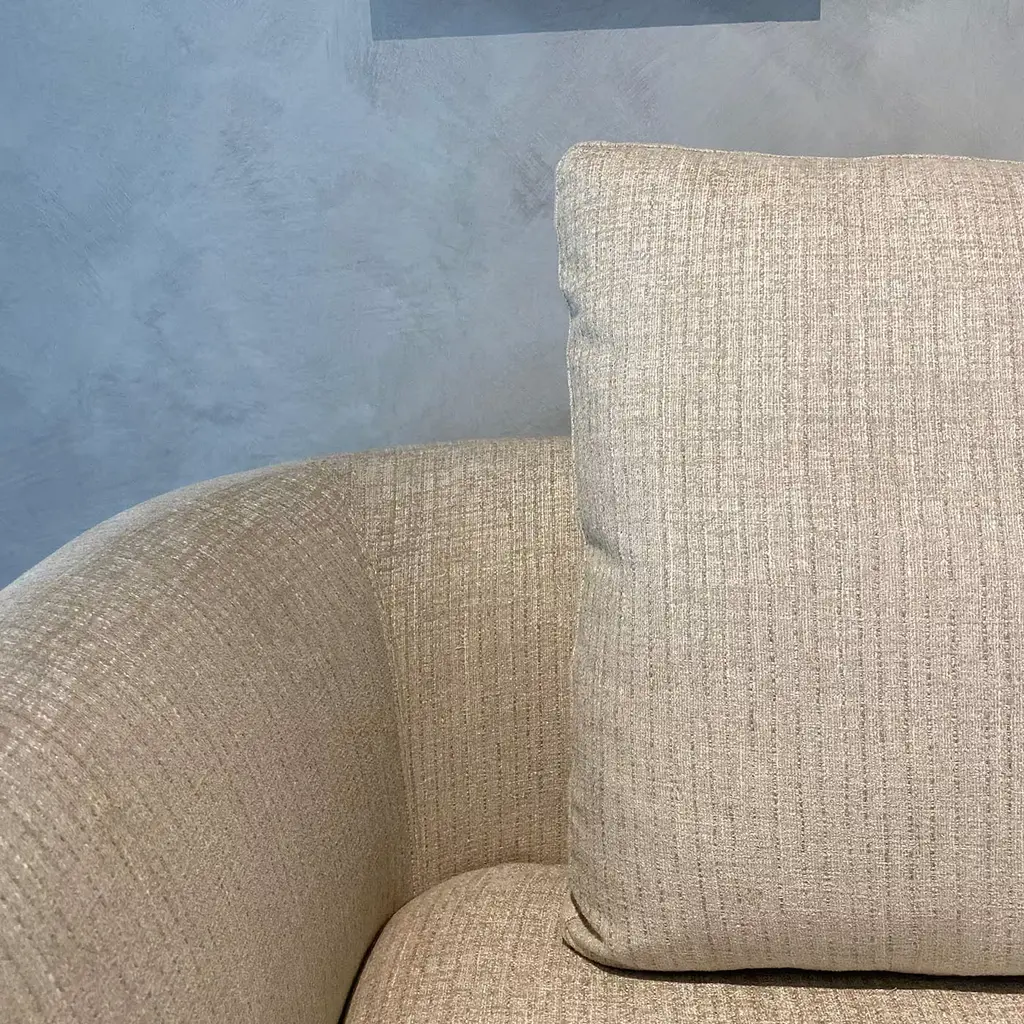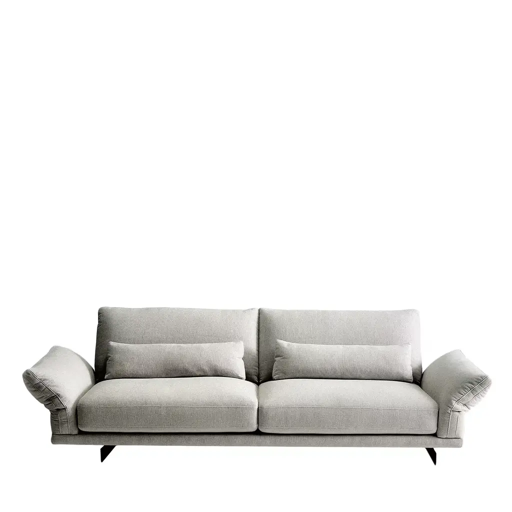 The Sirio Sofa combines comfort and elegance, featuring polyurethane padding in varying densities for optimal support. Its base is upholstered in luxurious leather, accented with refined stitching. The sofa rests on sturdy metal feet, available in a stylish bronze-gold finish, with options for lead and burnished finishes. Upholstery comes in fabric, with leather options also available. Two structural cushions are included for added comfort, while decorative pillows are sold separately.