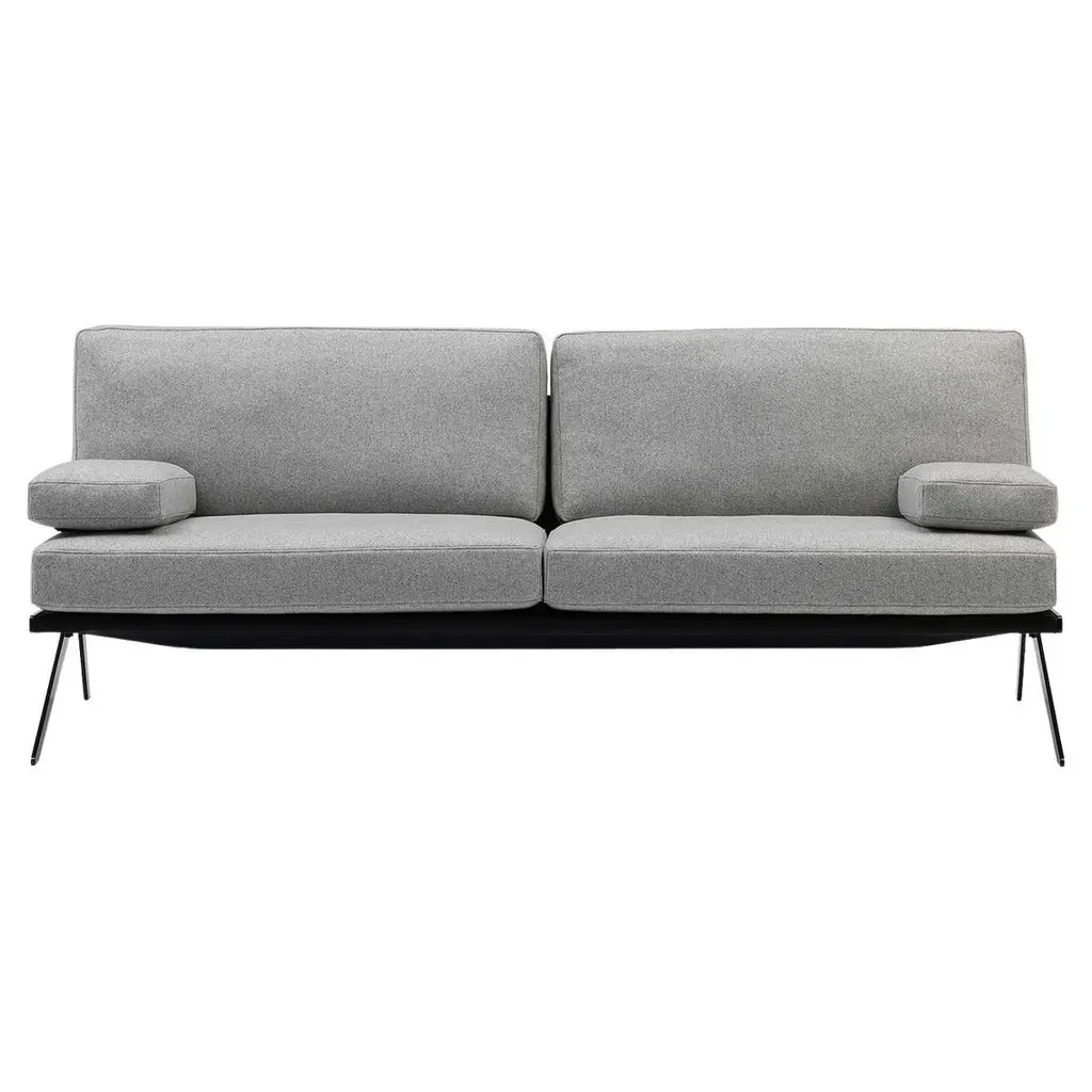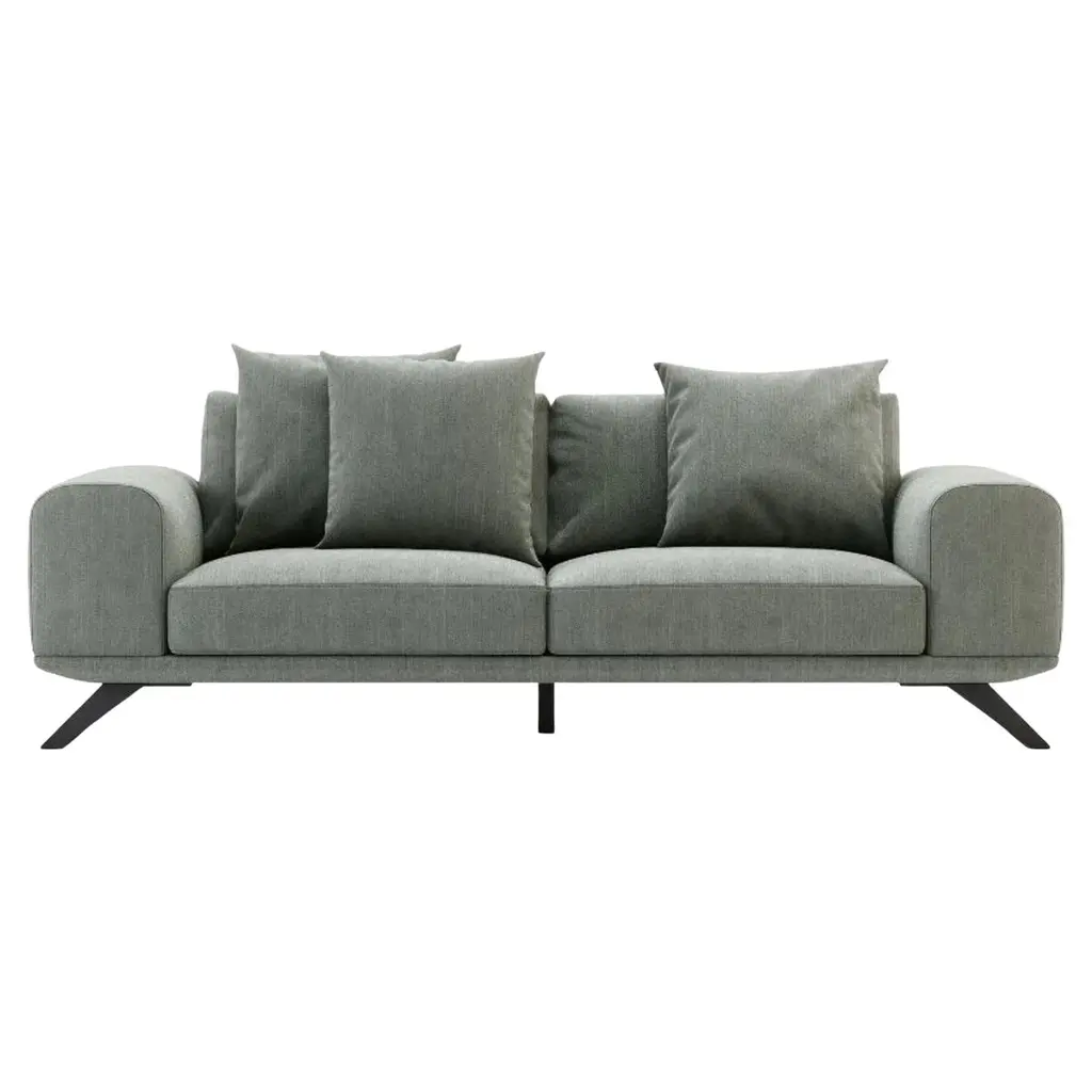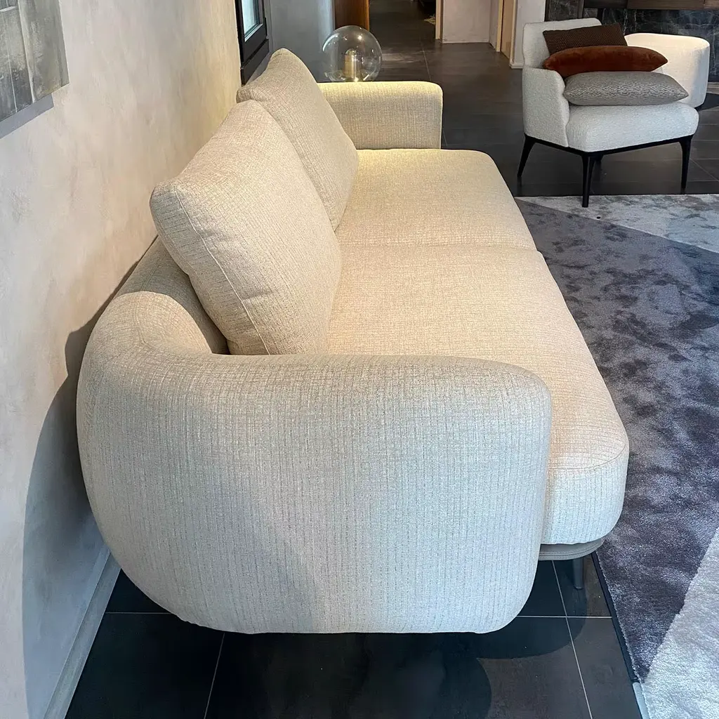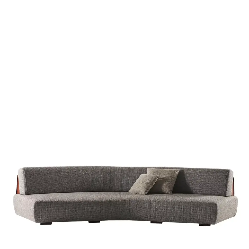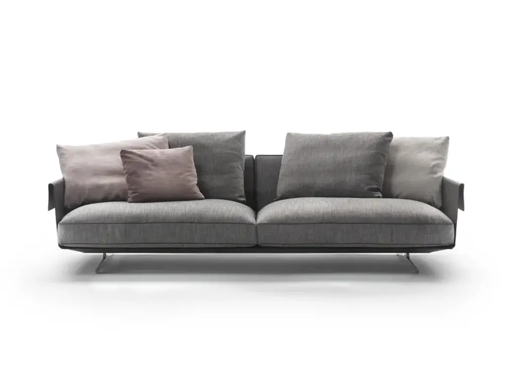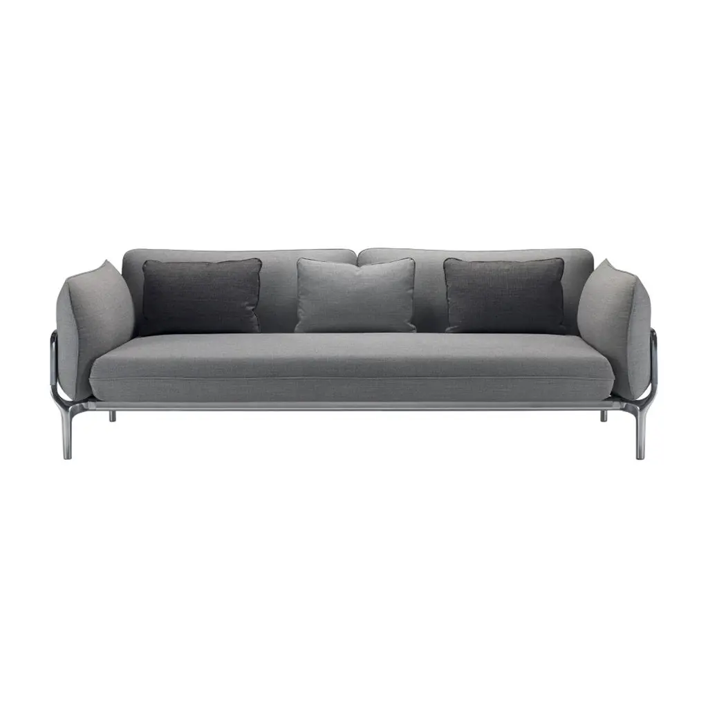 The Sirio Sofa combines comfort and elegance, featuring polyurethane padding in varying densities for optimal support. Its base is upholstered in luxurious leather, accented with refined stitching. The sofa rests on sturdy metal feet, available in a stylish bronze-gold finish, with options for lead and burnished finishes. Upholstery comes in fabric, with leather options also available. Two structural cushions are included for added comfort, while decorative pillows are sold separately.