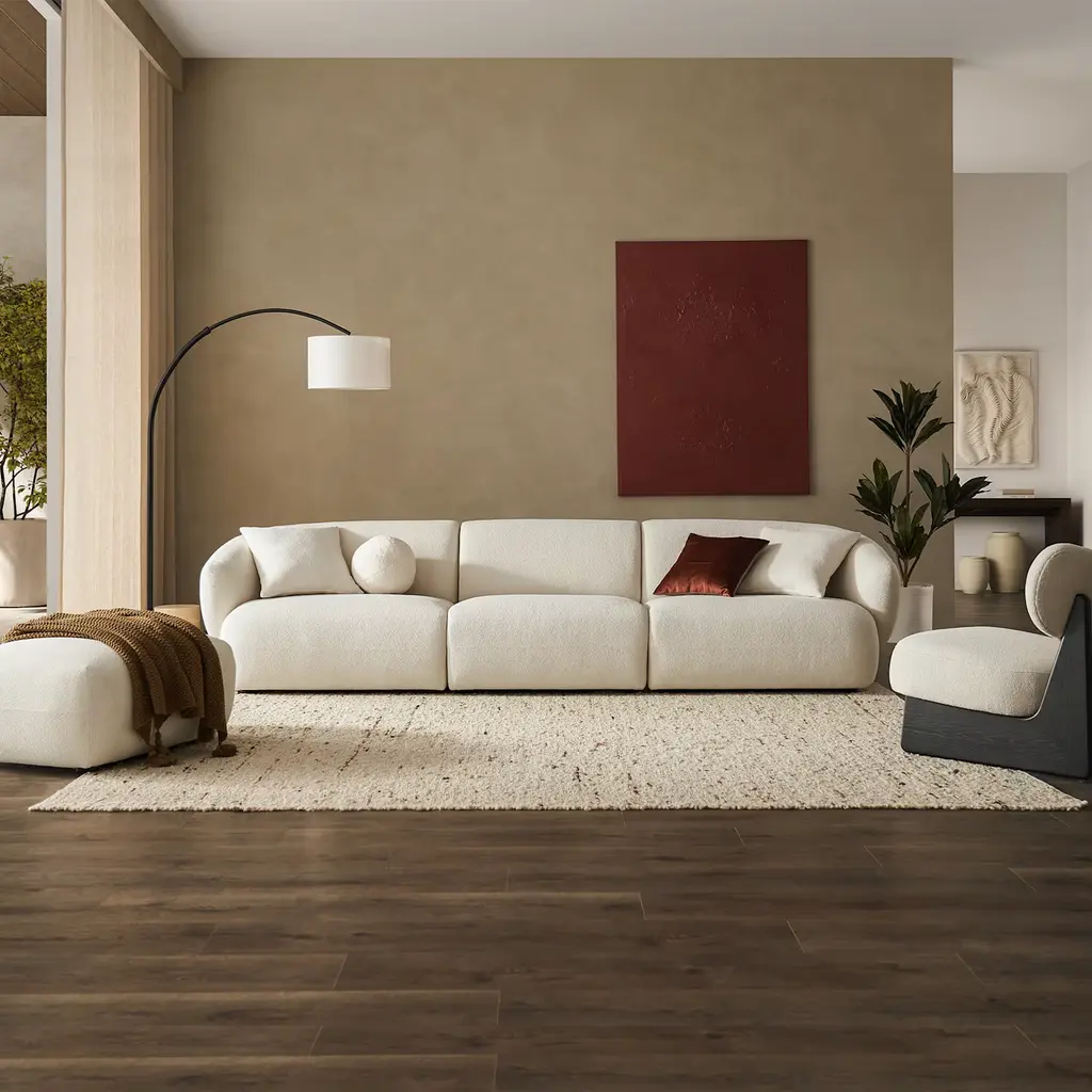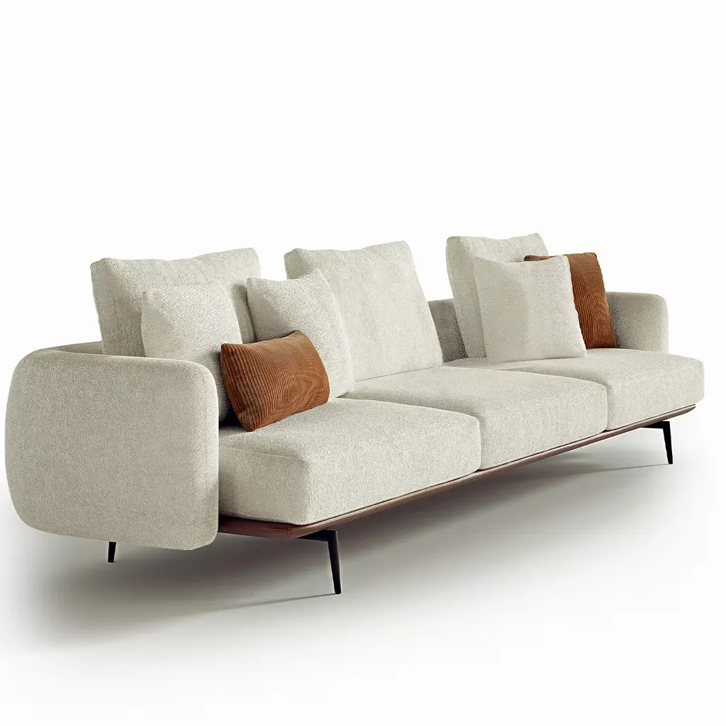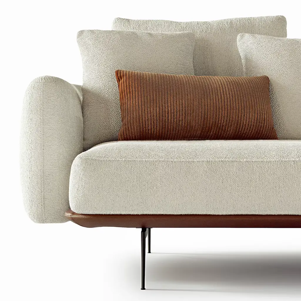 Modular sofa with wooden frame, polyurethane padding in different densities, and base covered in leather with stitching. The feet are in metal with a bronze-gold finish, also available in the lead and burnished finish. Upholstery available in fabric, leather, and nubuck. Decorative cushions are not included.