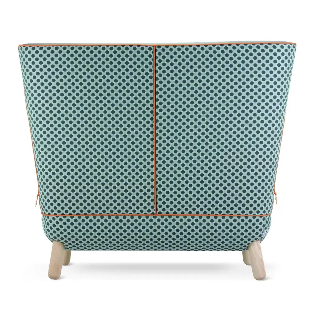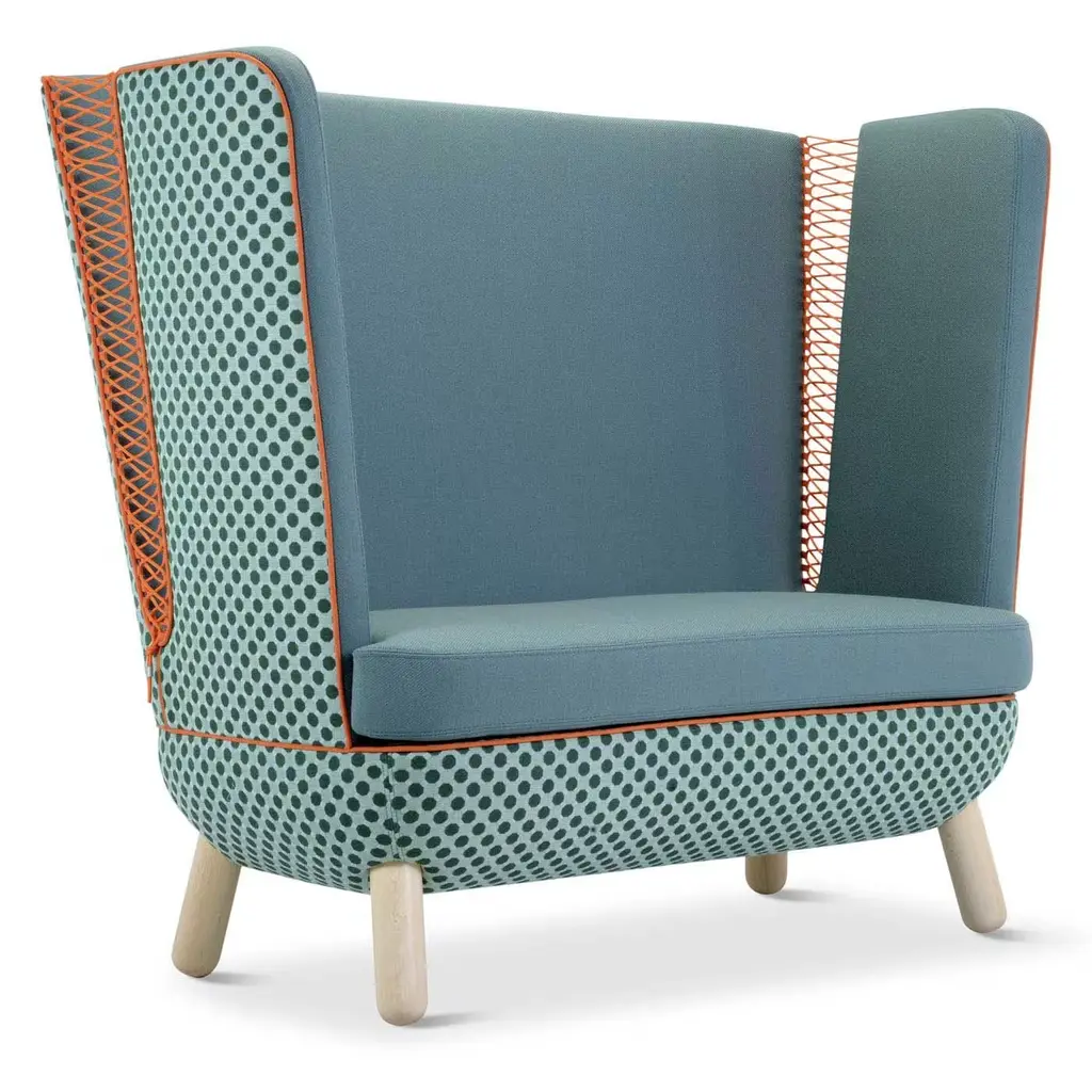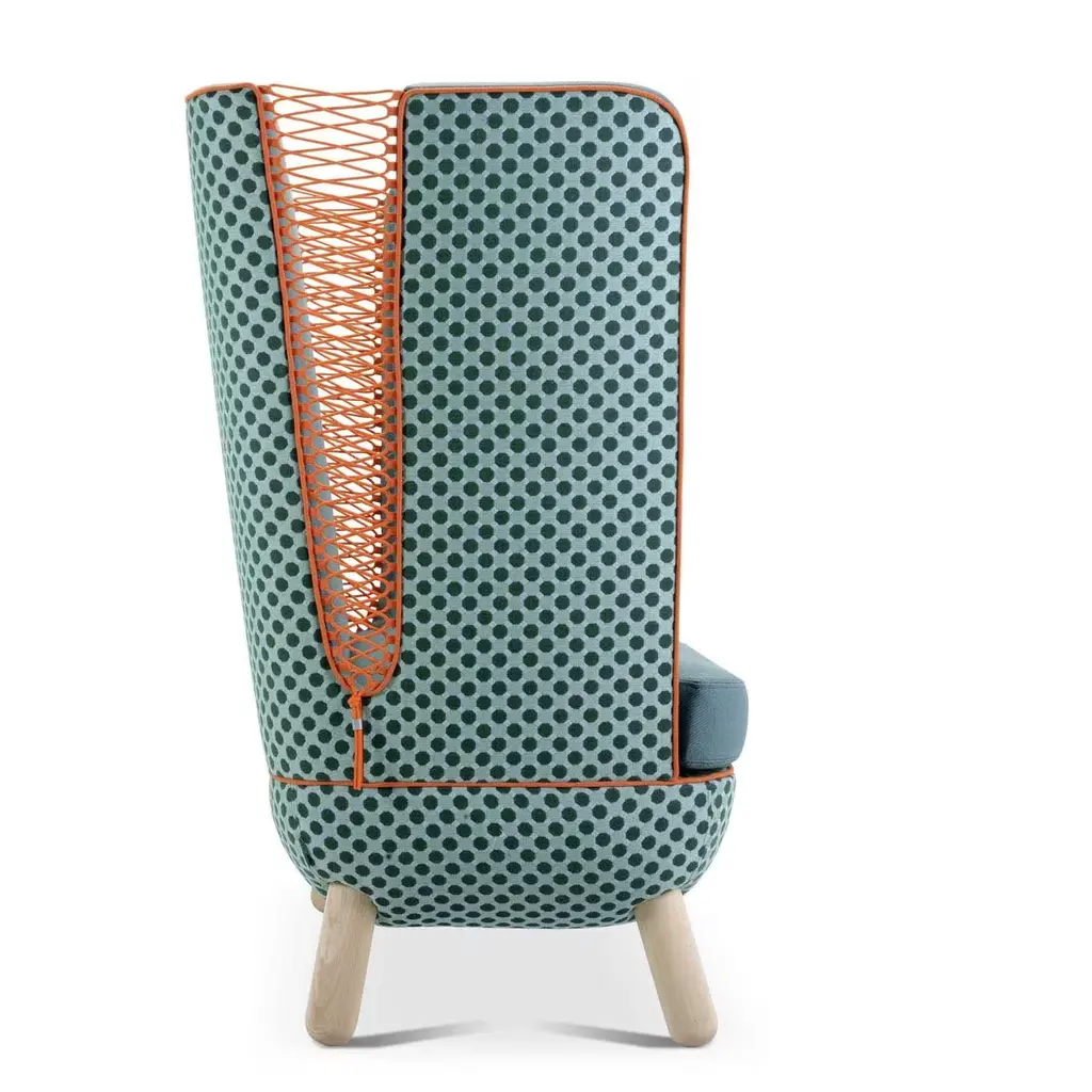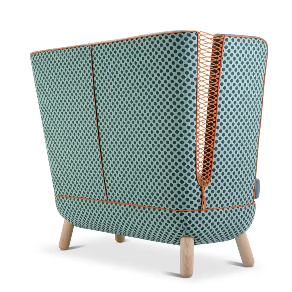 Perfect for any setting in the home or office, this sofa offers infinite possibilities for customization and combinations of upholstery, colors and finishes. The back, available in a high or low version, features slits closed with polypropylene cords of various colors. The legs in natural beech wood, also available in other finishes, match with the two-tone upholstery of the body, which is available in an array of colors.