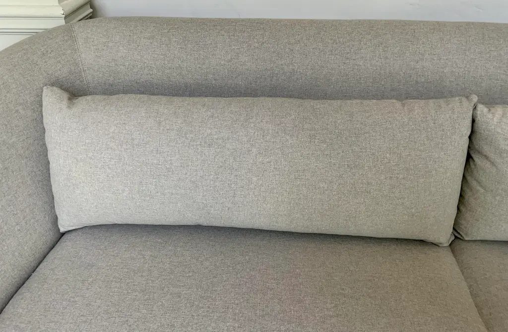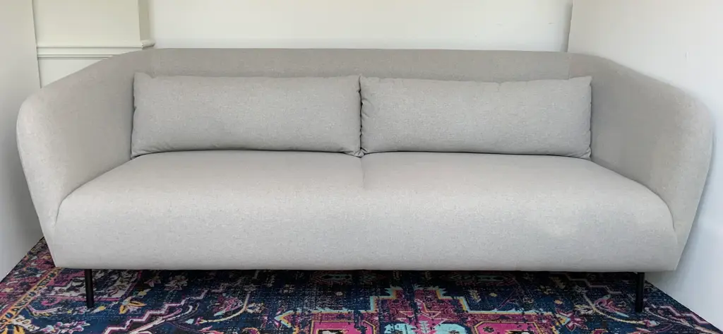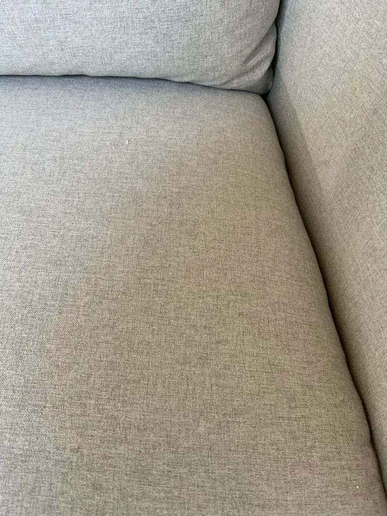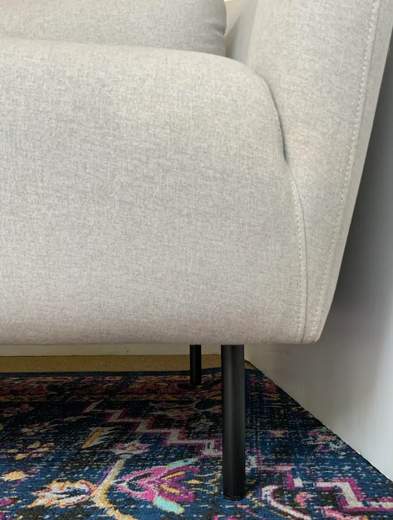 Stylish Small Modern Gray Performance Fabric Sofa, black metal legs, showroom floor sample