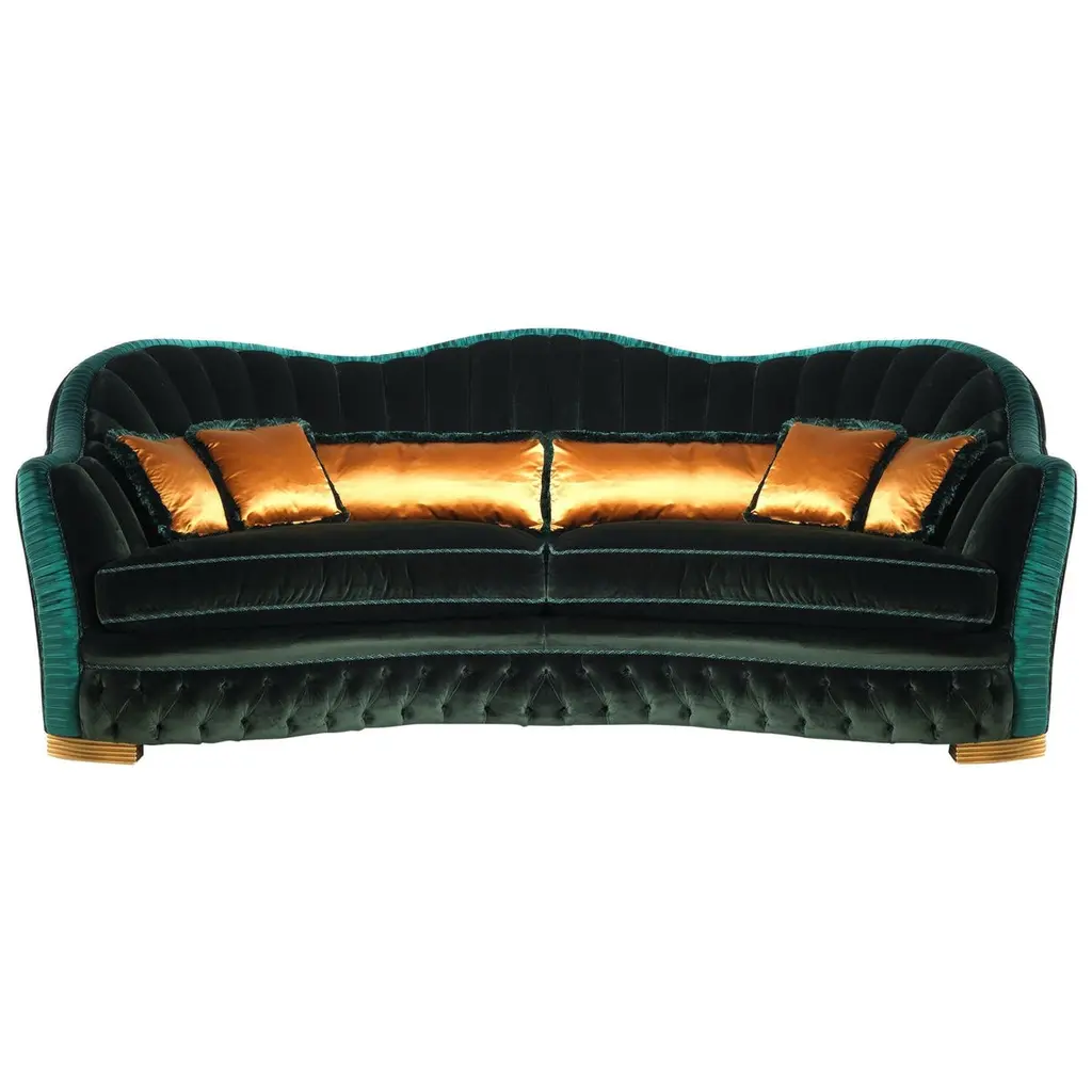 Smeraldo Italian Three-Seat Sofa With Carved Feet In Velvet & Satin By Zanaboni