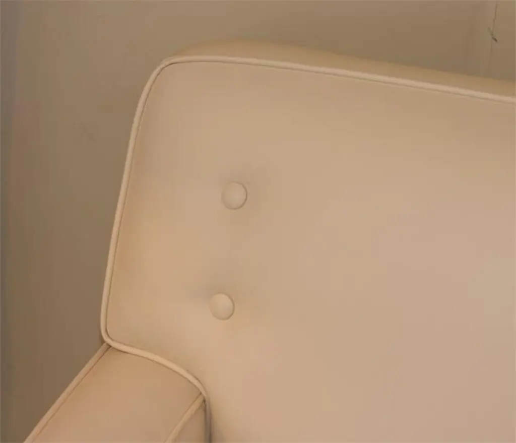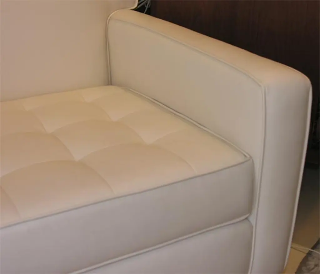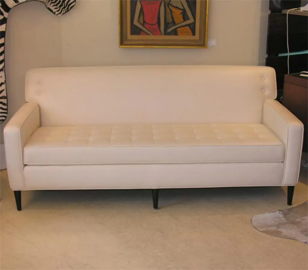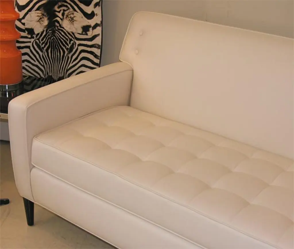 Reproduction of a Swedish, 1950s sofa. Ultra leather from Japan, (faux leather). 100 colors, washable, very durable. Production time is 8-9 weeks plus delivery. Custom sizes. Price $4500. Built in NJ.