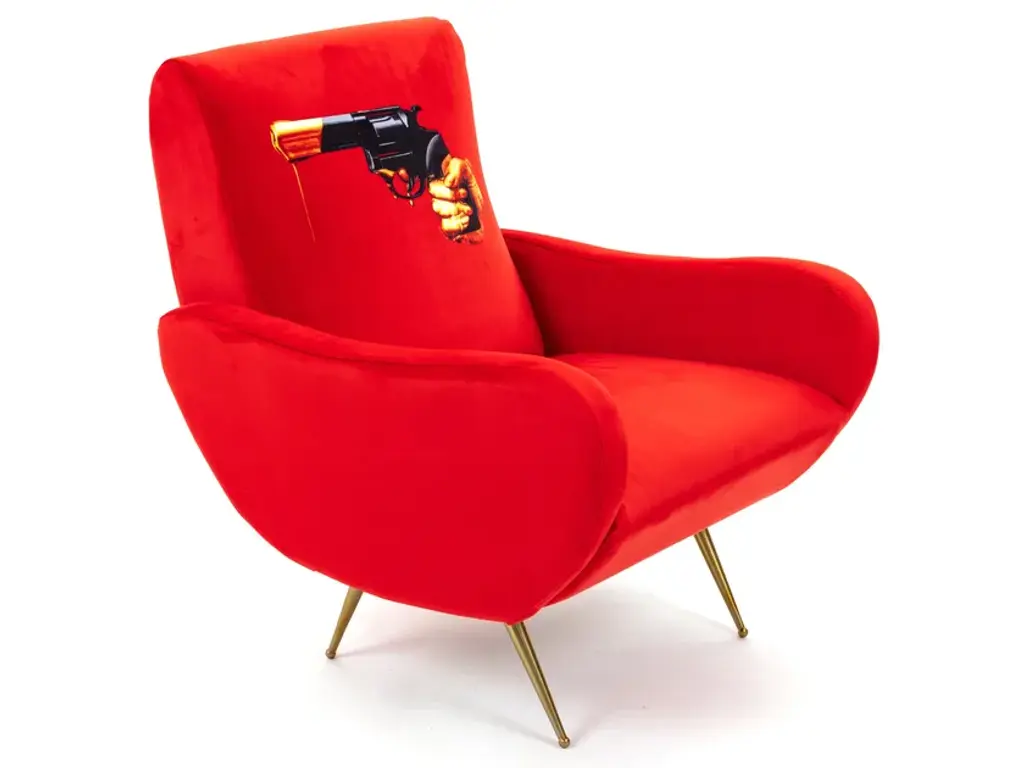 Your home should express your own creative spirit and love of artistic designs. The Seletti Sofa from the Toiletpaper collection is a perfect choice. Each design features a tongue in cheek image from the archive of photo-based publication Toiletpaper Magazine. Printed with a special technique on a quality fabric, the image is brightly colored and sharply detailed to create a focal point effortlessly. Apart from its bold appearance, the sofa is also made with a blend of high-quality materials. These include a wooden frame, brass legs, and a soft polyurethane padding for extra comfort. This Seletti Sofa is made in Italy. Complement this design with the other products from the Seletti Wears Toiletpaper collection.