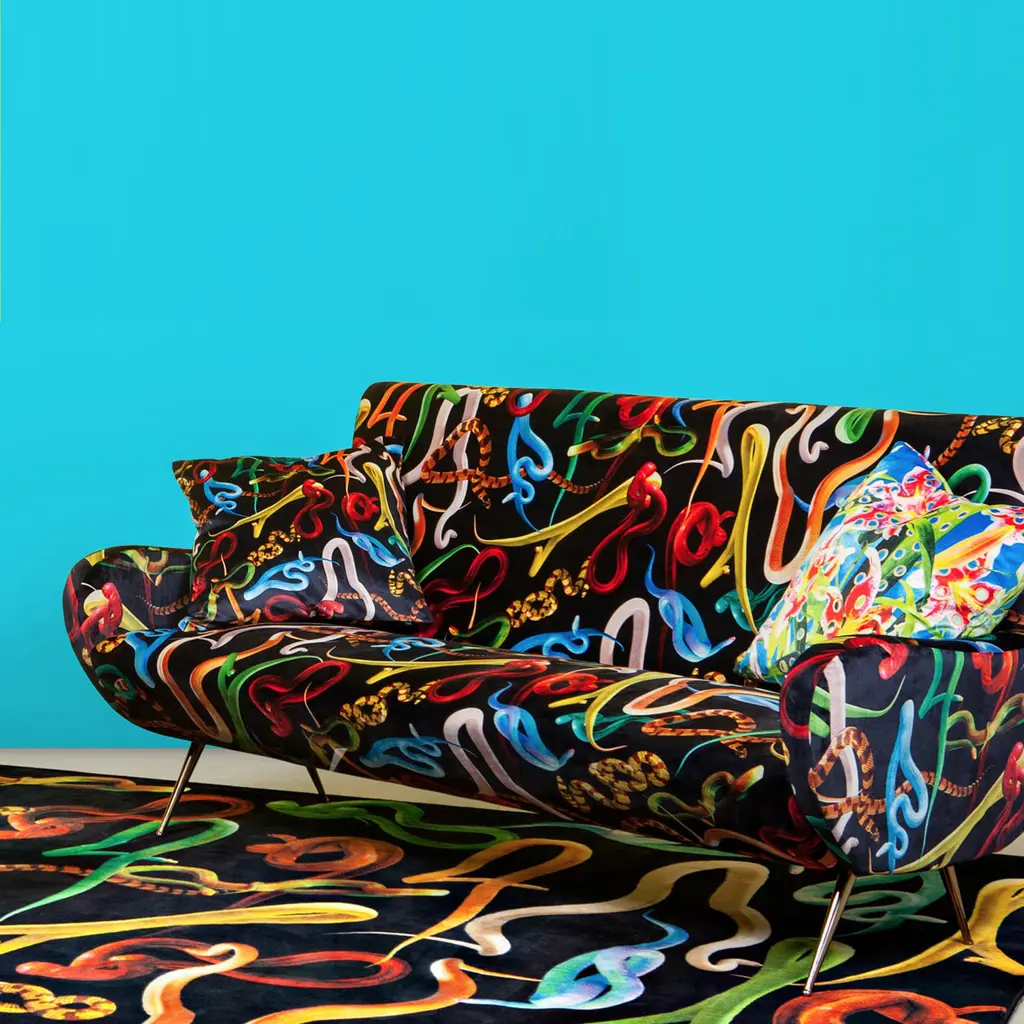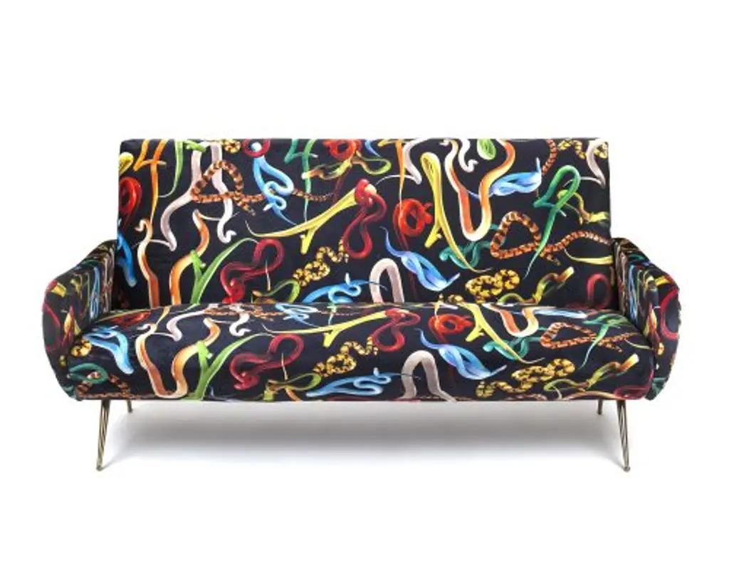 Your home should express your own creative spirit and love of artistic designs. The Seletti Sofa from the Toiletpaper collection is a perfect choice. Each design features a tongue in cheek image from the archive of photo-based publication Toiletpaper Magazine. Printed with a special technique on a quality fabric, the image is brightly colored and sharply detailed to create a focal point effortlessly. Apart from its bold appearance, the sofa is also made with a blend of high-quality materials. These include a wooden frame, brass legs, and a soft polyurethane padding for extra comfort. This Seletti Sofa is made in Italy. Complement this design with the other products from the Seletti Wears Toiletpaper collection.