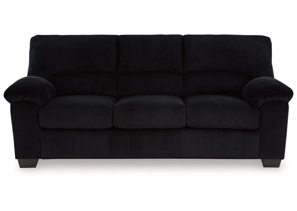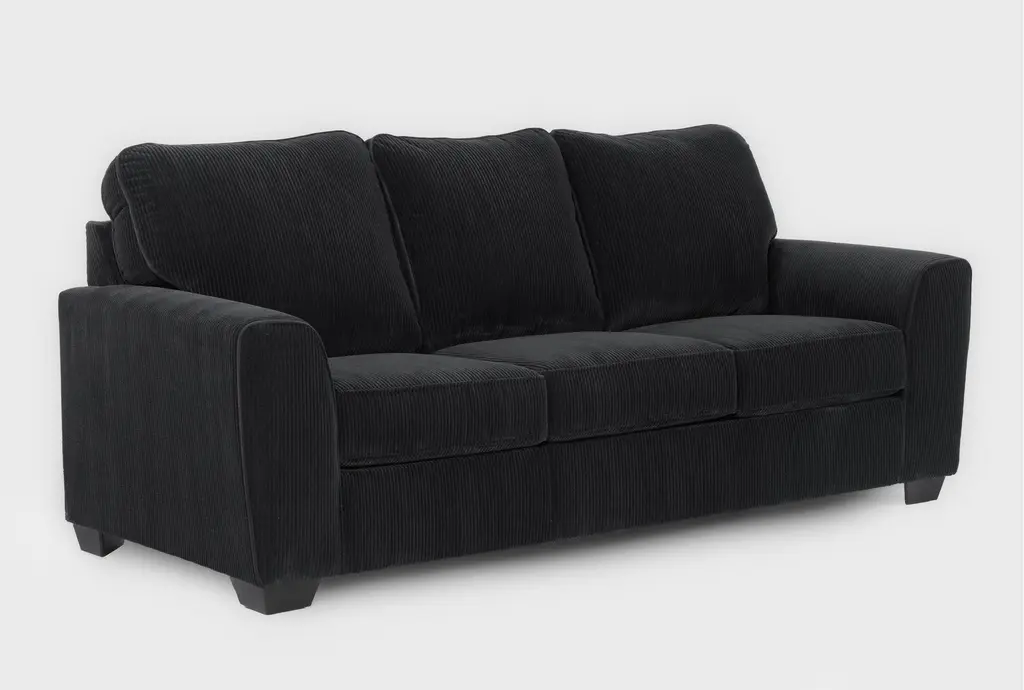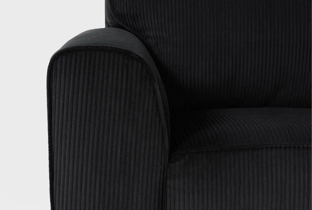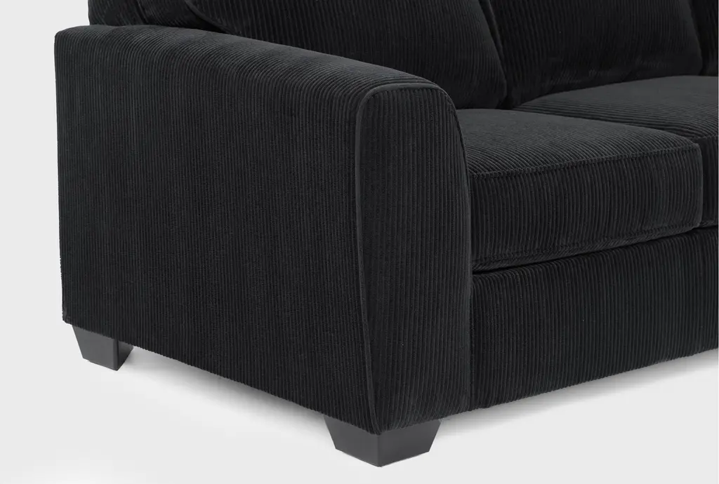 The Sofie Black Corduroy 90" Sofa is a perfect addition to your living room, combining casual style with exceptional comfort. Its oversized design and medium comfort level ensure ample seating space and relaxation for you and your guests. The black corduroy fabric offers a timeless and sophisticated look, ideal for various interior themes.