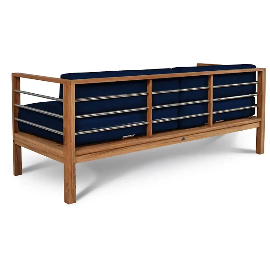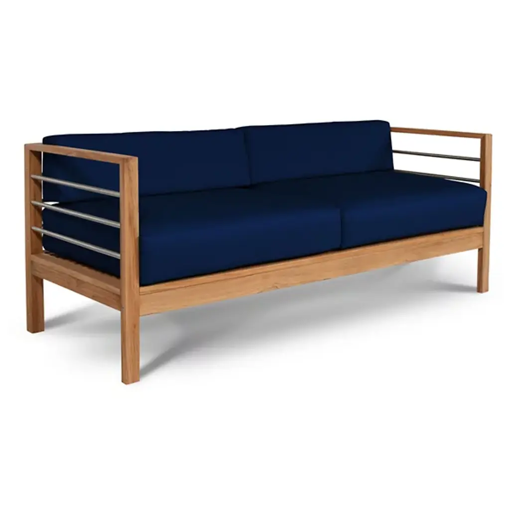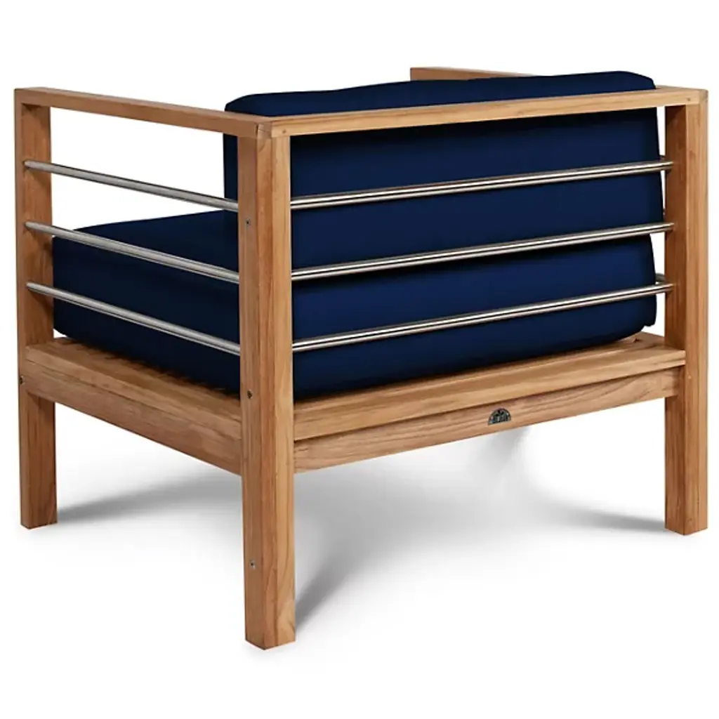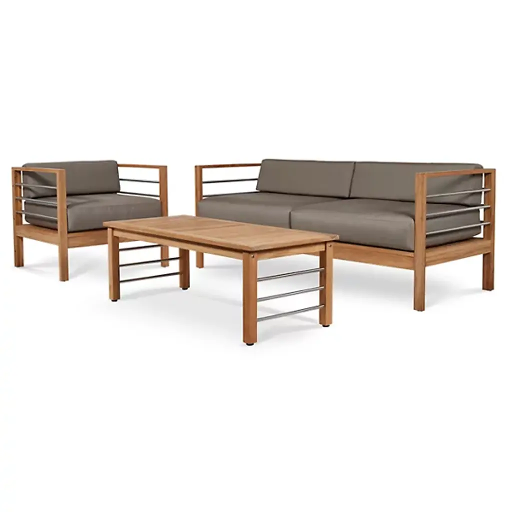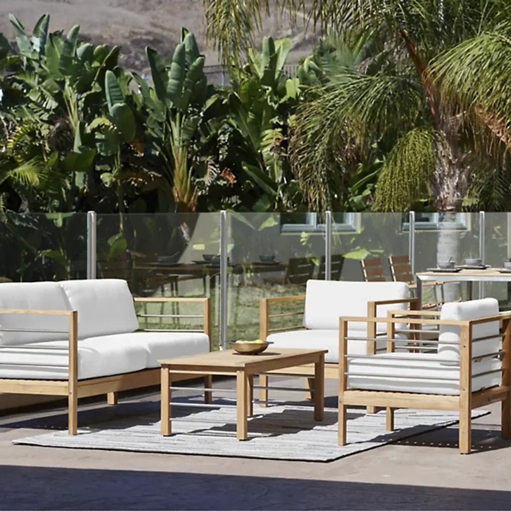 The SoHo 4-Piece Outdoor Deep Seating Sofa Set from HiTeak Furniture is both pleasant on the eyes and on the body as a clean, airy design. The set’s geometry matches up with the straight edges of the contemporary home. Its seating gets the eyes scanning in every direction with sharp lines made from both teak wood and steel. The teak wood foundation stands the forces of mother nature for year-round use. Deep cushions hug the back and the lower body to offer a true lounging experience. Subrella fabric wrapping the cushions keeps its color and soft feel even after bouts in the sun. The table provided takes in plenty of refreshments over its elegant linear design.
