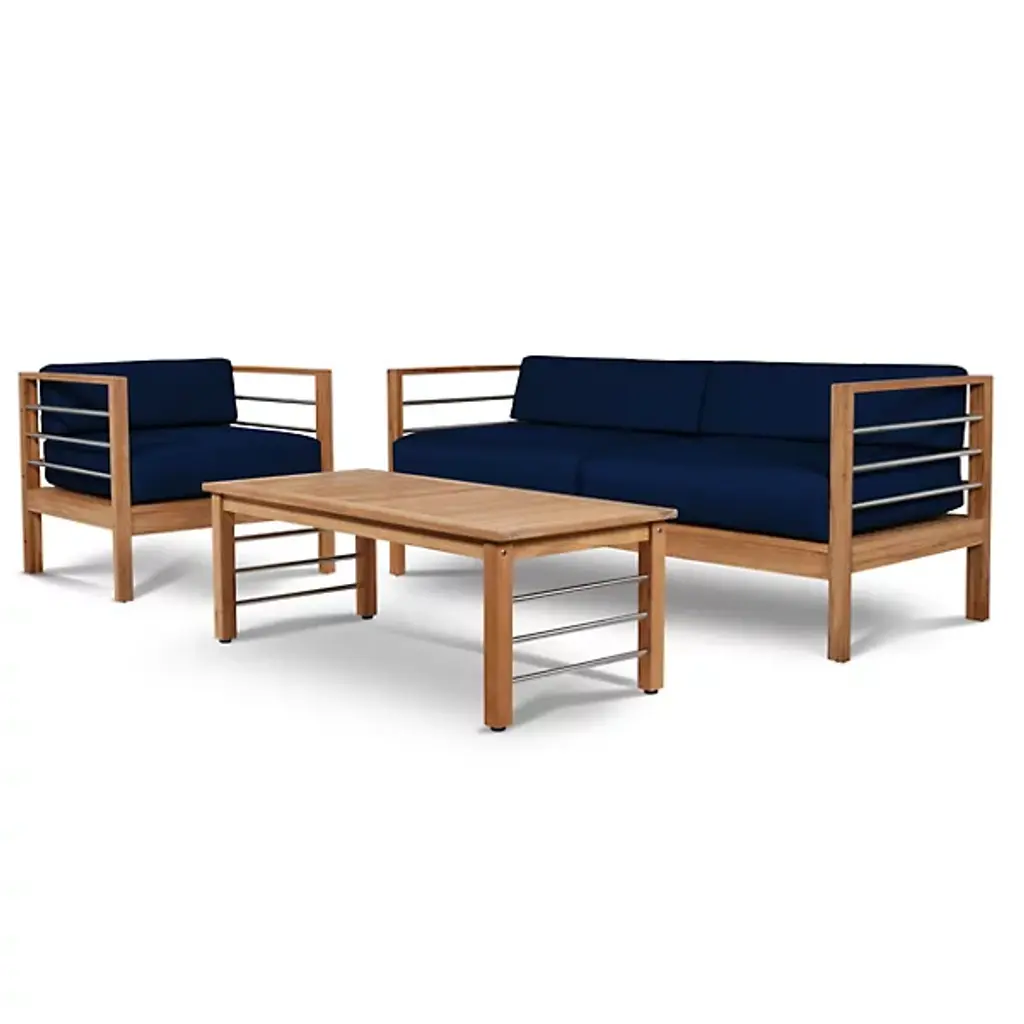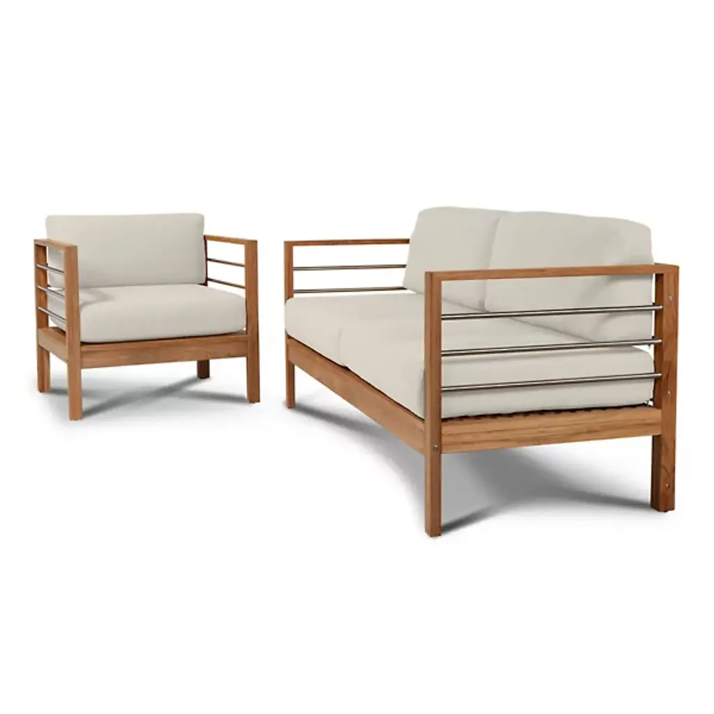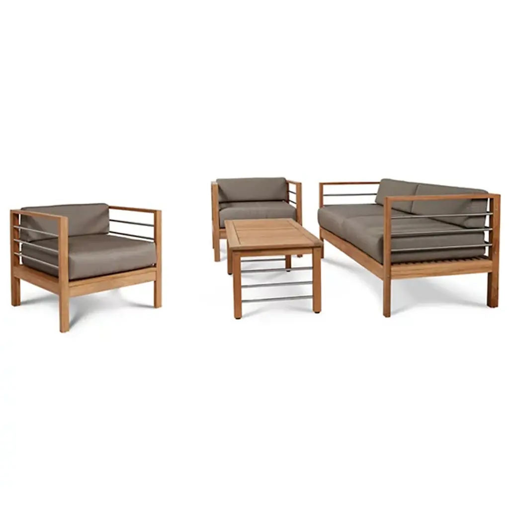 The SoHo 4-Piece Outdoor Deep Seating Sofa Set from HiTeak Furniture is both pleasant on the eyes and on the body as a clean, airy design. The set’s geometry matches up with the straight edges of the contemporary home. Its seating gets the eyes scanning in every direction with sharp lines made from both teak wood and steel. The teak wood foundation stands the forces of mother nature for year-round use. Deep cushions hug the back and the lower body to offer a true lounging experience. Subrella fabric wrapping the cushions keeps its color and soft feel even after bouts in the sun. The table provided takes in plenty of refreshments over its elegant linear design.
