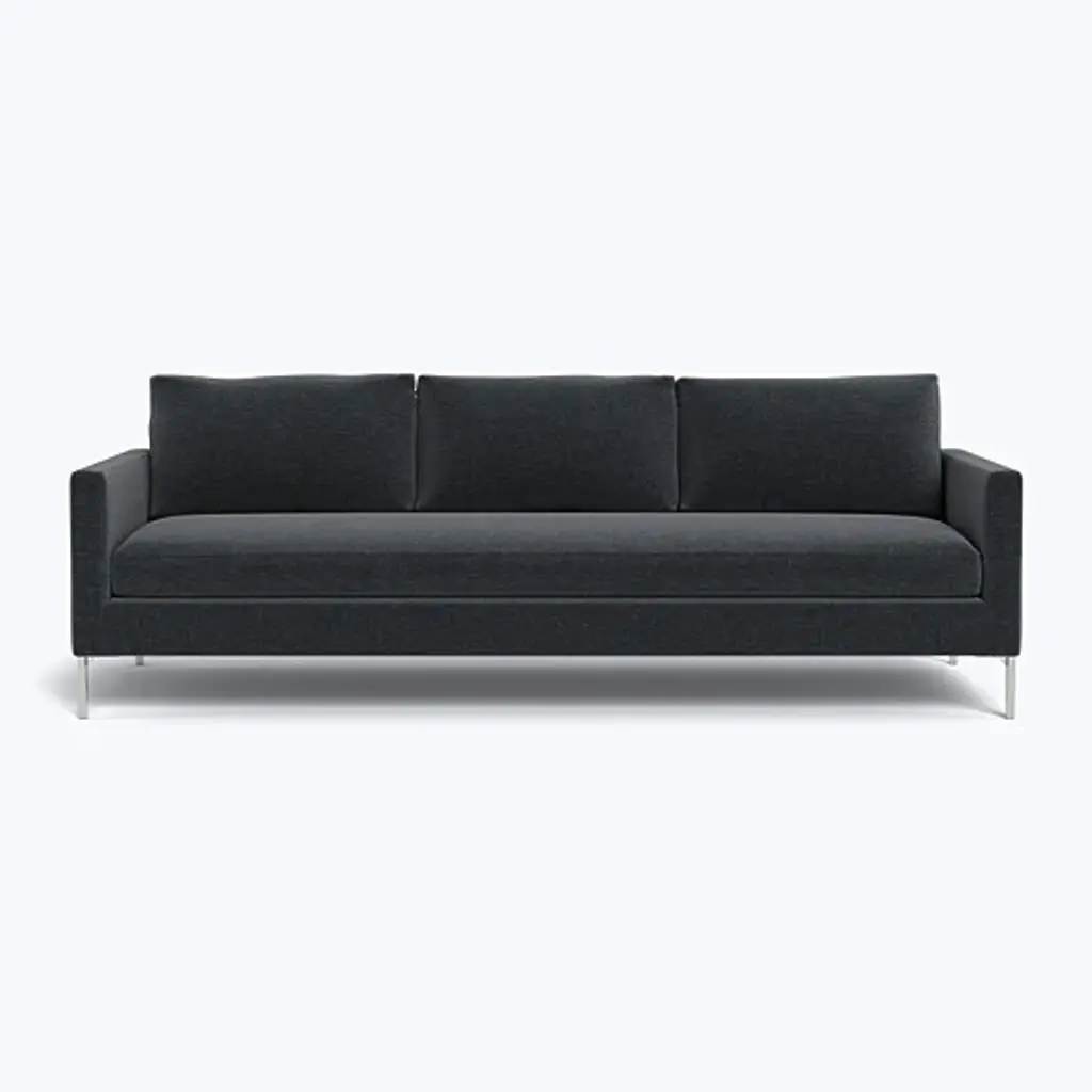 The 91" Soho Sofa, exclusively from ABC Carpet & Home, embodies the chic sophistication and modern elegance of New York’s trendy Soho neighborhood. Its sleek, low-profile design and spacious bench seat make it a standout centerpiece for any living room, adding an upscale touch to your home. Available with either brass or steel legs, the Soho Sofa offers a customizable look that complements a range of interior styles, from contemporary to modern. Built with sustainability in mind, the Soho Sofa is constructed on a durable, eco-conscious Goodwood frame. The cushion cores are made from eco-friendly foam derived from sustainable, plant-based materials and wrapped in a soft blend of feather and down, offering an unparalleled seating experience that balances comfort with firm support. This thoughtful combination ensures that the sofa is not only stylish but also incredibly comfortable for everyday lounging or entertaining guests. Choose from our in-stock fabrics or select from over 80+ custom fabric options. Whether you opt for bold jewel-tone velvets like Vance to create a striking focal point, durable performance fabrics for pet- and family-friendly use, or elevate the design with Libico linen for a sleek, refined look, this sofa can be tailored to your specific style and needs. Handcrafted to perfection, the Soho Sofa will be delivered to your home within 8-10 weeks, providing a seamless, high-quality experience from start to finish. Designed to fit effortlessly into a variety of living spaces, the 91" Soho Sofa is ideal for those who value both style and practicality. Its clean lines, generous seating, and customizable features make it a versatile piece that works equally well in large, open living rooms or more intimate spaces. Complete the look by pairing the 91" Soho Sofa with other pieces from the Soho collection, such as the lounge chair or the 64" loveseat. The collection offers endless possibilities for creating a cohesive, modern living area that reflects your personal style and delivers the ultimate in comfort and design